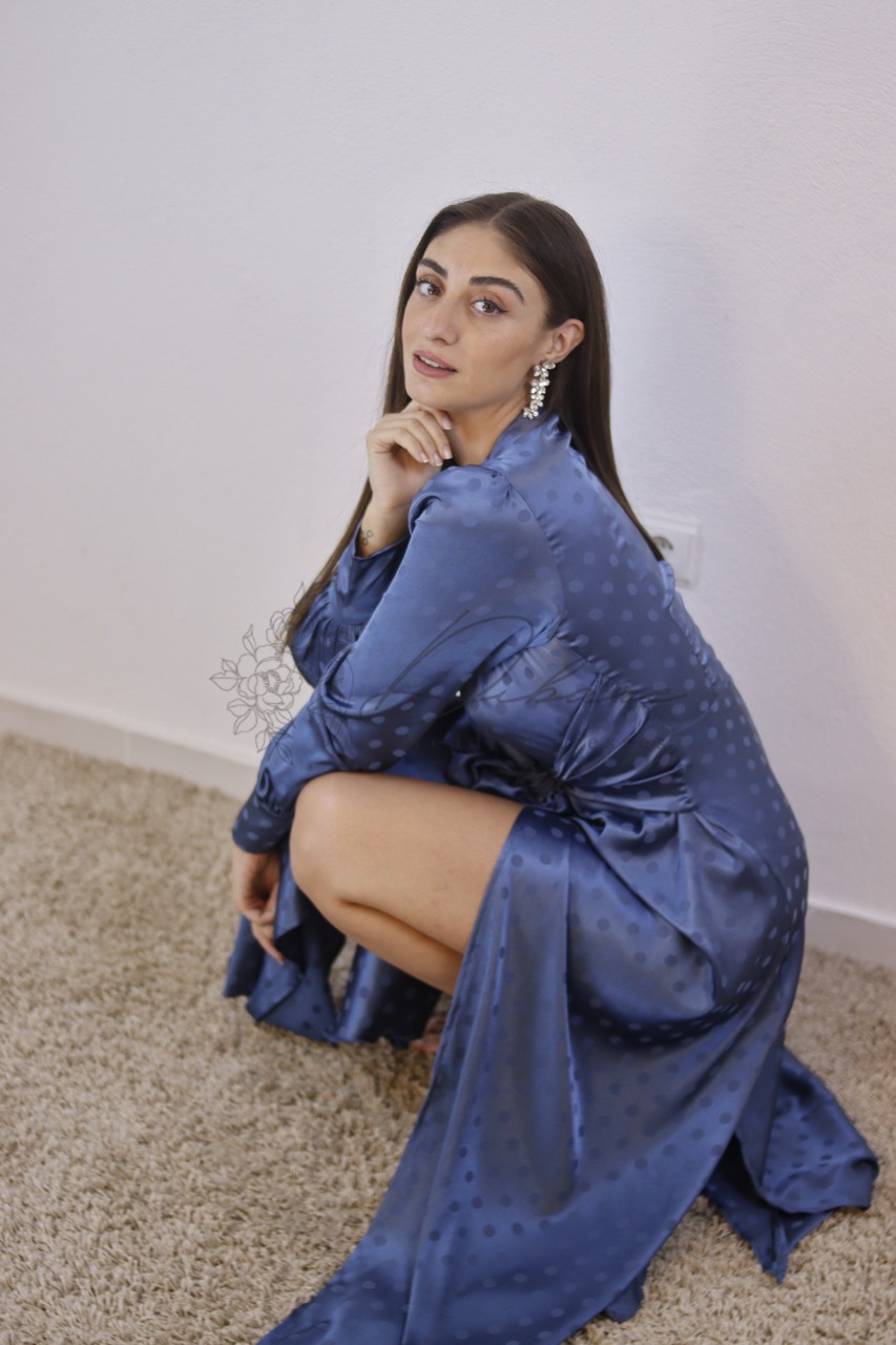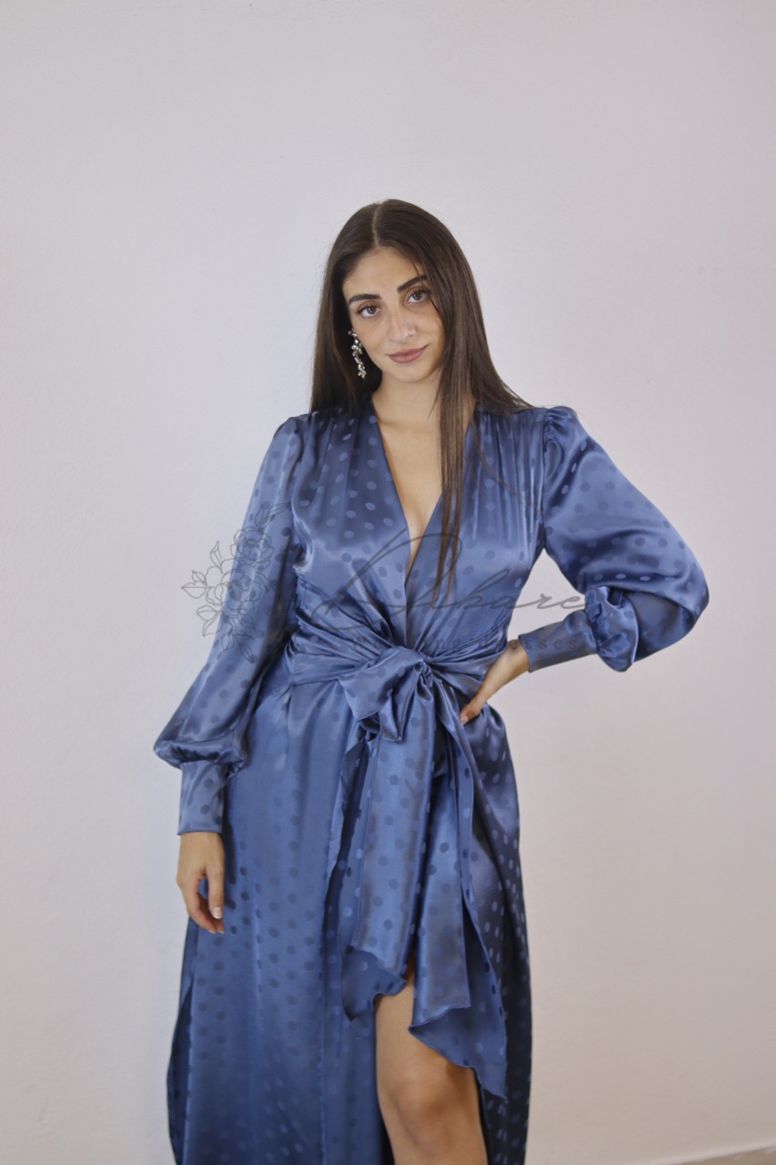 Este deslumbrante vestido longo em um tom azul profundo e sofisticado é a peça ideal para quem busca elegância e glamour em ocasiões especiais. Confeccionado em um tecido acetinado que proporciona um caimento fluído e um brilho sutil, ele apresenta uma estampa delicada e discreta que adiciona textura e riqueza visual à peça. O design estilo envelope com amarração na cintura realça a silhueta de forma feminina e ajustável. As mangas longas bufantes, com punhos bem definidos, adicionam um toque romântico e moderno. O decote em V profundo e a fenda frontal sutilmente reveladora garantem um visual poderoso e sedutor na medida certa.