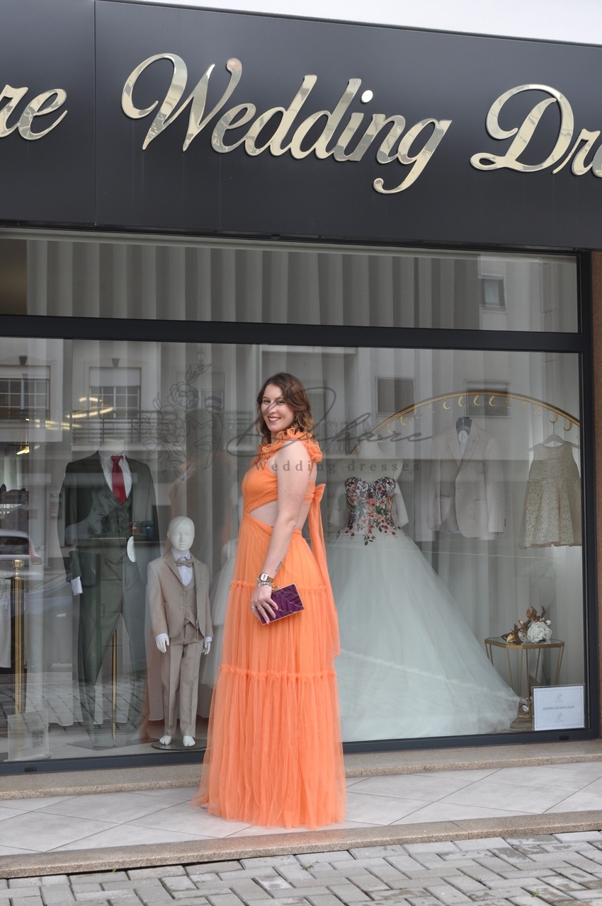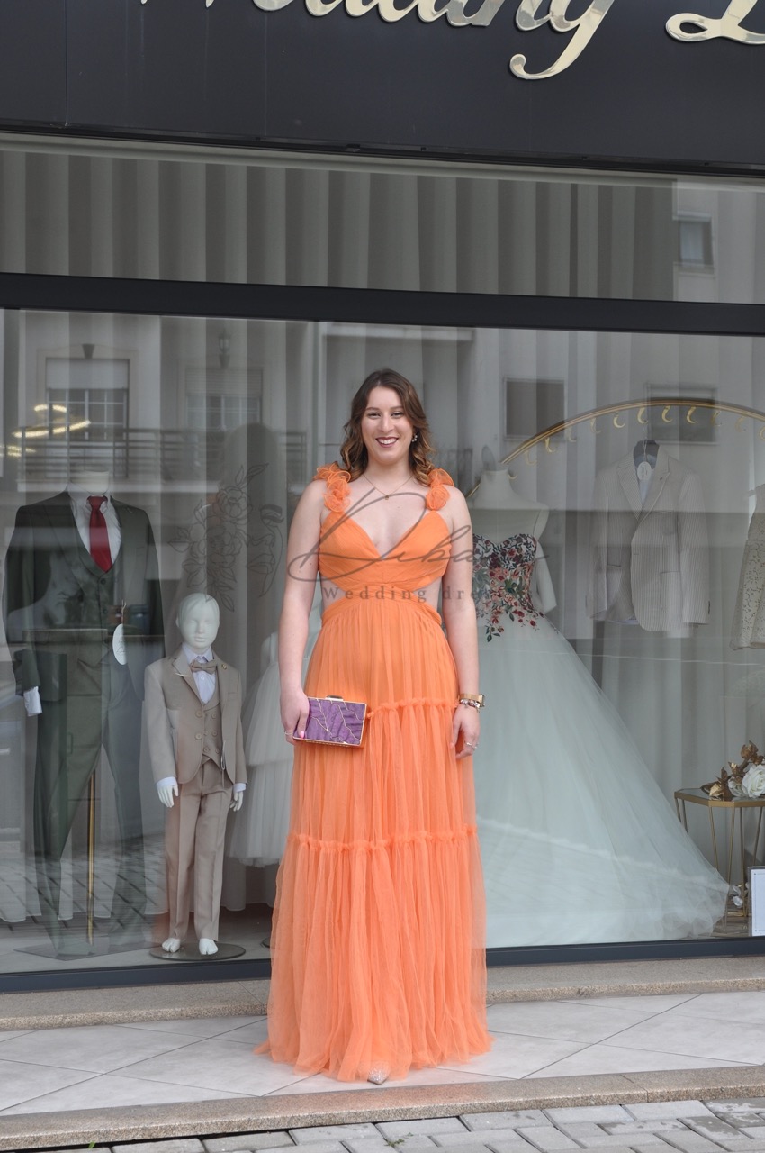Prepare-se para brilhar com este esplêndido vestido longo em um vibrante tom de laranja queimado, que evoca a energia do pôr do sol. Este modelo é a escolha perfeita para quem deseja um look ousado e inesquecível. O corpete apresenta um decote profundo em V e detalhes de tiras que se cruzam, complementados por recortes laterais estratégicos que realçam a cintura e adicionam um toque de sensualidade moderna. A saia, fluida e esvoaçante, é confeccionada em camadas de tule leve, proporcionando movimento e um volume etéreo que cai elegantemente até ao chão.