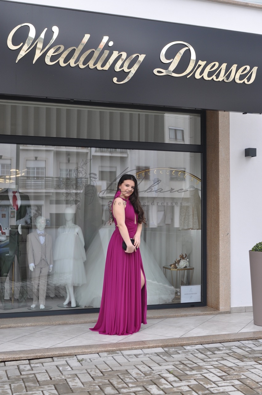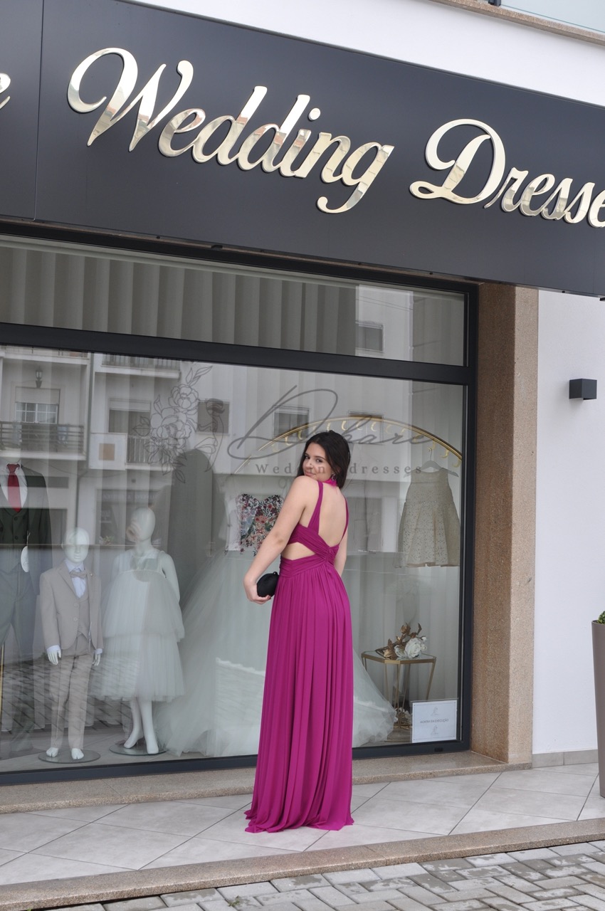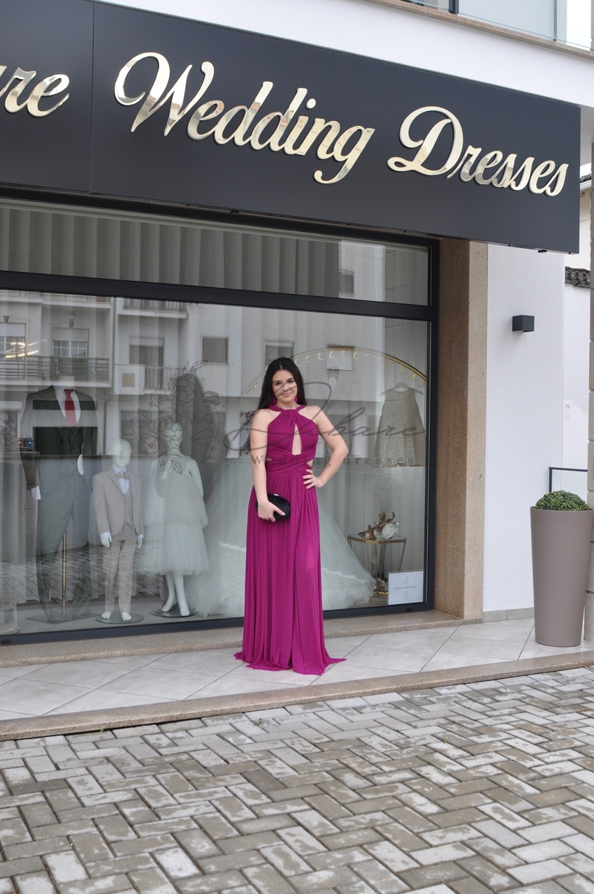 Este vestido de festa é uma peça de alto impacto, projetada para a mulher que deseja irradiar confiança e sofisticação em qualquer evento noturno, como casamentos, galas ou eventos de black-tie. O vestido destaca-se pela sua cor fúcsia rica e vibrante, um tom que garante que a utilizadora não passará despercebida. É confecionado num tecido fluído e leve que oferece um caimento esvoaçante e um movimento elegante a cada passo, graças à sua saia longa e volumosa. O design do corpete é o ponto focal da peça: apresenta um decote tipo corte halter alto, com uma abertura keyhole estratégica ao centro do peito. Múltiplas tiras finas cruzam-se elegantemente na zona do decote e ombros, conferindo um toque ousado e moderno. A cintura é bem marcada, acentuando a silhueta, de onde a saia cai suavemente em pregas verticais, alongando visualmente a figura.