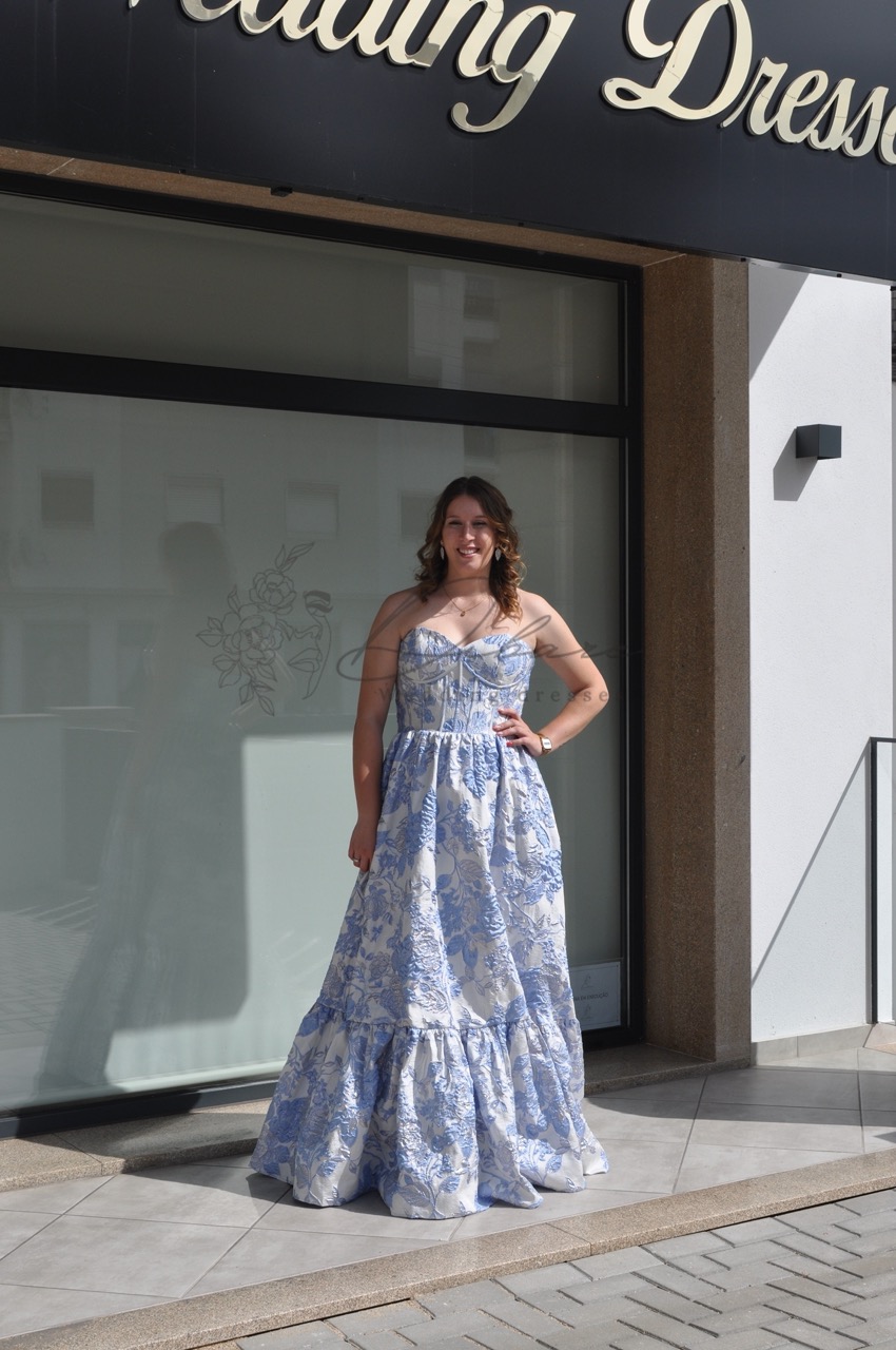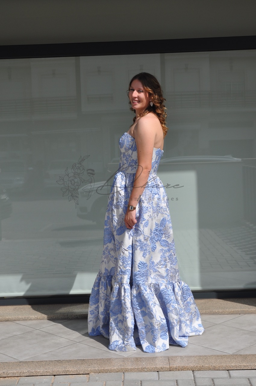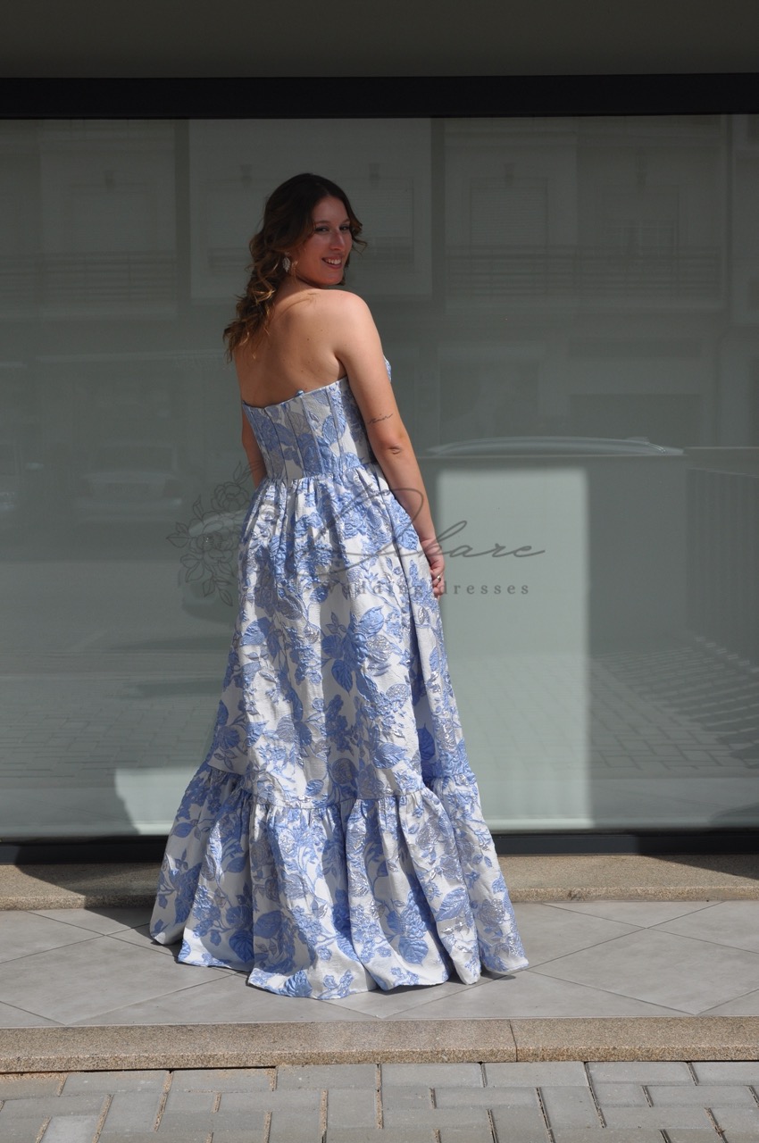 Este deslumbrante vestido longo é a personificação da elegância campestre e do romance intemporal. Apresenta uma silhueta fluida e esvoaçante, perfeita para eventos diurnos ou noturnos que exijam um toque de sofisticação descontraída. O tecido leve é adornado com um encantador padrão clássico de toile de jouy, combinando tons vibrantes de azul cobalto com um fundo branco imaculado. Este motivo histórico confere à peça uma estética vintage e requintada. O design destaca-se pelo seu decote coração ou semi-coração, que realça subtilmente o colo e o busto. A parte superior, justa e estruturada que garantem conforto e um ajuste perfeito. A cintura é marcada de forma lisonjeira, de onde a saia cai em cascatas de tecido. A saia é o ponto alto do vestido, apresentando um volume generoso e um acabamento em babado (ou ruffle) na bainha, adicionando movimento dramático e um toque de alegria a cada passo.