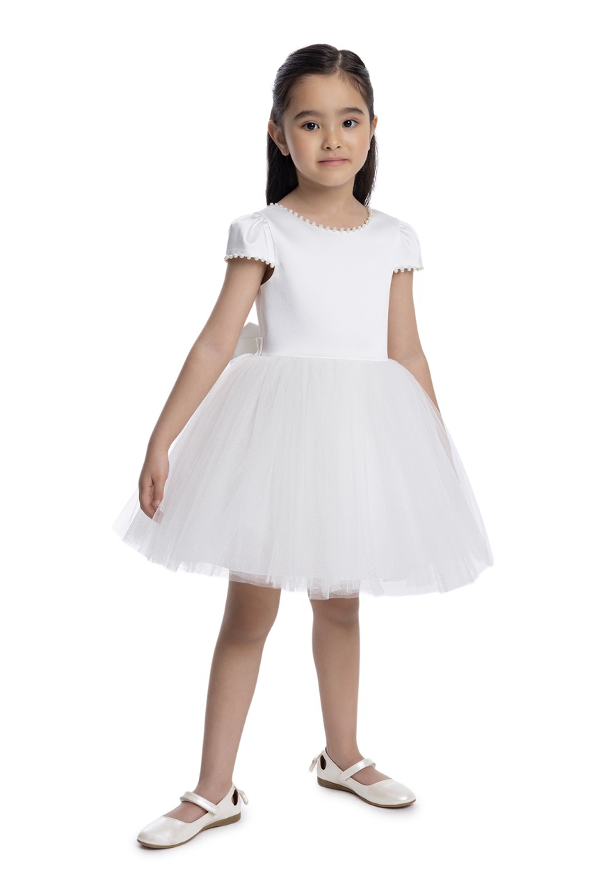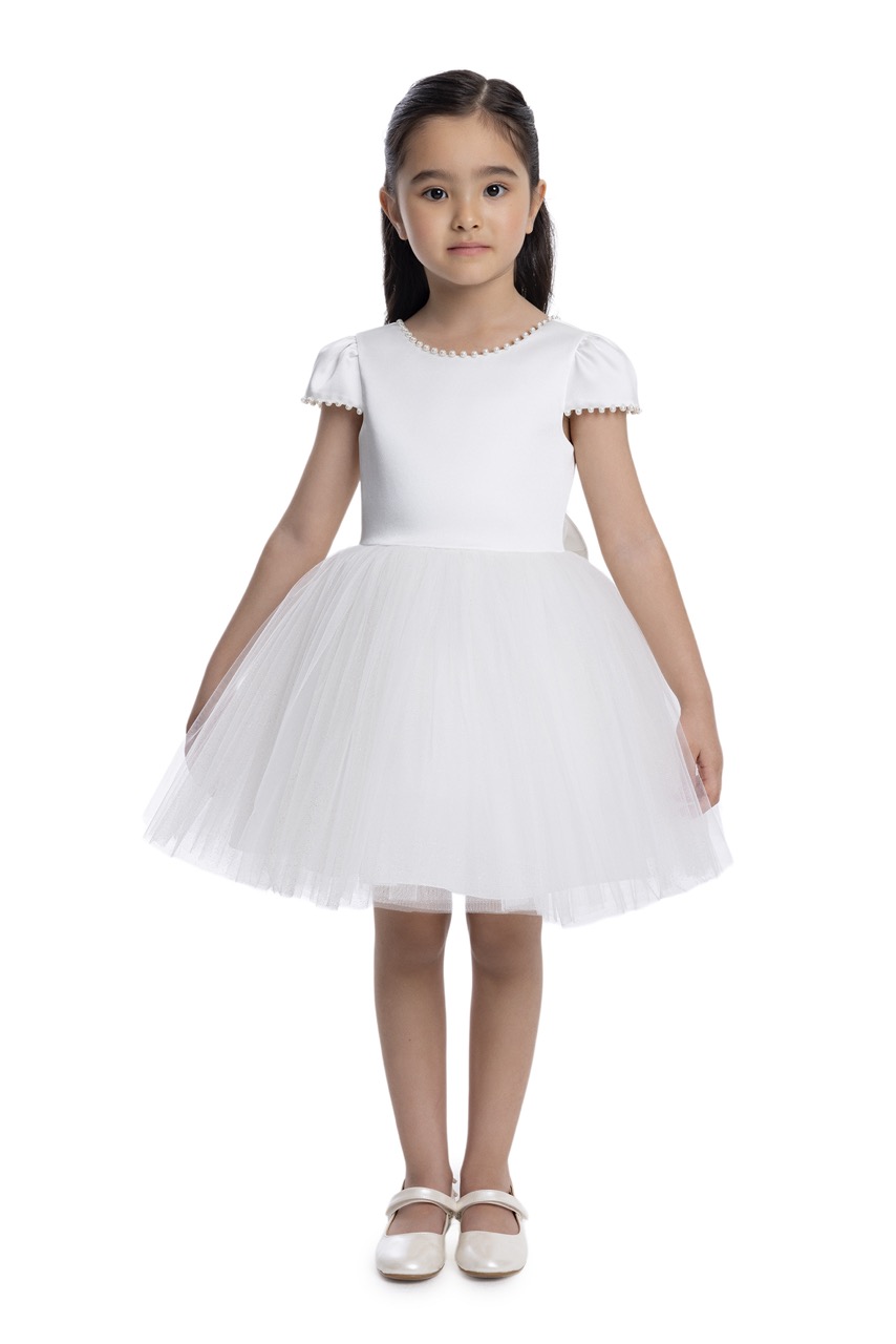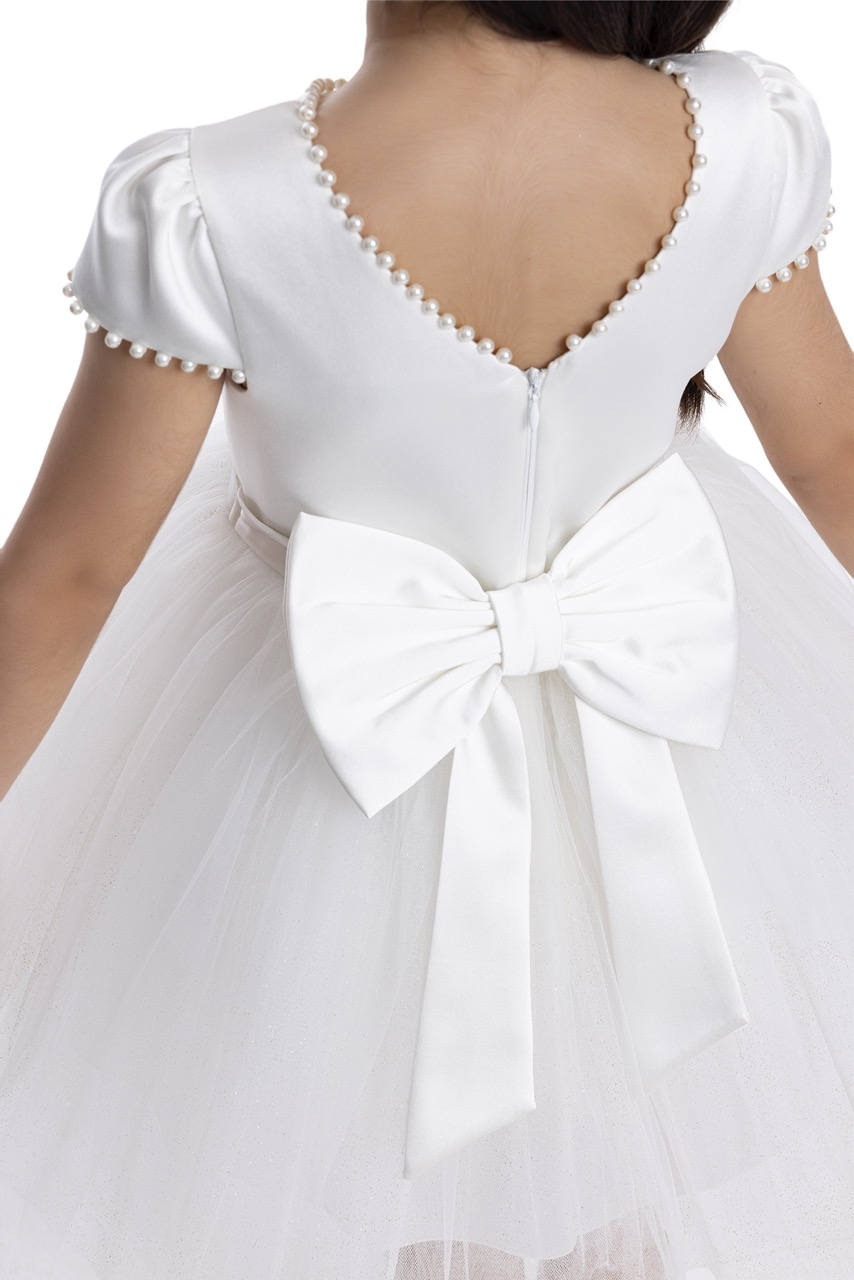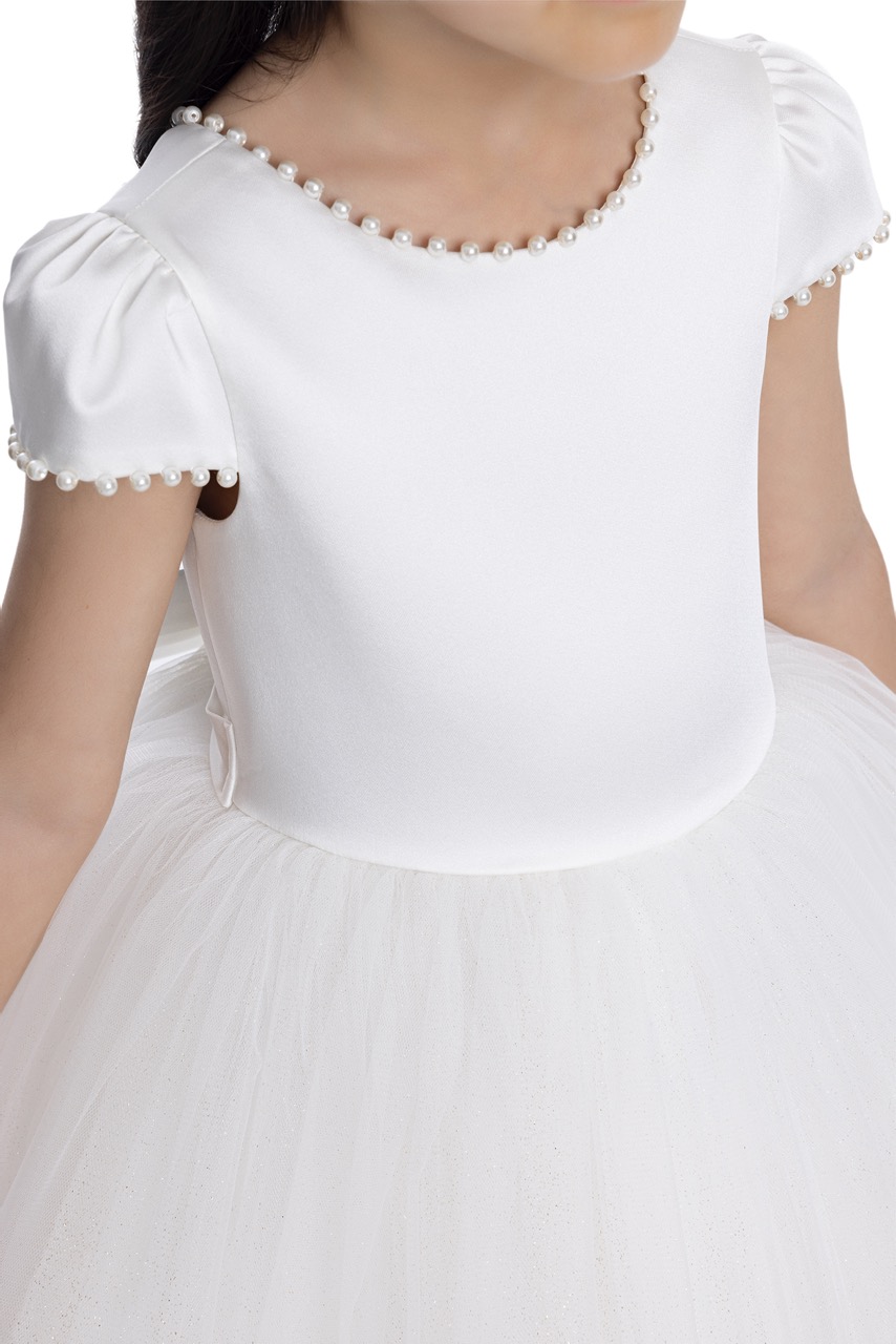 Este vestido é a definição de elegância na simplicidade, perfeito para batizados, comunhões ou como vestido de dama de honra em casamentos. Disponível para as idades dos 2 aos 7 anos, este modelo apresenta um design clean e clássico, com um corpete liso e mangas curtas delicadamente detalhadas. A peça combina um corpo de algodão suave com uma saia volumosa em tule em camadas, que confere um movimento leve e etéreo, evocando o estilo de bailarina. O visual simples da frente é contrastado por um toque de charme na parte de trás: um delicado laço nas costas que adiciona um toque final de ternura e requinte. Este é um vestido confortável e versátil, ideal para momentos inesquecíveis. Disponível para encomenda no nosso atelier na Sertã.