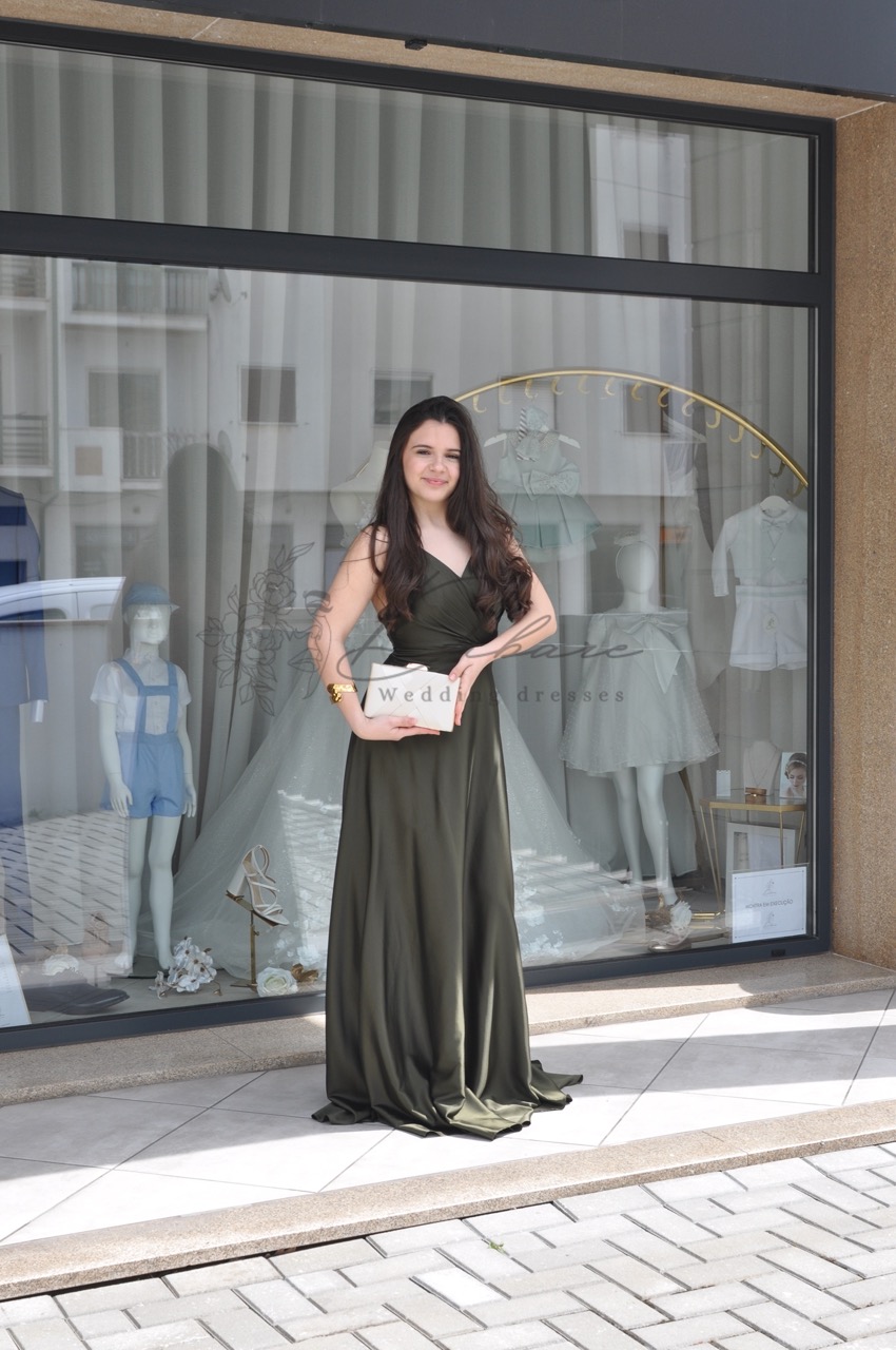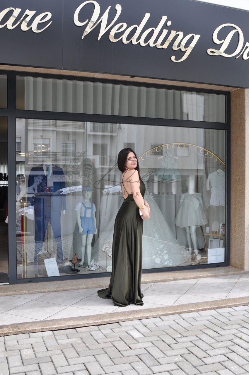 Deixe-se envolver pela sofisticação atemporal e pelo caimento impecável do nosso Vestido Longo. Concebido na tendência e versátil tonalidade kaki/verde-oliva, este modelo é a escolha perfeita para eventos formais, casamentos ou galas, onde a elegância é fundamental. O vestido apresenta um decote em V delicado, sustentado por alças finas que cruzam as costas de forma subtil, conferindo um charme extra e realçando a feminilidade. A silhueta é definida na cintura e abre-se numa saia longa e fluida, caindo em suaves pregas até ao chão. O tecido leve e com movimento cria uma sensação de leveza etérea ao caminhar, garantindo que se sentirá tão confortável quanto deslumbrante.
