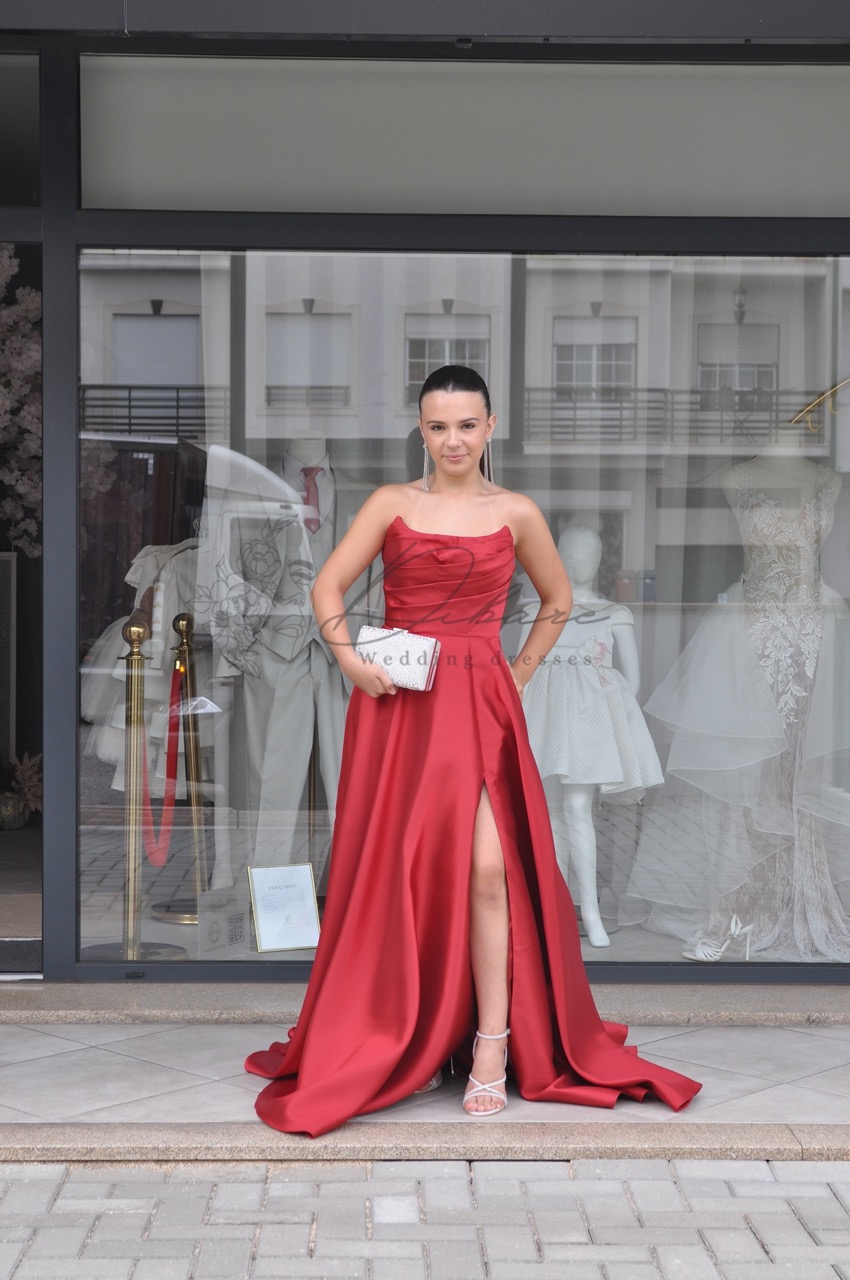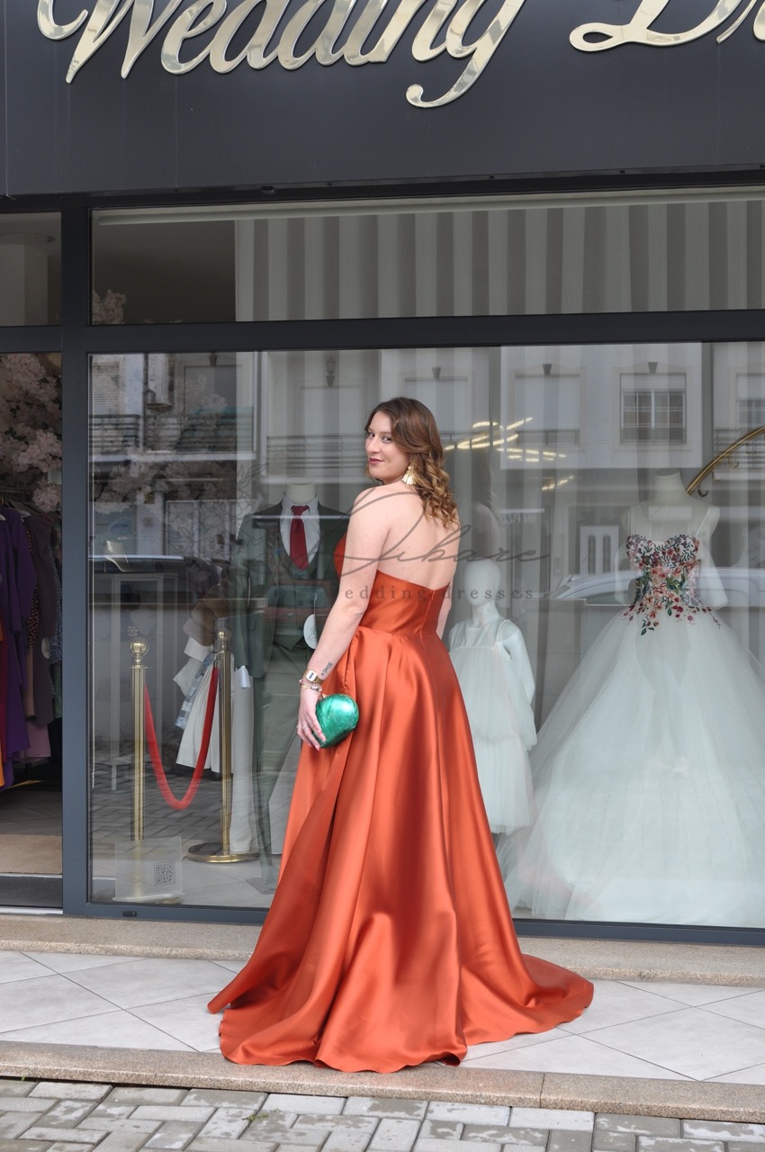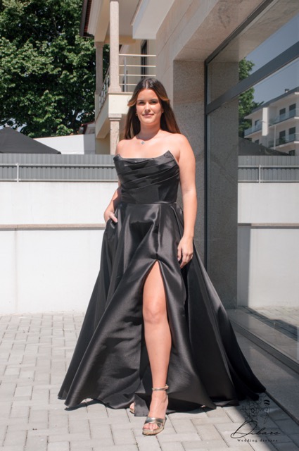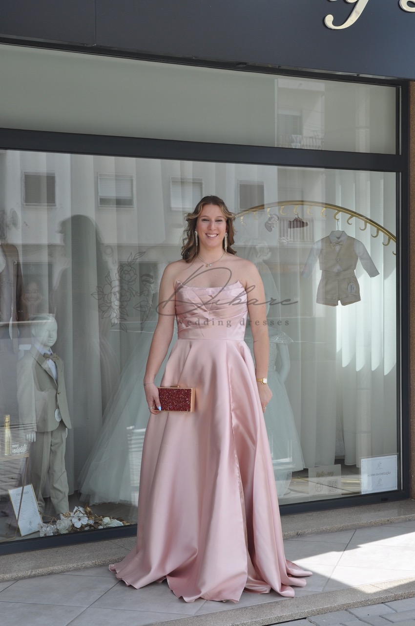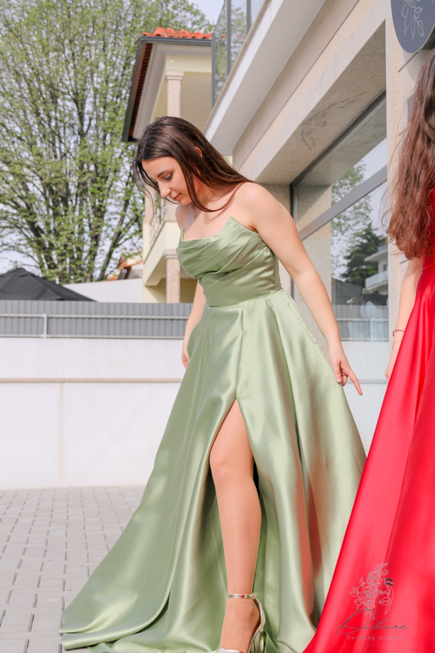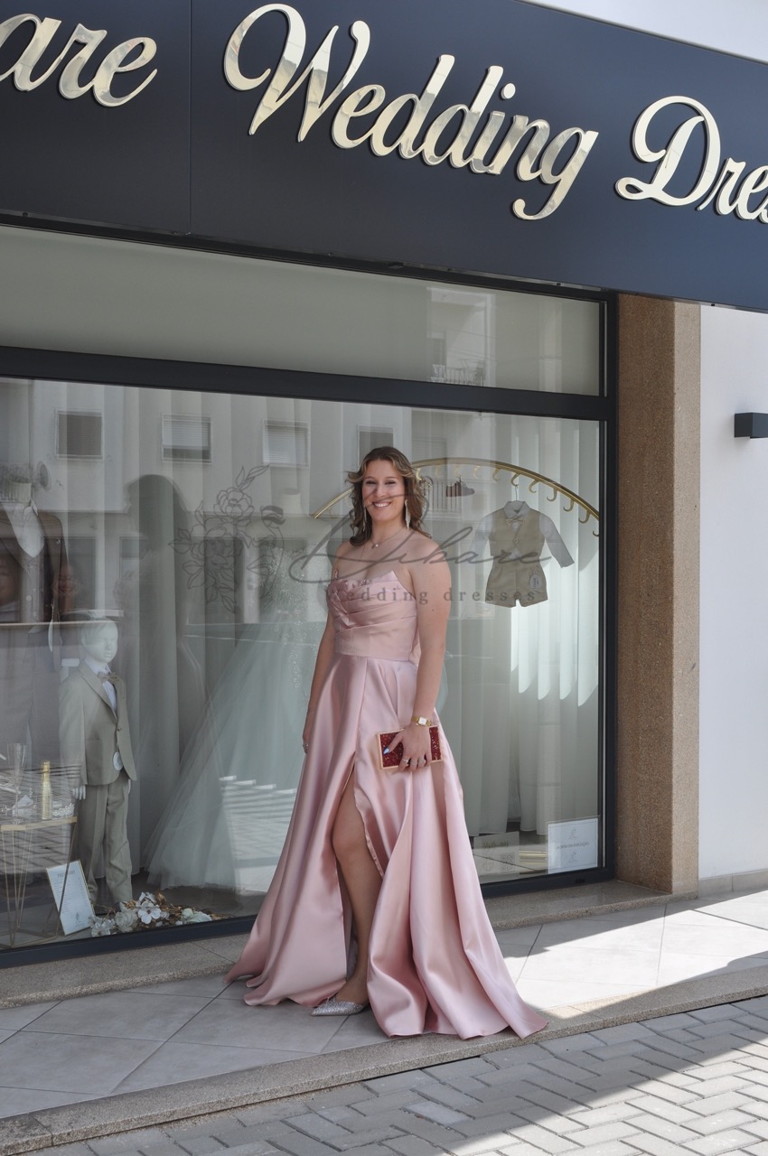 Vestido de Cerimónia cai-cai, com racha e bolsos.