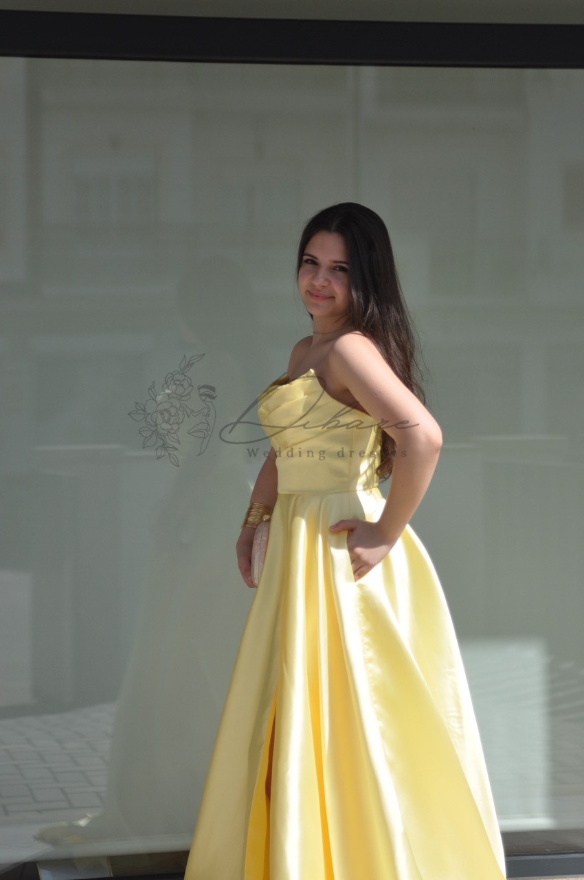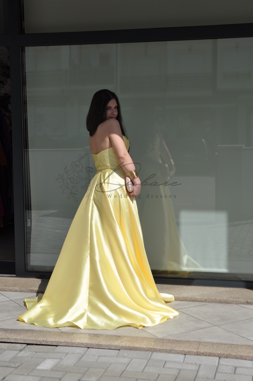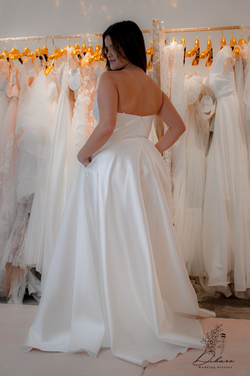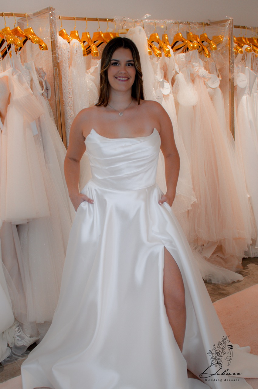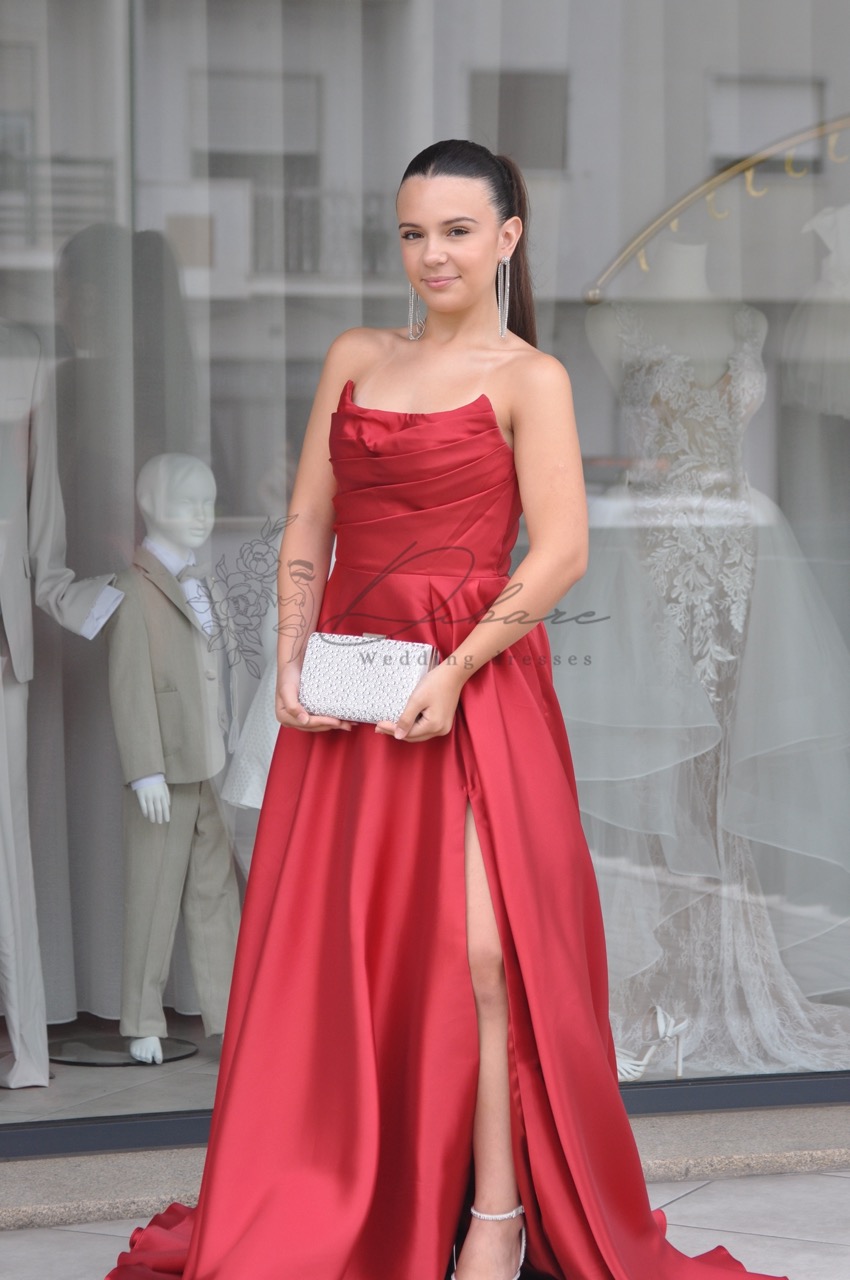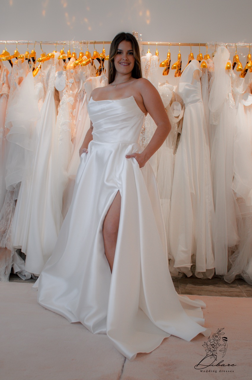 Vestido de Cerimónia cai-cai, com racha e bolsos.