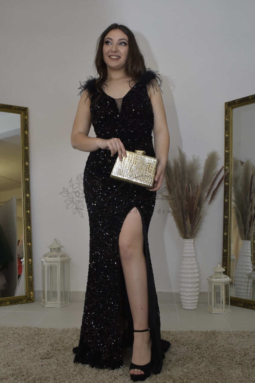 Um vestido longo preto de lantejoulas que irradia glamour e sofisticação. Com um design de costas abertas, ele exala sensualidade, enquanto as lantejoulas brilham intensamente, refletindo luz a cada movimento. As alças, adornadas com plumas, adicionam um toque ousado e dramático, criando um contraste elegante entre o brilho das lantejoulas e a leveza das plumas. Ideal para ocasiões noturnas e eventos luxuosos, este vestido combina elementos modernos e clássicos, tornando-o uma peça marcante e inesquecível.