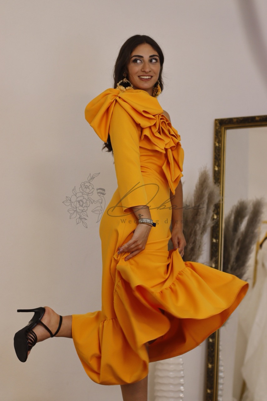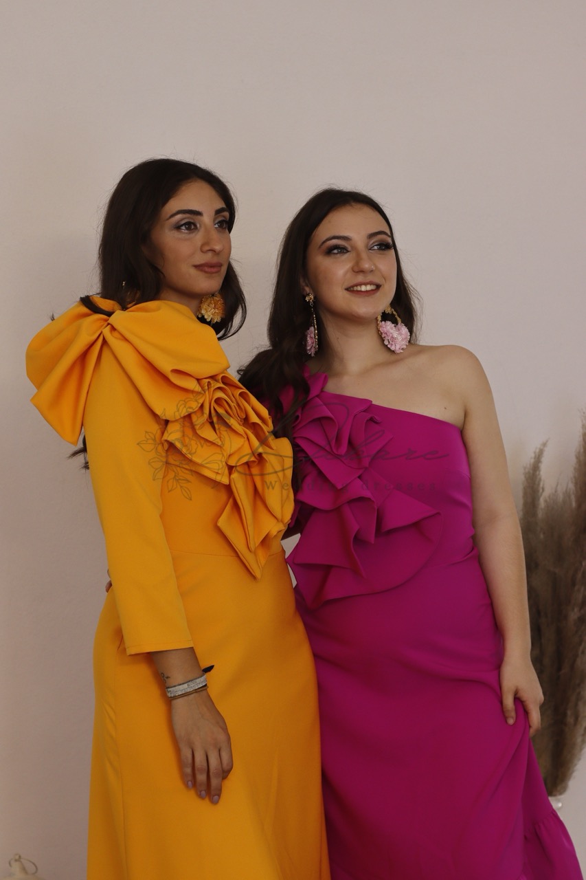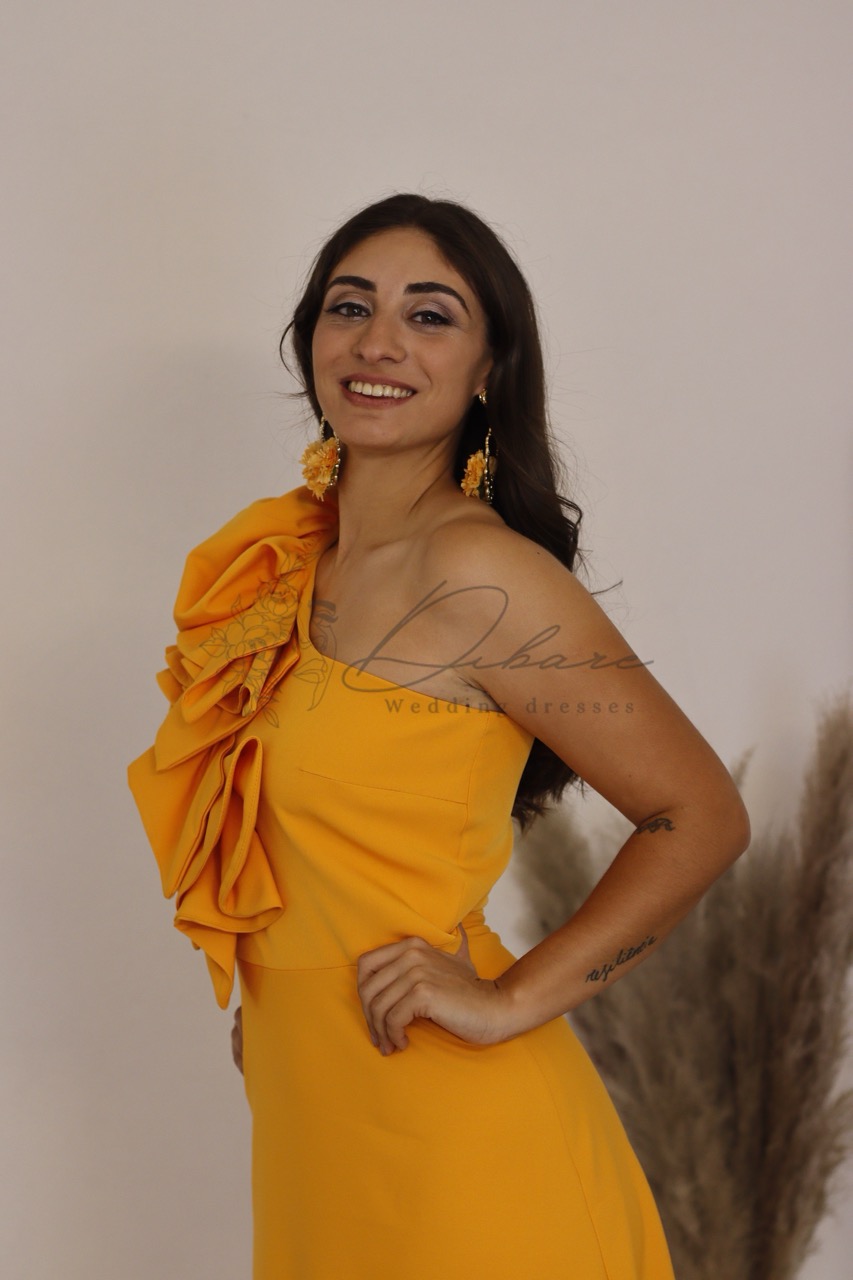 Este vestido de festa é uma declaração de estilo e alegria, perfeito para quem deseja um visual arrojado e memorável. Com um corte longo e elegante, a peça destaca-se pela sua cor fúcsia vibrante, uma tonalidade que irradia confiança e modernidade. O design é marcado pelo decote assimétrico de ombro único, que é artisticamente adornado com detalhes de ruffles volumosos. Estes folhos, dispostos de forma fluida, acrescentam textura, movimento e um toque dramático e romântico. O vestido apresenta uma silhueta que cai elegantemente, ajustando-se de forma lisonjeira ao corpo antes de se soltar num comprimento de gala.