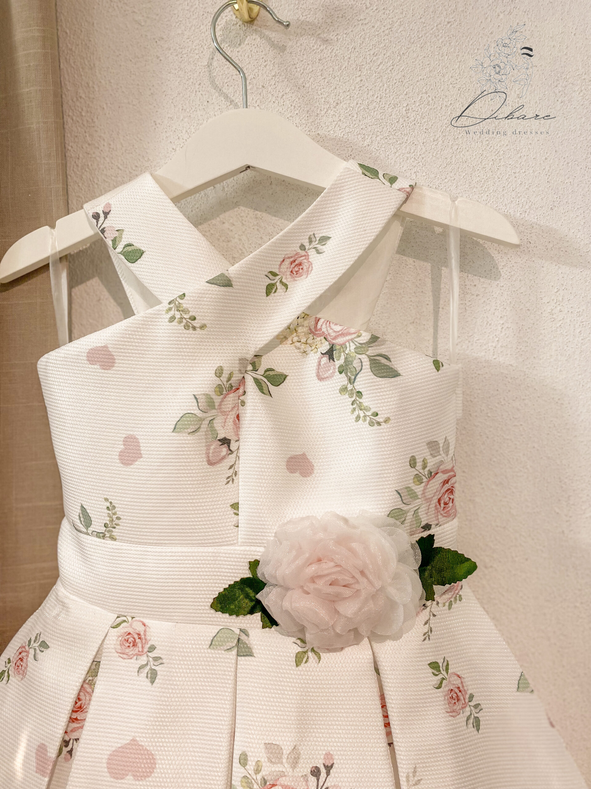 Este encantador vestido infantil é a personificação da doçura e elegância para as pequenas grandes ocasiões. Confecionado num tecido estruturado de alta qualidade com um brilho acetinado subtil, a peça destaca-se pelo seu fundo off-white adornado com um delicado padrão floral de rosas em tons de rosa pastel e folhagens verdes, evocando um jardim romântico e atemporal. O design apresenta um decote cruzado moderno e sofisticado, que confere um toque diferenciado à parte superior, enquanto a cintura é acentuada por uma faixa que culmina num deslumbrante detalhe tridimensional: uma flor em tecido suave que acrescenta textura e charme extra ao visual. A saia, com pregas largas e bem estruturadas, cria um volume clássico de “princesa”, garantindo movimento e conforto para que a criança possa aproveitar cada momento do evento com total liberdade.