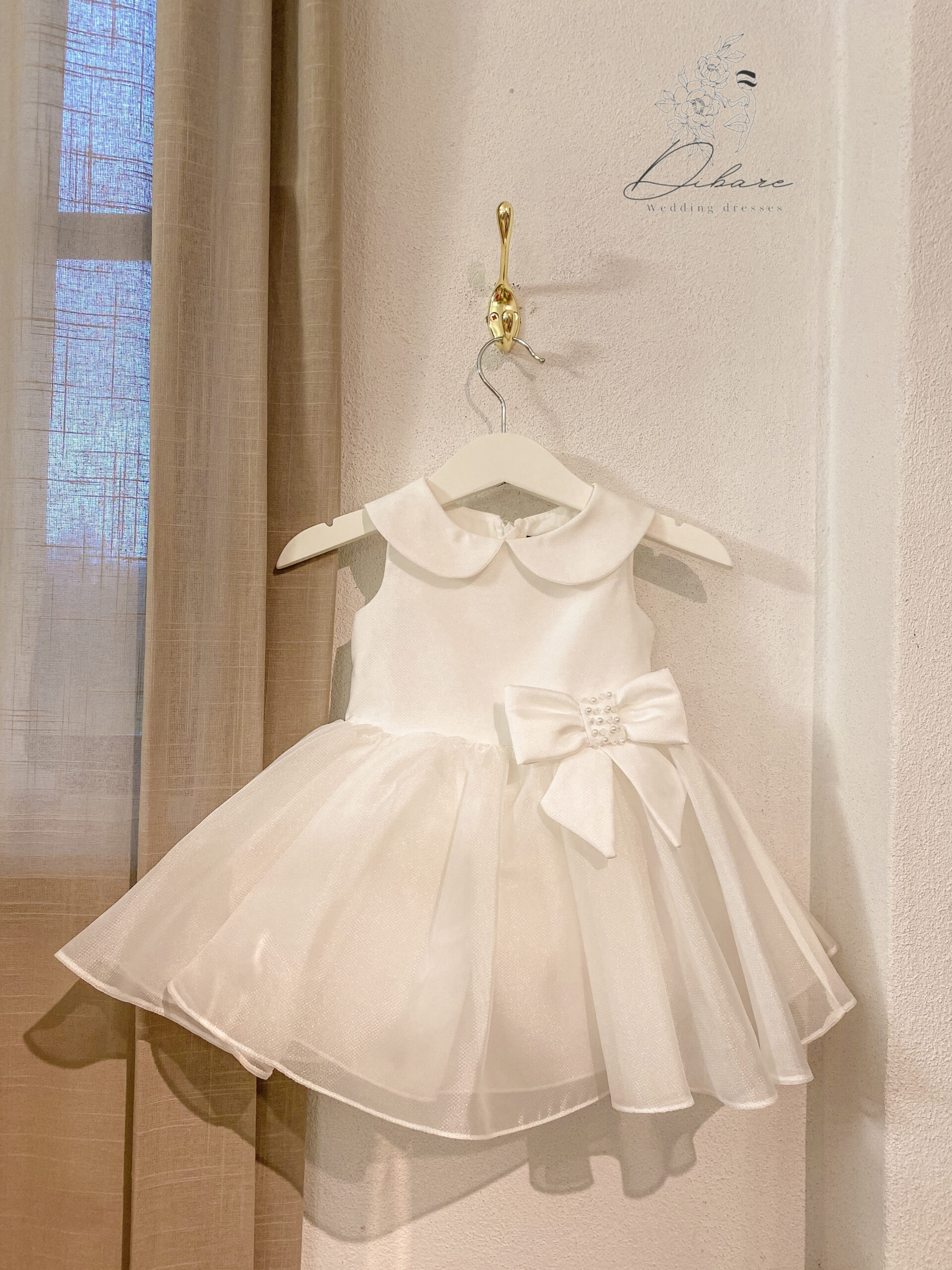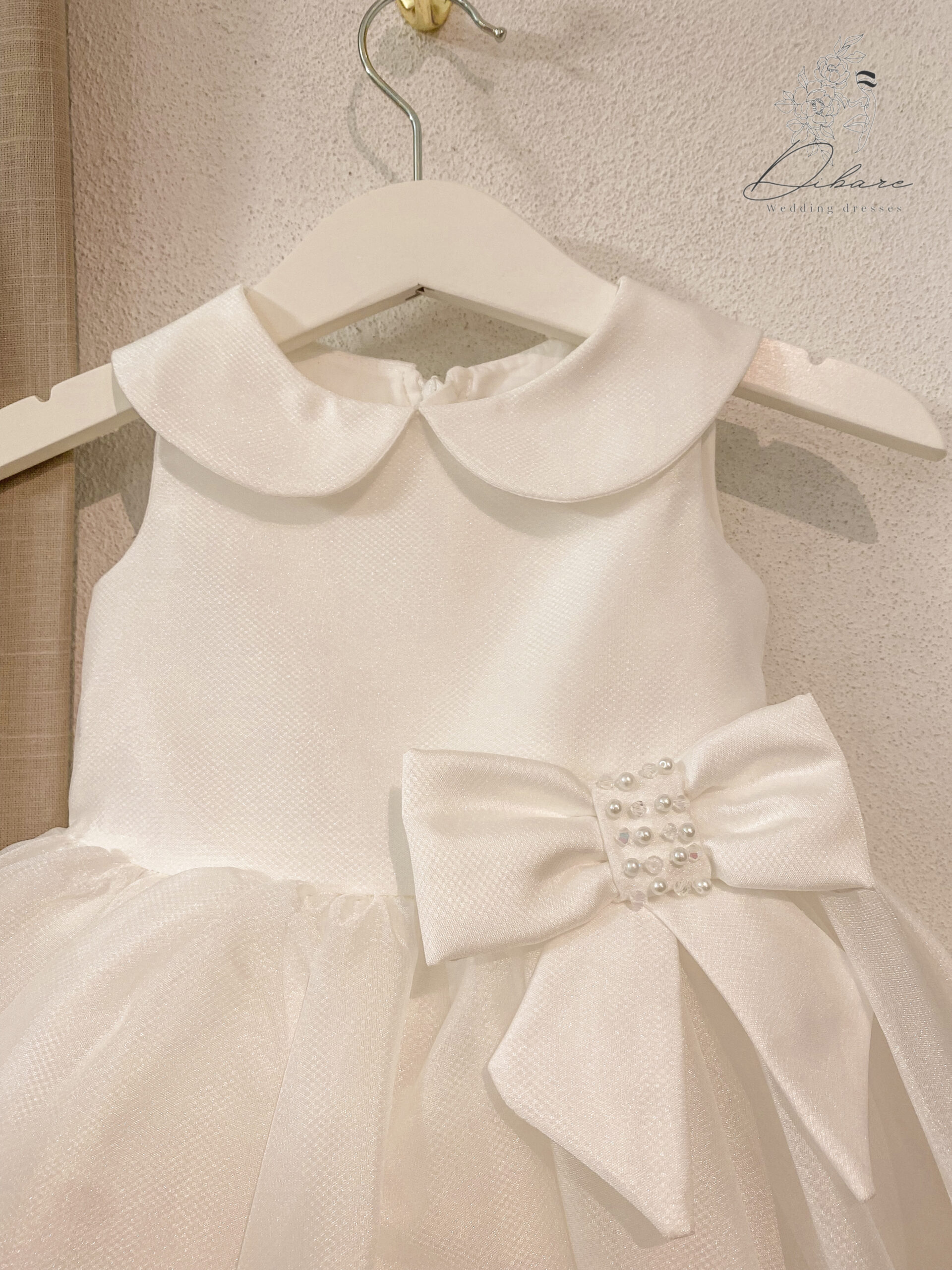 Este vestido de cerimónia para bebé é uma peça de sonho, desenhada para tornar qualquer celebração — como um batizado ou casamento — num momento inesquecível de doçura e elegância. Com um design clássico e angelical, este modelo destaca-se pela sua pureza e delicadeza. A peça apresenta um corpo acetinado de corte impecável, realçado por um gracioso colarinho “Peter Pan” que confere um ar intemporal e ternurento. Na cintura, um laço generoso com detalhe de pérolas centrais serve como o ponto focal de sofisticação, unindo a estrutura superior à saia volumosa. A saia, composta por camadas de tule leve e translúcido, cria um movimento fluído e etéreo, digno de uma pequena princesa.
