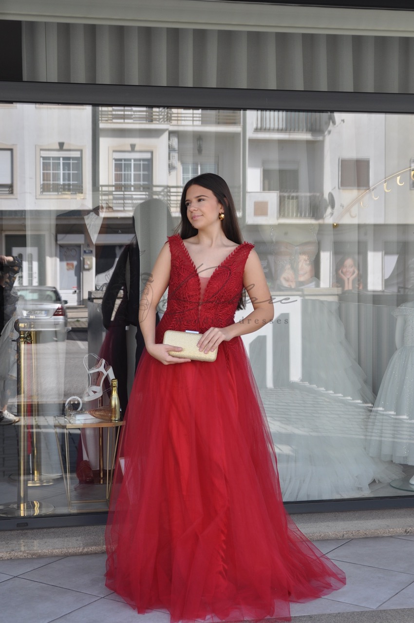 Este deslumbrante vestido de gala em bordeaux vibrante é a personificação da elegância e do romantismo, desenhado para quem deseja uma presença marcante e inesquecível em qualquer evento formal. A peça apresenta um sofisticado decote em V com um painel de tule ilusão discreto no centro, proporcionando suporte e um toque moderno. O corpete é ricamente detalhado com bordados e aplicações, que adicionam brilho e textura à parte superior. Com uma modelagem de cintura alta bem definida, o vestido flui para uma saia volumosa em linha A, composta por múltiplas camadas de tule leve e arejado. A saia ampla cria um movimento etéreo e dramático, conferindo uma aura de “princesa moderna” que equilibra perfeitamente a intensidade da cor com a delicadeza do tecido.