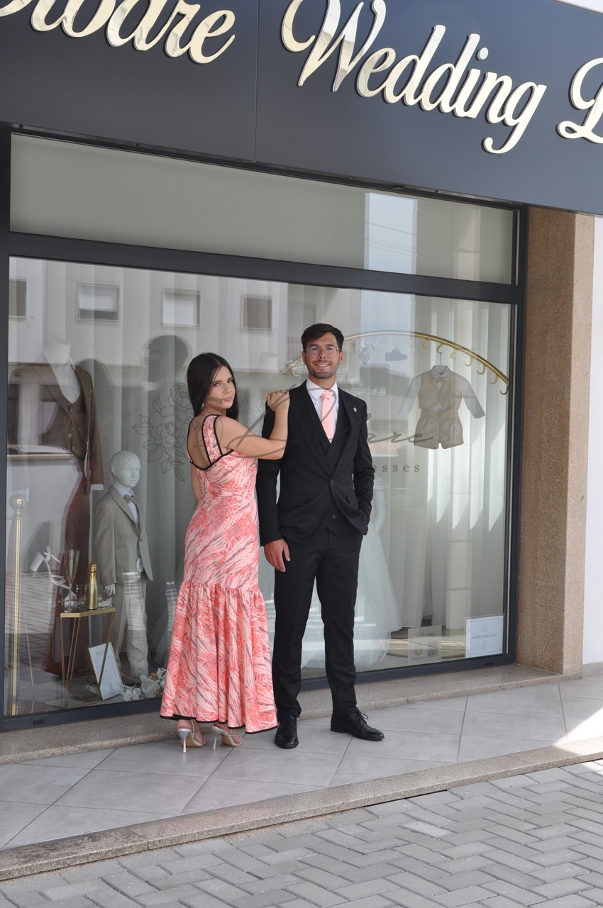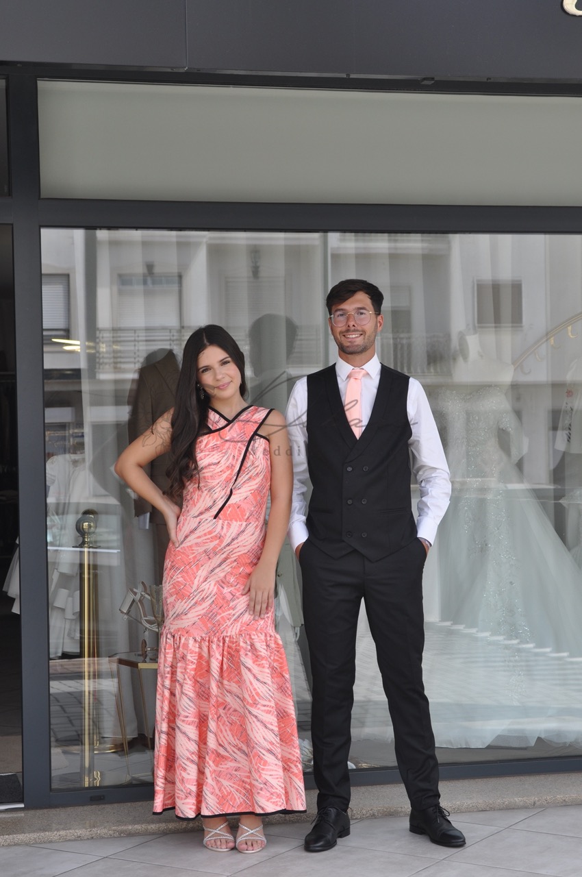 Este vestido midi é uma peça artística e vibrante, perfeita para quem deseja um visual moderno e diferenciado em eventos de dia ou celebrações ao ar livre. Com uma paleta de tons salmão e coral, o destaque reside no padrão abstrato e nos contornos contrastantes que conferem uma estética contemporânea única. O modelo apresenta um decote assimétrico inovador, com um detalhe de gola subida e uma abertura estilizada no peito, debruada a preto para realçar as linhas do design. A peça possui um corte ajustado ao tronco que se abre numa saia ligeiramente rodada a partir do joelho, criando um efeito de folho discreto que proporciona movimento e leveza. O padrão orgânico em tons quentes é pontuado por linhas escuras que percorrem todo o vestido, criando uma harmonia visual que favorece a silhueta. O comprimento midi torna este vestido extremamente elegante e prático, permitindo destacar o calçado, como umas sandálias de tiras finas em tons neutros.