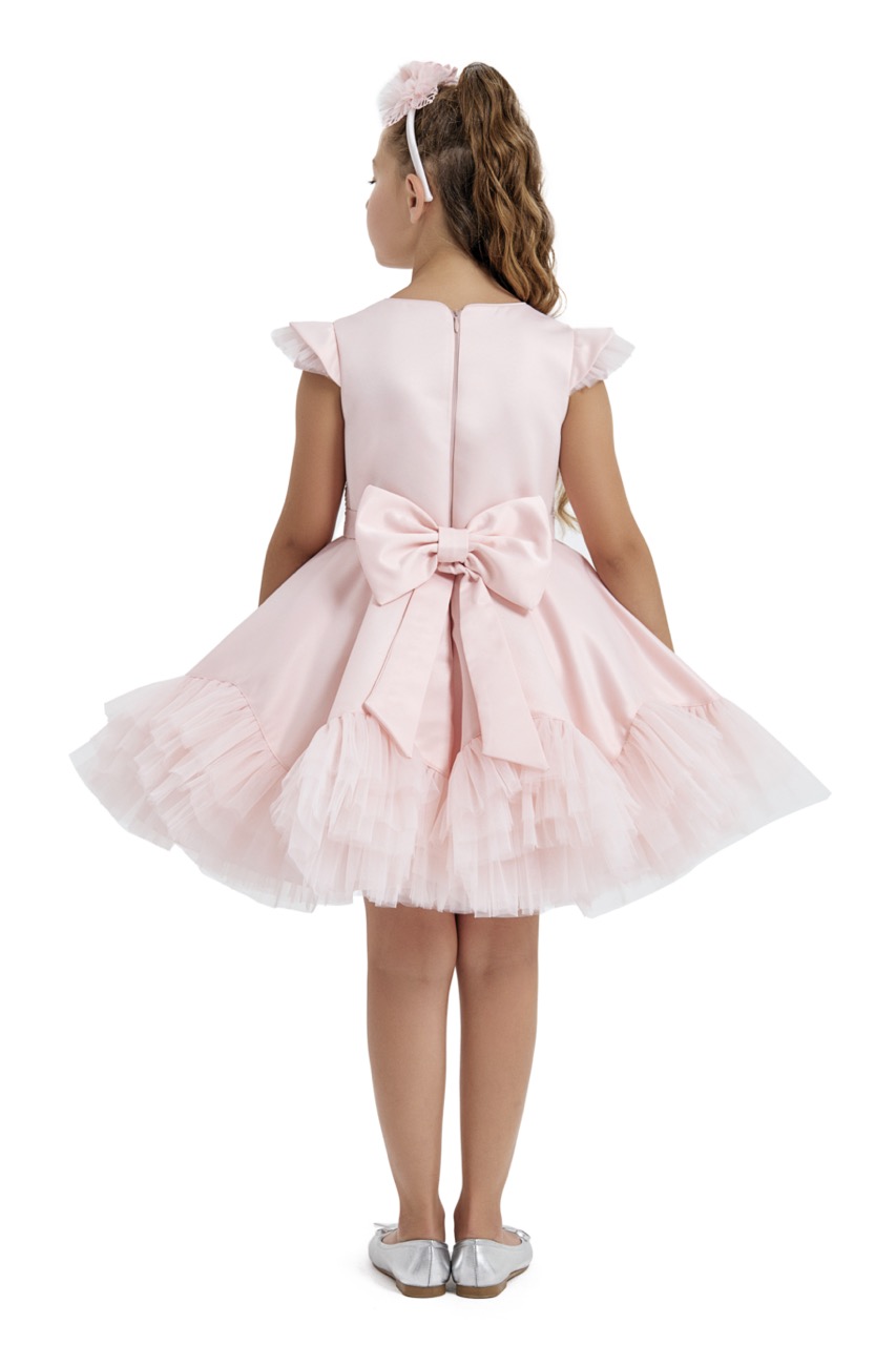 Este é o vestido perfeito para damas de honra e festas, combinando elegância e um toque de conto de fadas. Disponível para as idades dos 4 aos 8 anos, este modelo apresenta um corpete em renda delicada na parte superior. O design destaca-se pelo seu tom rosa suave e pela saia rodada e volumosa, que termina com uma camada de tule franzido na bainha, garantindo um movimento encantador. A cintura é realçada por uma faixa de tecido, adornada com flores 3D feitas à mão, que adicionam textura e doçura. Para um toque final de ternura, o vestido possui um elegante laço nas costas (embora não visível na imagem). O look fica completo com a bandolete a condizer, decorada com uma flor, que acompanha o vestido. Este conjunto é ideal para um visual inesquecível e requintado. Disponível para encomenda no nosso atelier na Sertã.