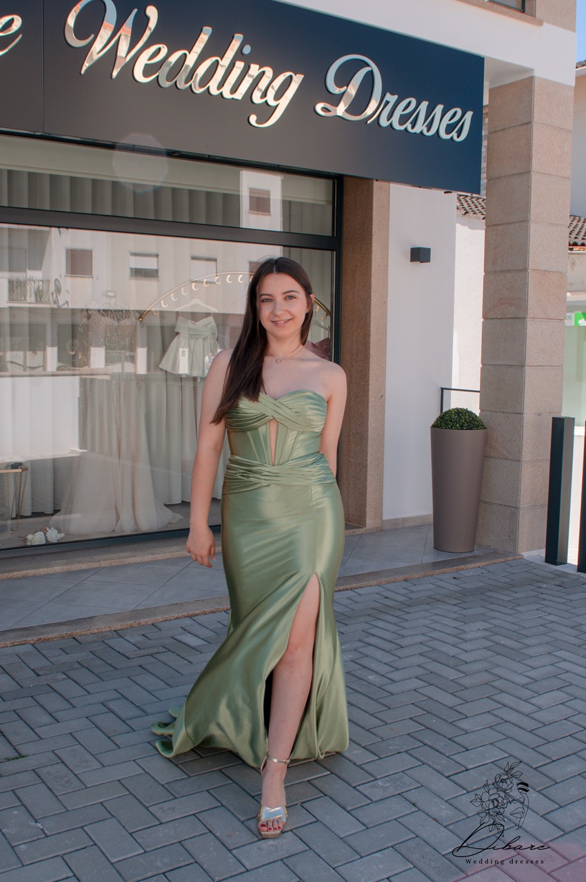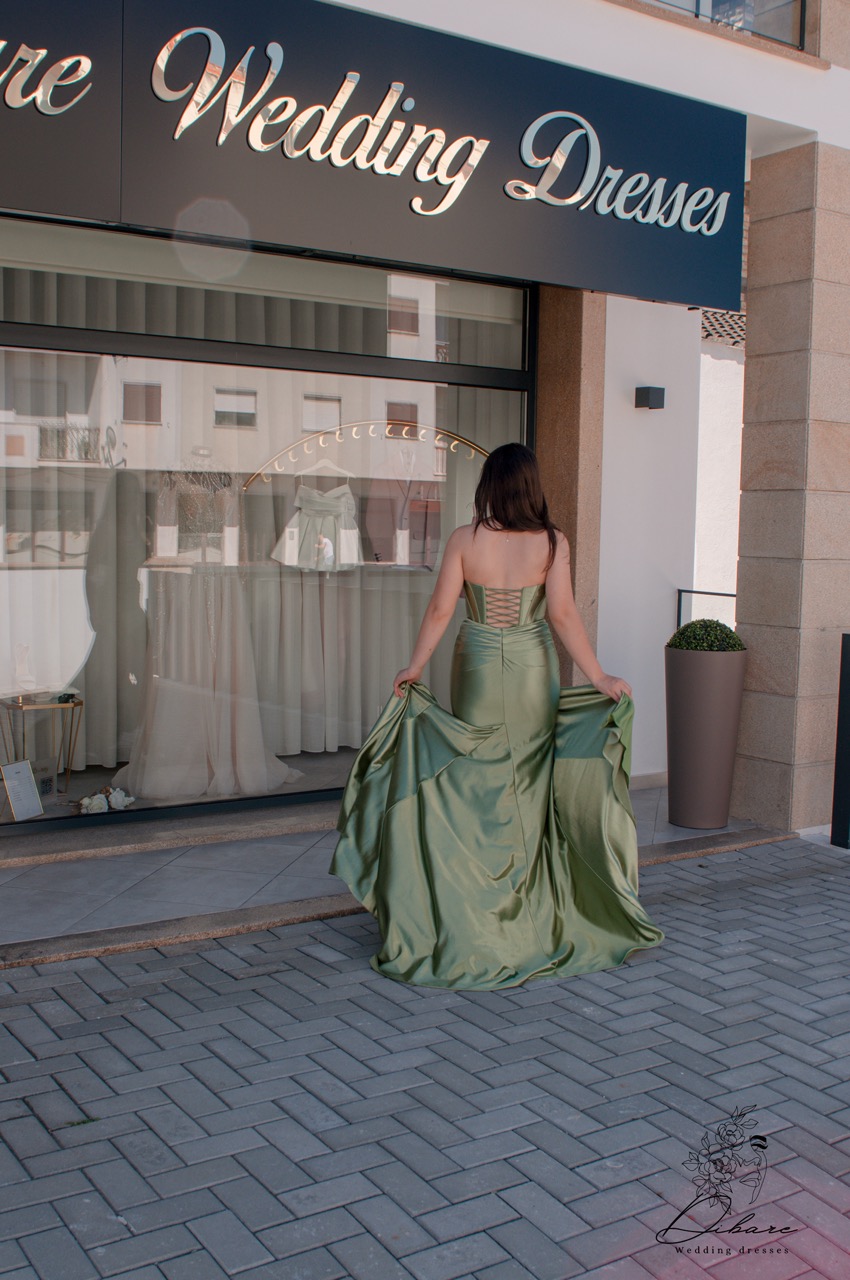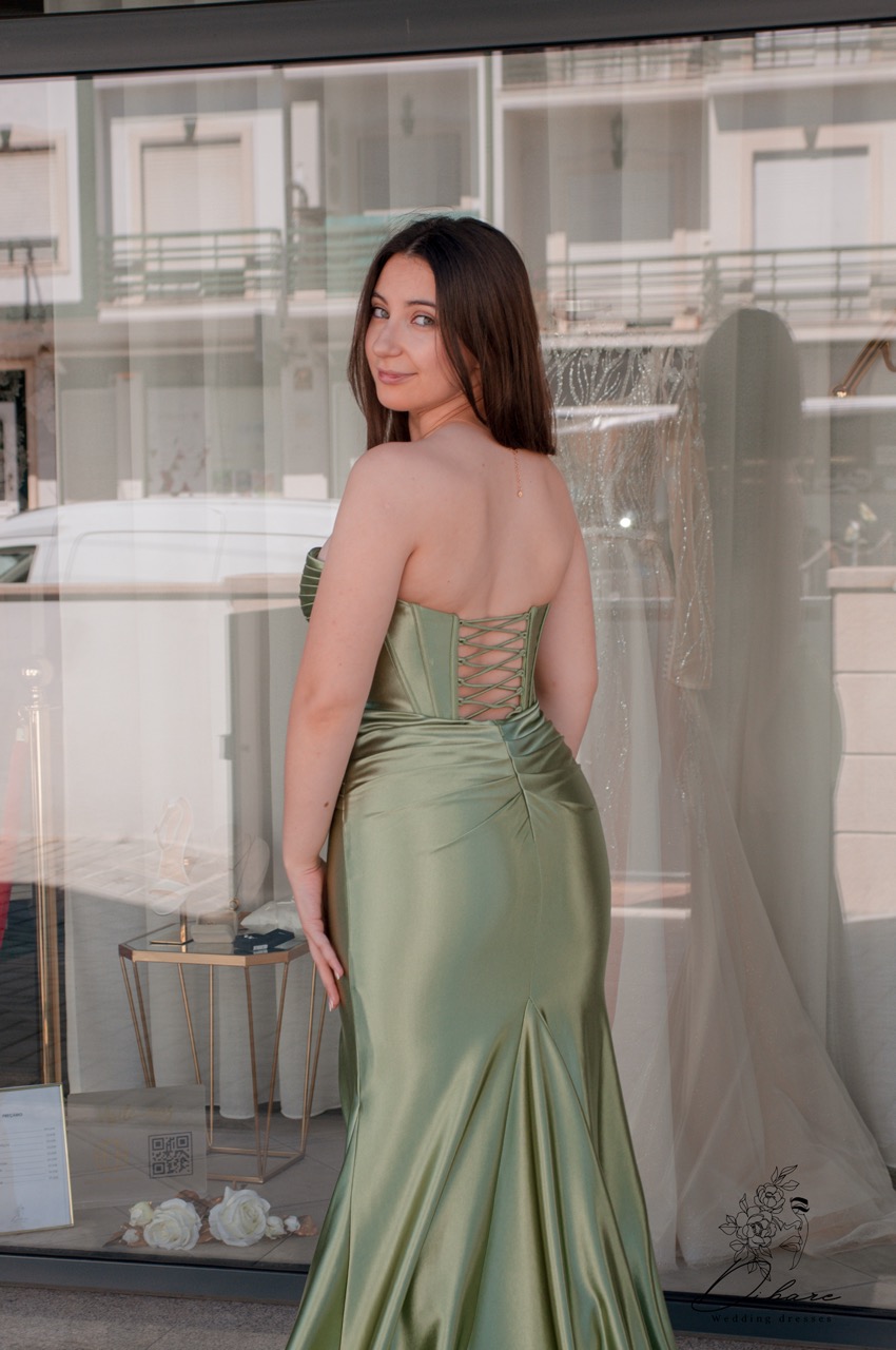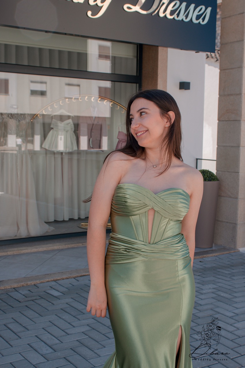 Este deslumbrante vestido longo é a definição de elegância moderna. Confeccionado num luxuoso tecido de cetim com um acabamento suave e acetinado, o vestido apresenta uma silhueta envolvente que realça a figura de forma sofisticada. O decote em coração sem alças (cai-cai) e o detalhe frontal estilo corpete com costuras estruturais adicionam um toque de glamour e sustentação. O ponto focal do design é a sedutora fenda alta na perna, que confere movimento e um toque ousado, perfeito para um evento de gala, baile ou cerimónia. A cor, um tom vibrante e contemporâneo de verde-oliva ou verde, é ideal para quem deseja um visual que se destaque.