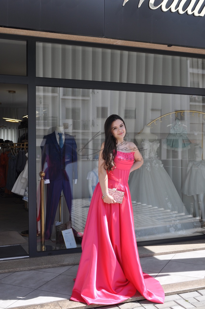 Este vestido de festa longo é a escolha perfeita para quem deseja causar um impacto memorável e vibrante em qualquer evento especial, desde casamentos a bailes de formatura ou galas. Apresentado numa arrebatadora e luxuosa tonalidade rosa choque (fúcsia vibrante), o vestido é confeccionado num tecido que aparenta ter um brilho acetinado e uma estrutura que confere volume e movimento à saia. A partir da cintura, a saia fluida e volumosa desce com graça, criando um efeito dramático e esvoaçante. A bainha longa, que toca o chão e pode ter uma ligeira cauda, completa o look de princesa moderna.