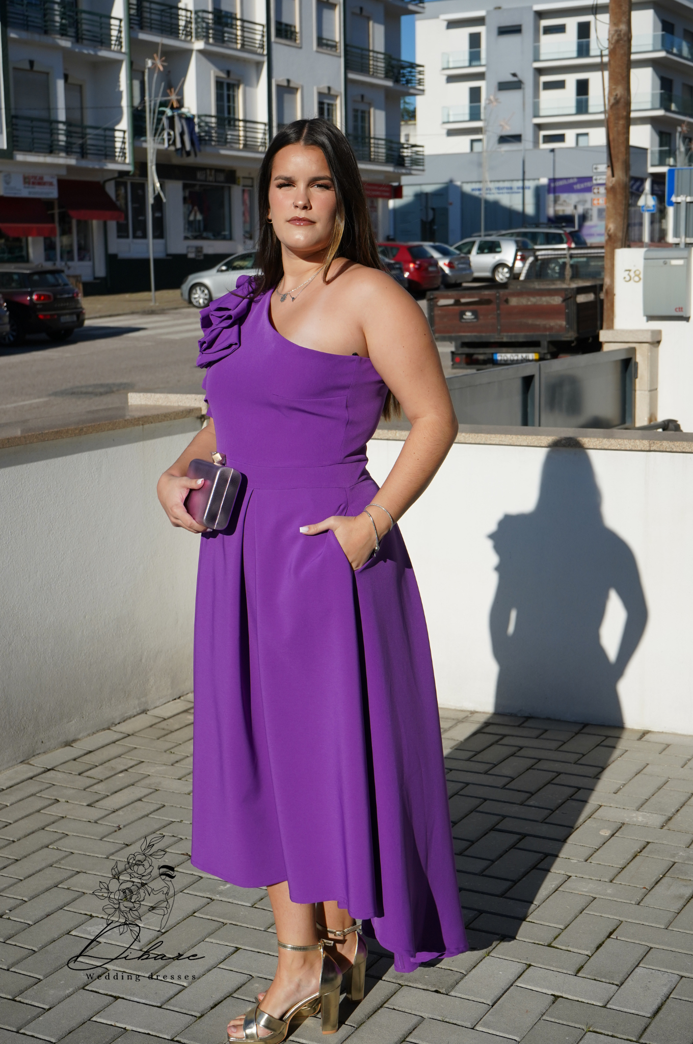 Este elegante vestido de festa em tom violeta vibrante é a escolha perfeita para quem procura sofisticação com um toque de modernidade. Com um design assimétrico de um só ombro, a peça destaca-se pelo detalhe escultural de uma flor em relevo na alça, conferindo um ar romântico e luxuoso ao visual. A saia apresenta um corte mullet (frente mais curta e costas alongadas), que proporciona um movimento fluido e gracioso ao caminhar, além de permitir o destaque do calçado. Um detalhe irresistível e funcional é a presença de bolsos laterais discretos, que aliam praticidade à elegância da alta costura. Confeccionado em tecido estruturado com acabamento impecável.