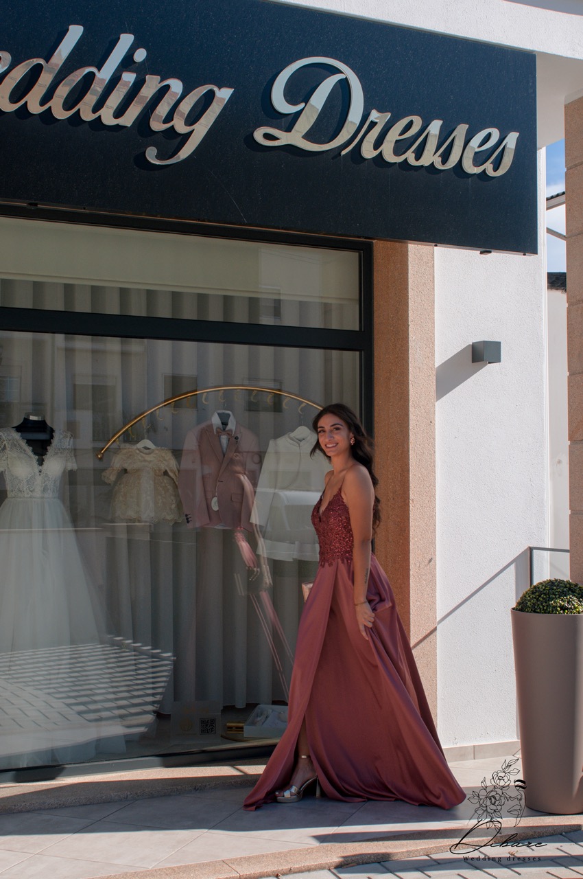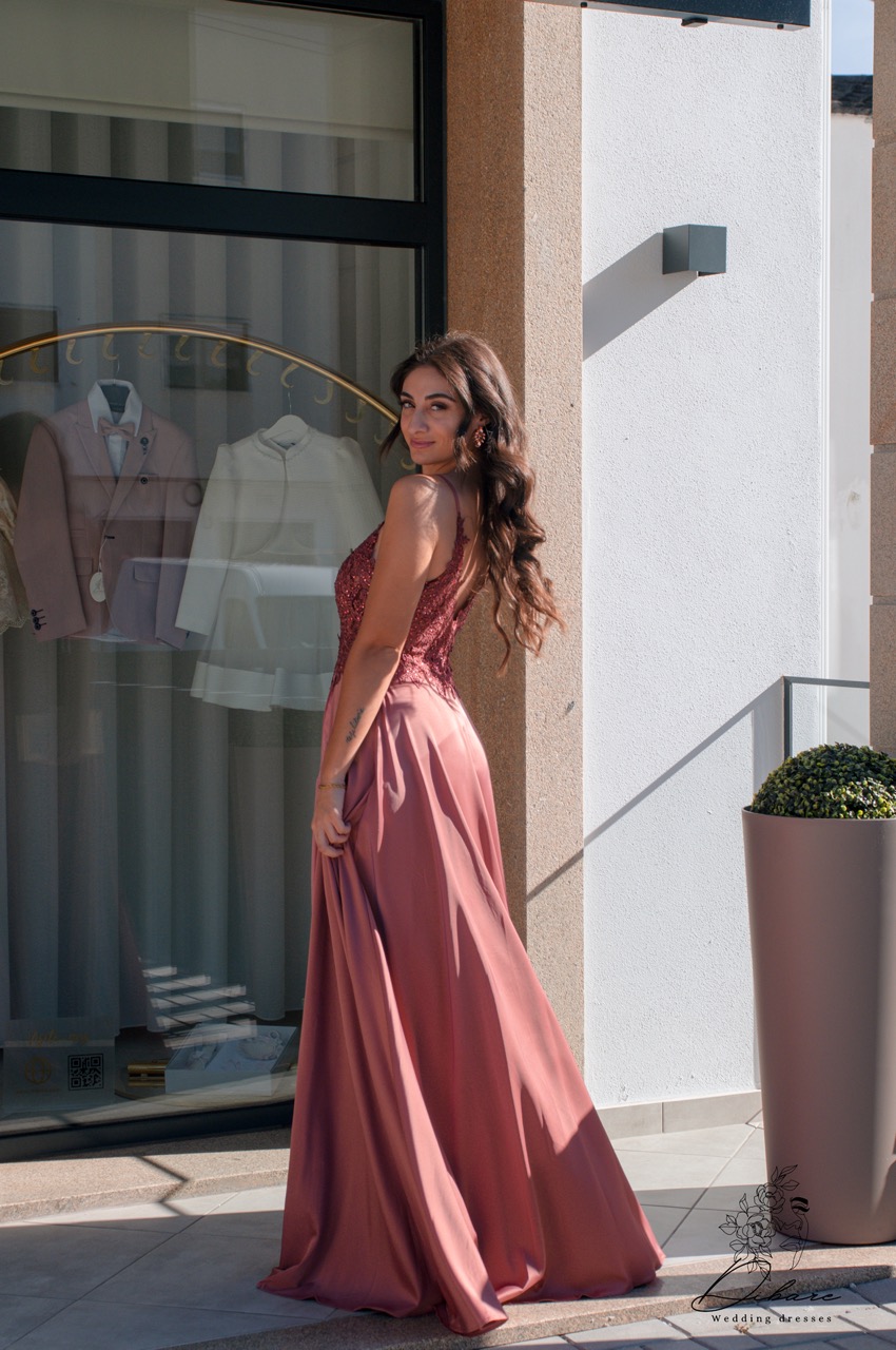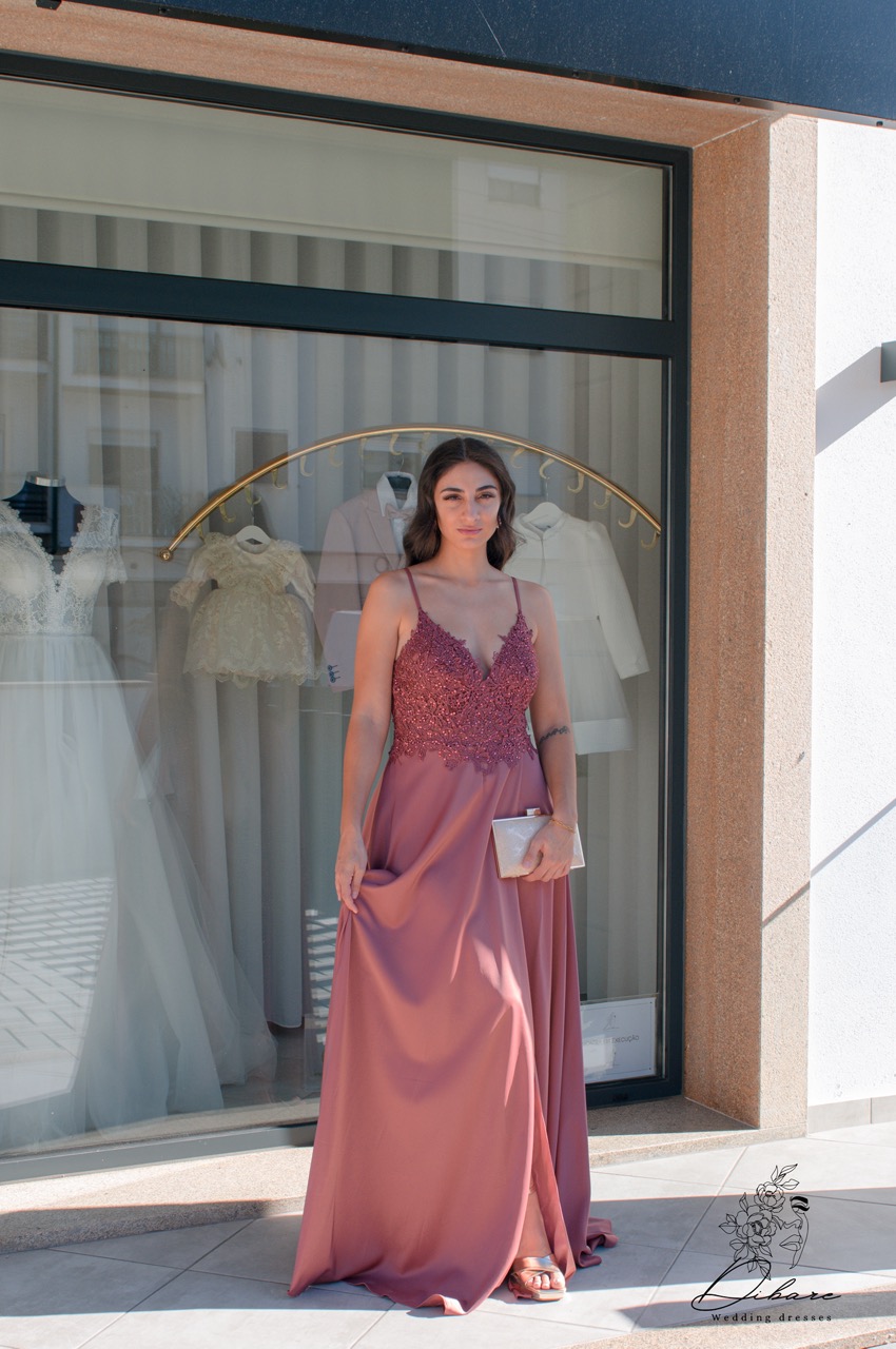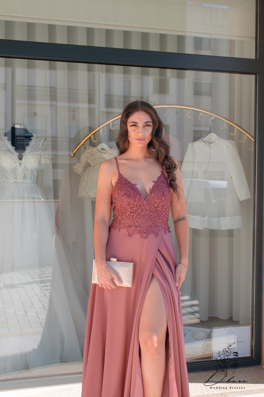 Este é um vestido de festa deslumbrante, ideal para quem procura um equilíbrio perfeito entre o romantismo clássico e a sofisticação moderna. A peça apresenta um tom rosa velho elegante, que transmite serenidade e requinte para eventos formais, como casamentos, galas ou bailes de finalistas. O corpete é meticulosamente trabalhado em renda floral delicada, apresentando um decote em “V” que valoriza o colo de forma feminina. As alças finas conferem uma leveza estética, garantindo um visual arejado e delicado. A transição entre o corpo rendado e a saia é feita de forma fluida, com a renda a sobrepor-se levemente ao tecido da saia para um efeito orgânico. A saia de comprimento maxi é confeccionada num tecido acetinado com um cair impecável, proporcionando movimento e um brilho subtil ao caminhar. O corte em linha “A” favorece diversos tipos de corpo, oferecendo uma silhueta alongada e graciosa.