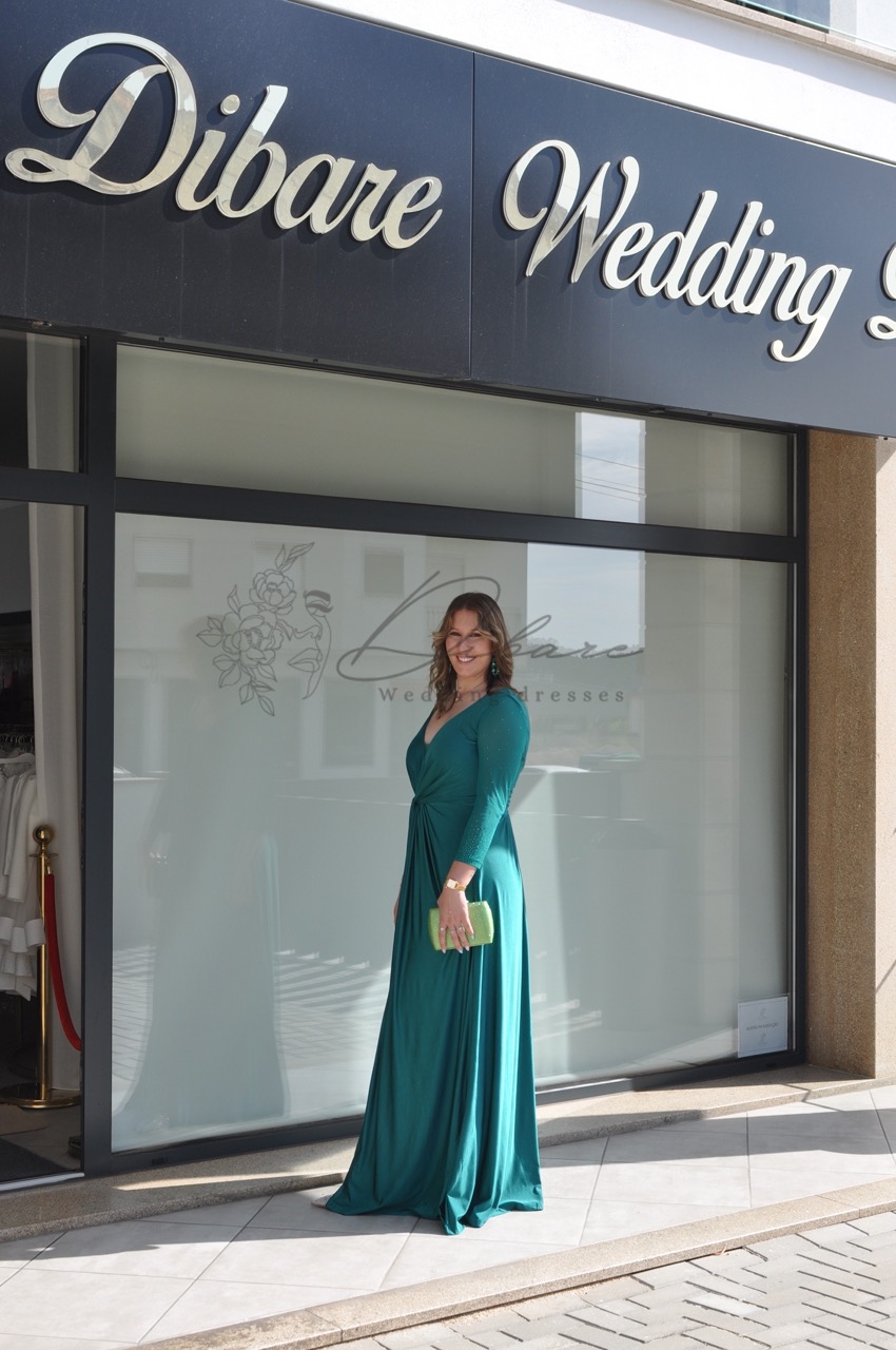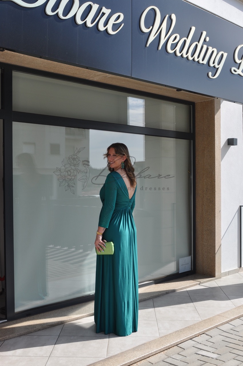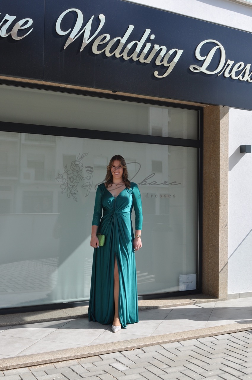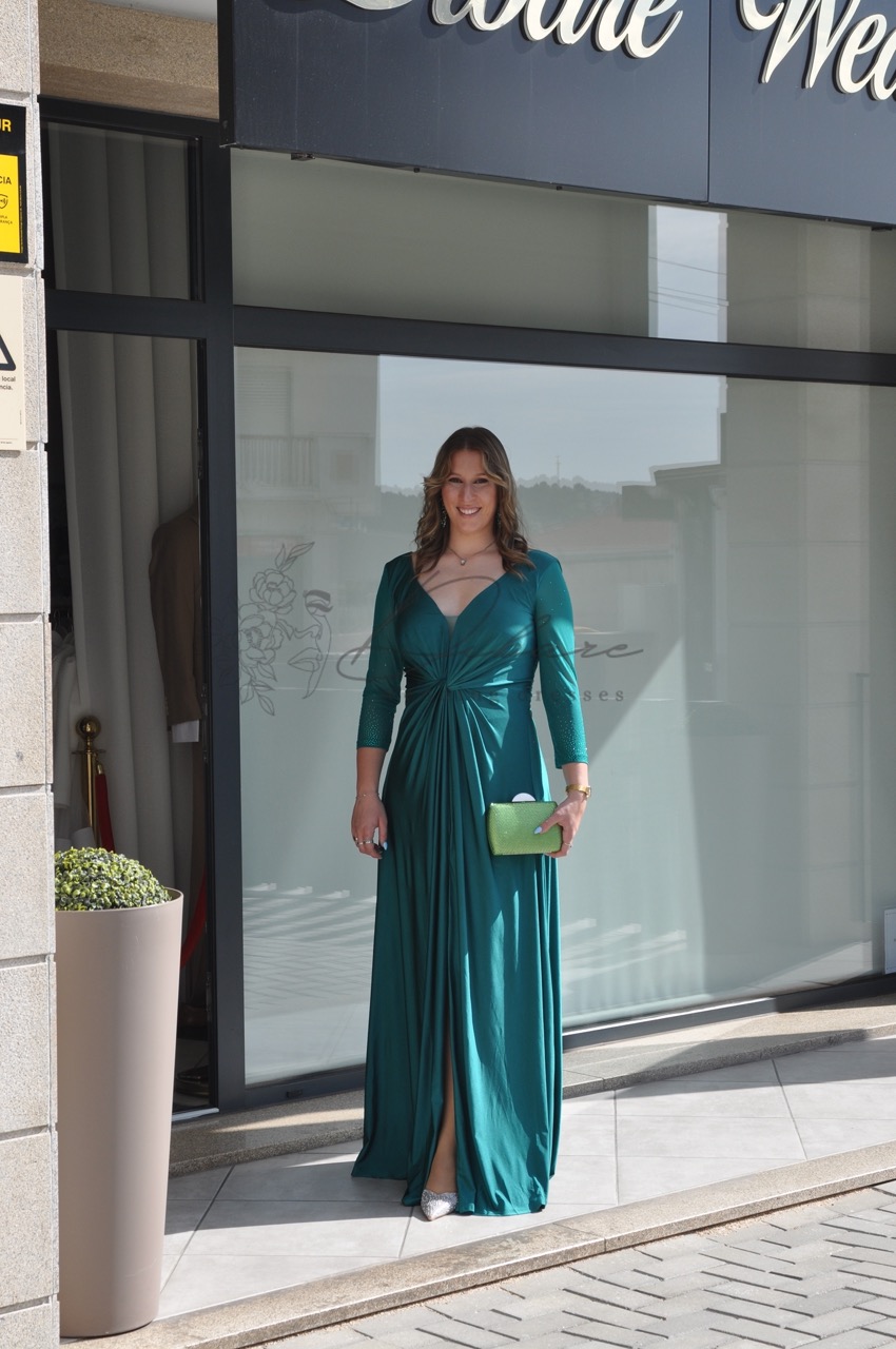 Este deslumbrante vestido de festa em tom verde-garrafa é a escolha ideal para quem procura aliar sofisticação e modernidade num evento especial. Com um corte longo e fluido, a peça destaca-se pelo seu acabamento acetinado que confere um brilho subtil e luxuoso a cada movimento. O design apresenta um decote em “V” transpassado que valoriza o colo de forma elegante, complementado por mangas de comprimento 3/4, perfeitas para diversas estações do ano. Na zona da cintura, o drapeado estratégico cria um efeito modelador que define a silhueta com conforto. O detalhe final de ousadia é revelado por uma generosa racha frontal, que não só facilita o movimento, como acrescenta um toque de glamour contemporâneo ao visual.
