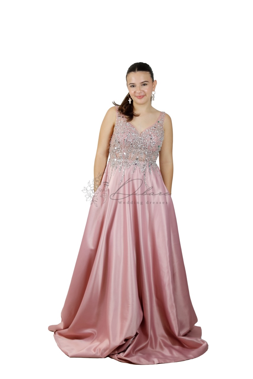 Este elegante vestido de gala em tom rosa velho é a personificação do glamour clássico com um toque contemporâneo, ideal para cerimónias, bailes ou eventos de prestígio. O design destaca-se por um corpete ricamente trabalhado, apresentando um decote em “V” lisonjeiro e alças largas que garantem conforto e suporte. A parte superior é adornada com intrincados bordados e aplicações de pedraria que captam a luz de forma sublime, criando um contraste luxuoso com a textura da saia. A saia de corte em “A”, confeccionada num tecido acetinado de brilho sofisticado, cai de forma fluida e majestosa até ao chão, proporcionando um movimento encantador ao caminhar. Um dos grandes diferenciais desta peça é a inclusão de bolsos laterais embutidos, que oferecem um toque de praticidade e modernidade sem comprometer a silhueta refinada. A cintura marcada define a forma feminina, resultando num visual equilibrado entre a delicadeza dos detalhes e a imponência do corte.