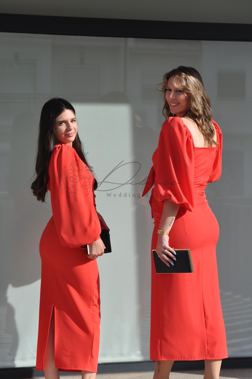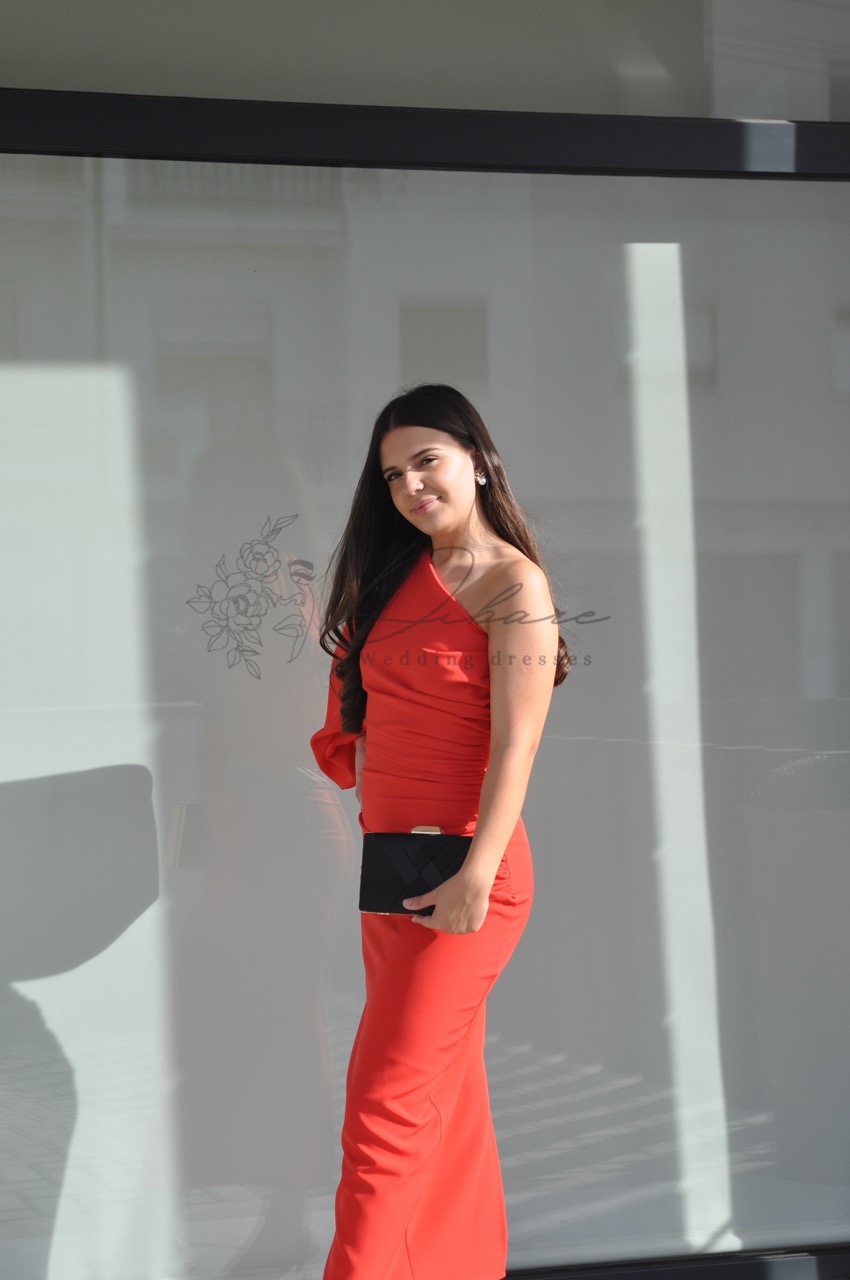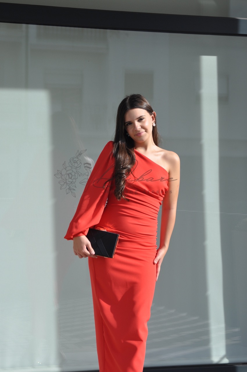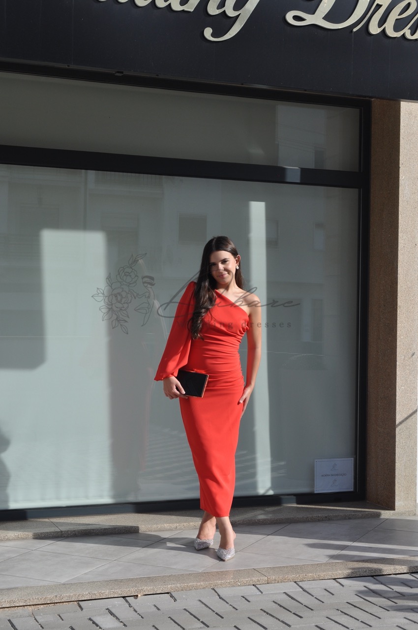 Este elegante vestido midi de tom vermelho vibrante é a definição de sofisticação moderna com um toque de audácia. O seu design assimétrico de um só ombro cria uma linha visual contemporânea e refinada, destacando-se pela manga longa fluida que confere um movimento gracioso e dramático à peça. A silhueta é cuidadosamente esculpida através de um efeito drapeado ao longo do tronco, que valoriza as formas femininas de maneira subtil e elegante. Com um comprimento que termina elegantemente acima do tornozelo, este modelo é confeccionado num tecido de alta qualidade que abraça o corpo com conforto.