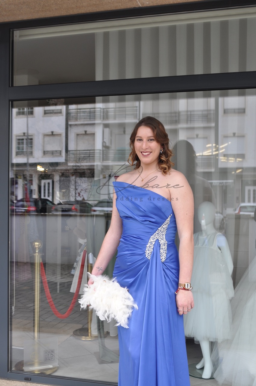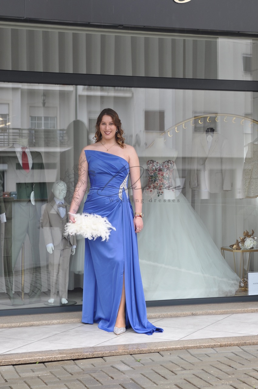 Apresentamos este deslumbrante vestido de gala, a escolha perfeita para um evento onde o glamour sofisticado é imperativo. Confeccionado num tecido fluído e luxuoso na vibrante tonalidade de Azul Klein (ou azul-cobalto), este modelo é desenhado para criar uma silhueta alongada e elegante. O design destaca-se pelo seu corte assimétrico e sedutor de um só ombro, que realça a clavícula e o pescoço com subtileza. O corpete é artisticamente drapeado e apresenta um detalhe intrincado de aplicações ou rendas com brilho na lateral, que cintilam discretamente e definem a cintura. A saia cai em cascata até ao chão com uma fluidez impressionante, culminando numa fenda frontal ousada que permite um vislumbre das pernas, adicionando um toque de modernidade e sensualidade.