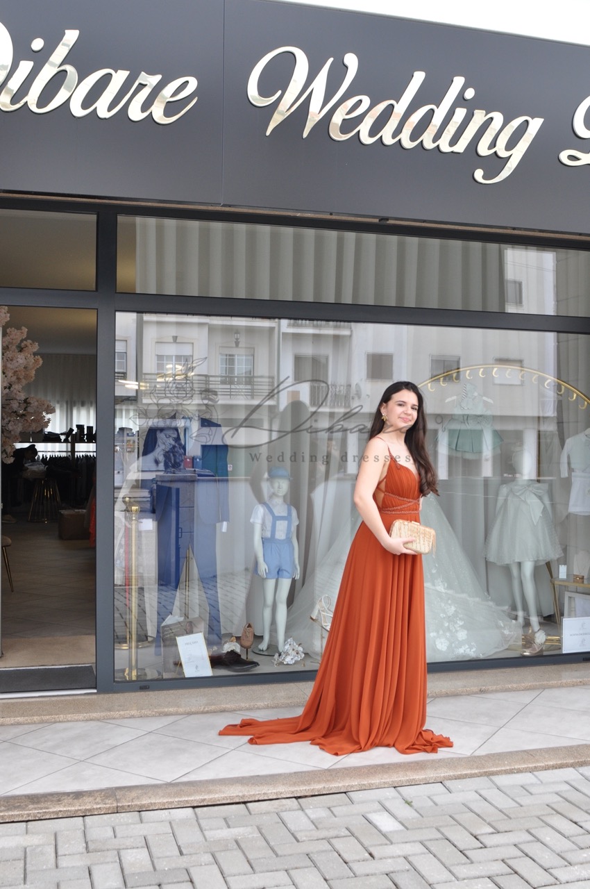 Deixe-se seduzir pela cor intensa e pelo caimento etéreo do nosso Vestido Longo, uma peça de elegância inegável perfeita para celebrações especiais. Confeccionado numa rica tonalidade terracota (ou laranja queimado), este vestido evoca a beleza quente do outono, sendo uma escolha marcante e sofisticada para casamentos, formaturas ou eventos de gala. O design destaca-se pelo seu corpete ajustado com um charmoso decote em V, sustentado por alças duplas finas que acrescentam um toque moderno e delicado à peça. A silhueta é completada por uma saia ampla e fluida, com um tecido leve que se move graciosamente a cada passo, conferindo um visual de deusa e uma sensação de conforto inigualável. O corte longo alonga a figura, garantindo um aspeto polido e extremamente fotogénico.
