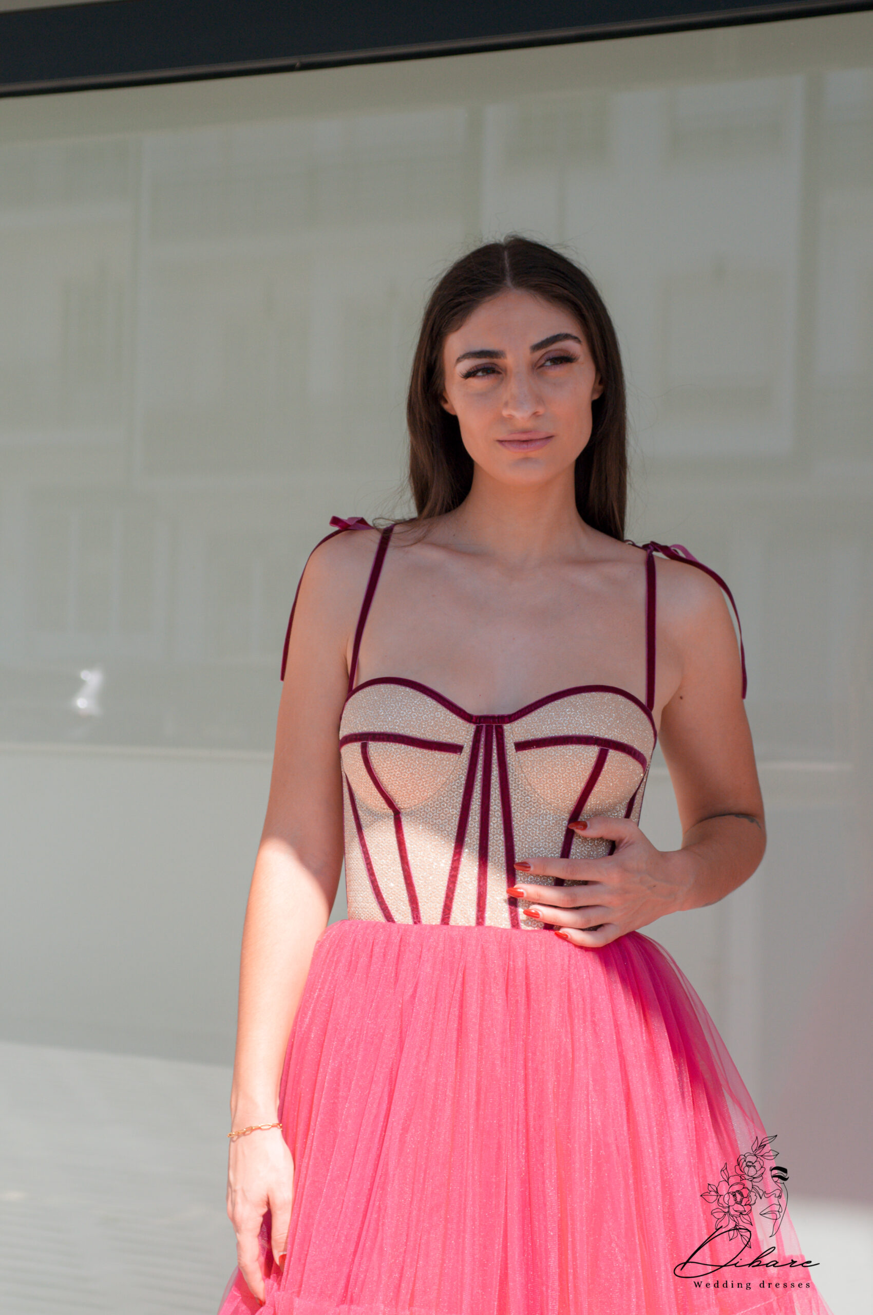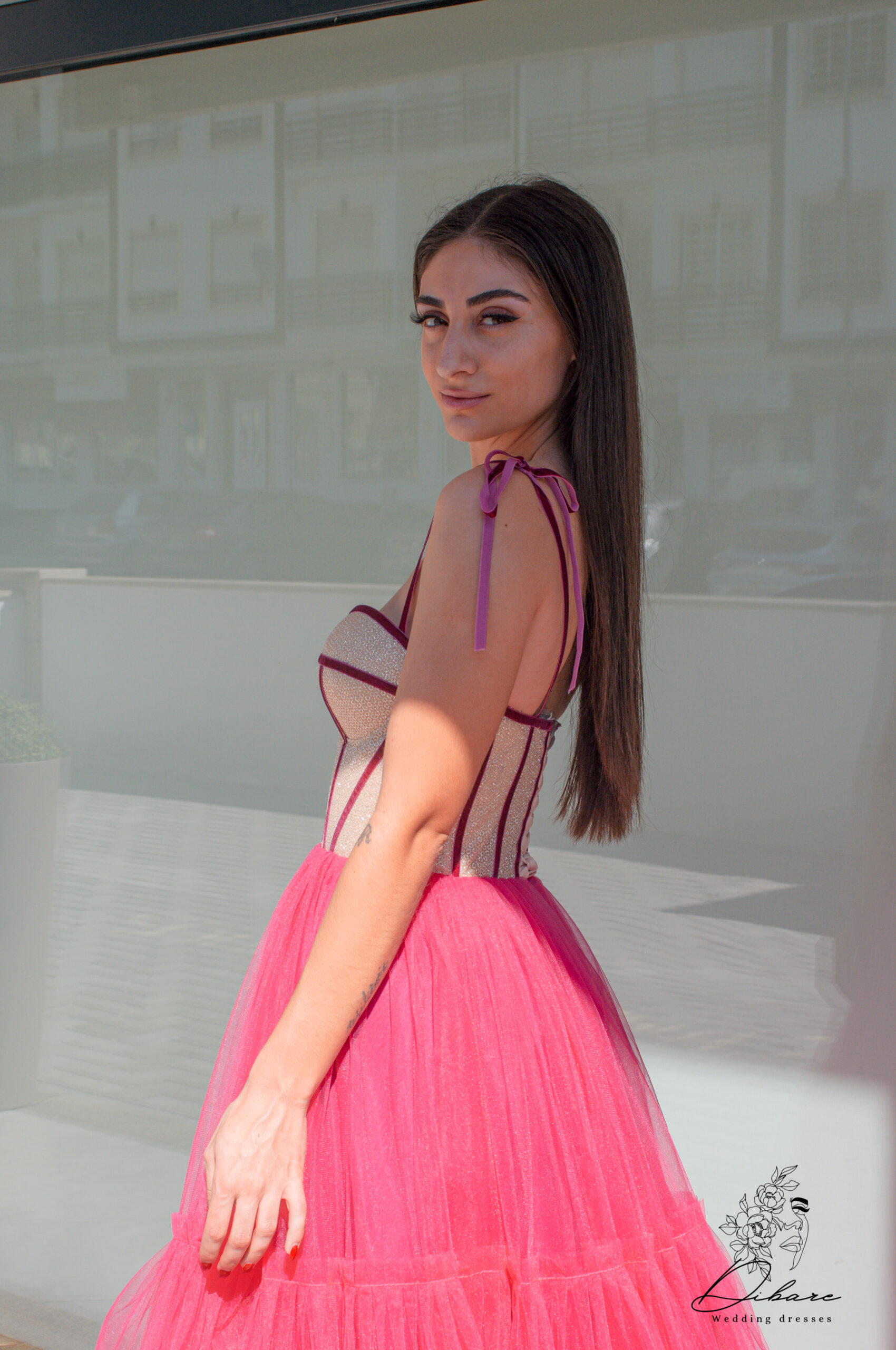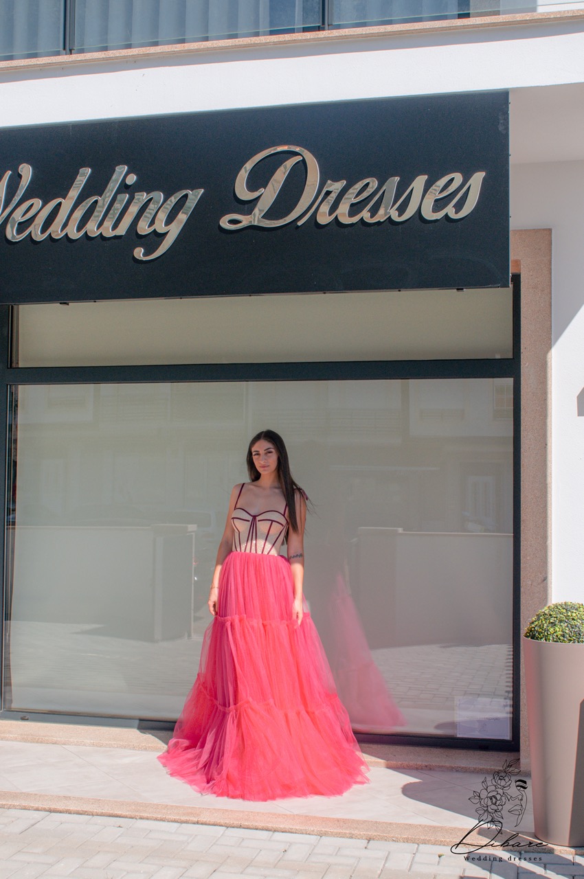 Este deslumbrante vestido de cerimonia é a escolha ideal para quem procura um visual que equilibra a ousadia moderna com o romantismo clássico. O design destaca-se pelo seu corpete estruturado em estilo “corset”, apresentando transparências subtis e aplicações delicadas que valorizam a silhueta de forma elegante e sofisticada. A parte inferior é composta por uma saia volumosa em tule de tom fúcsia vibrante, que confere movimento e um ar dramático à peça. O contraste entre a parte superior detalhada e a fluidez da saia cria um equilíbrio visual perfeito, tornando este modelo uma peça de destaque para eventos formais, galas ou celebrações especiais.