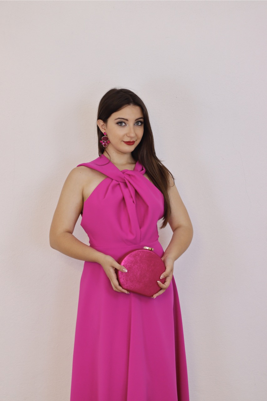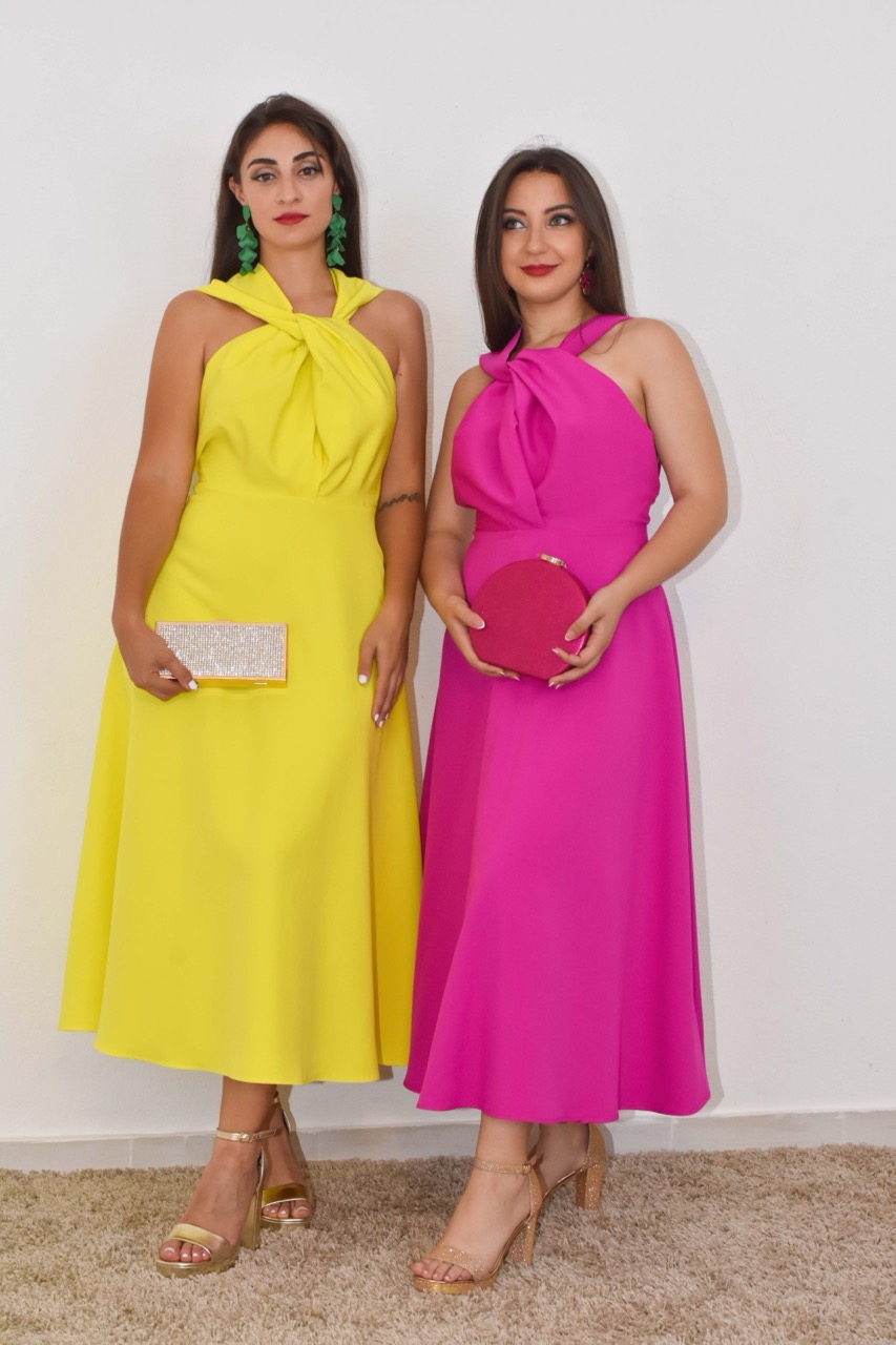 Este deslumbrante vestido de festa é a escolha ideal para quem procura um visual contemporâneo, elegante e cheio de personalidade. Com um design sofisticado e minimalista, o grande destaque desta peça reside no seu decote halter exclusivo, que apresenta um detalhe de nó estruturado no peito, criando um drapeado fluido que valoriza o colo de forma artística. Confeccionado num tecido de alta qualidade com um acabamento impecável, o modelo possui um corte acinturado que define a silhueta antes de abrir numa saia de cair elegante, garantindo conforto e liberdade de movimentos durante todo o evento.