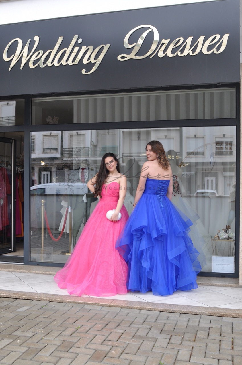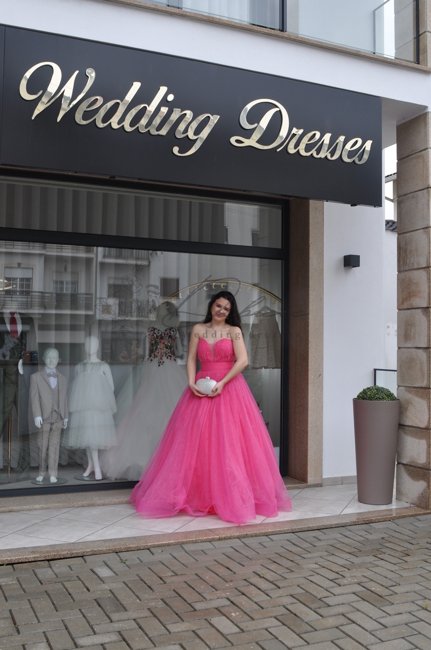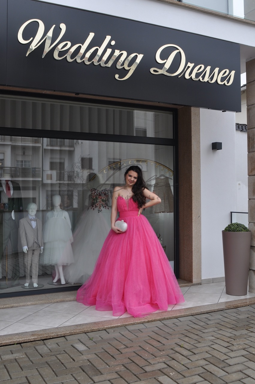 Entre num conto de fadas moderno com este esplêndido vestido de baile em fúcsia vibrante, uma peça que garante todos os olhares. Este vestido apresenta uma silhueta de tirar o fôlego, com uma saia volumosa em múltiplas camadas de tule que confere uma leveza etérea e um movimento majestoso a cada passo. O corpete é cuidadosamente estruturado num design de coração (sem alças), realçando delicadamente a zona do decote e proporcionando um ajuste seguro e lisonjeiro. A cor, um tom intenso e alegre de rosa ou fúcsia, é a escolha ideal para quem procura fazer uma declaração de moda ousada e memorável. Complementado por acessórios discretos, como a clutch prateada que a modelo segura