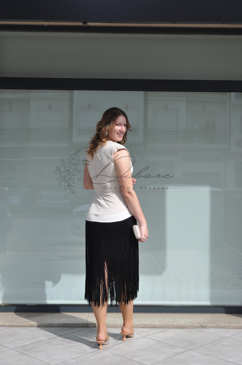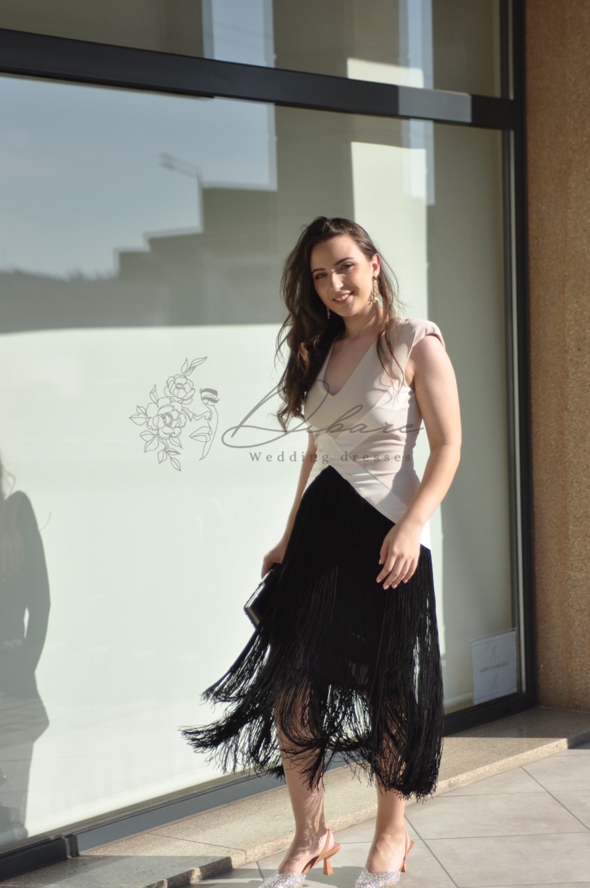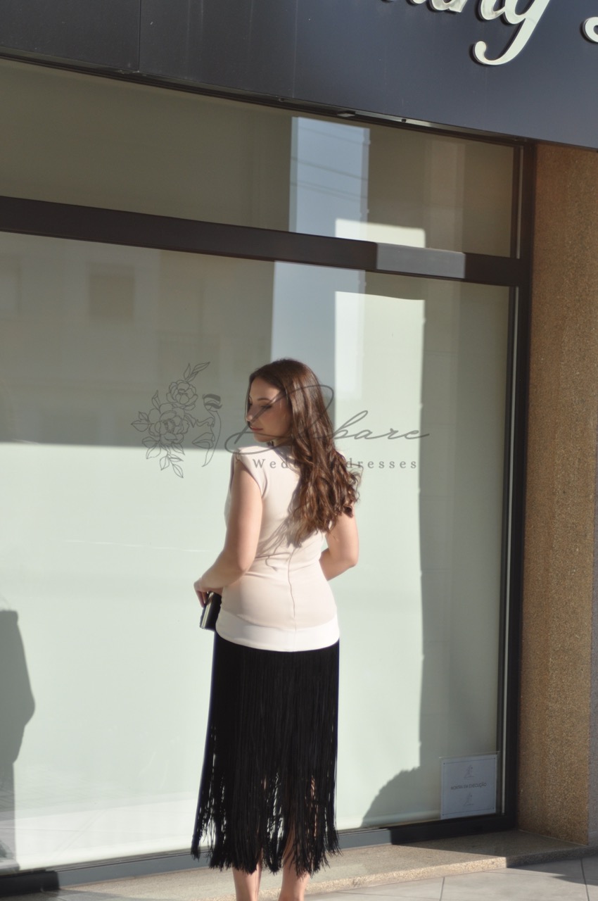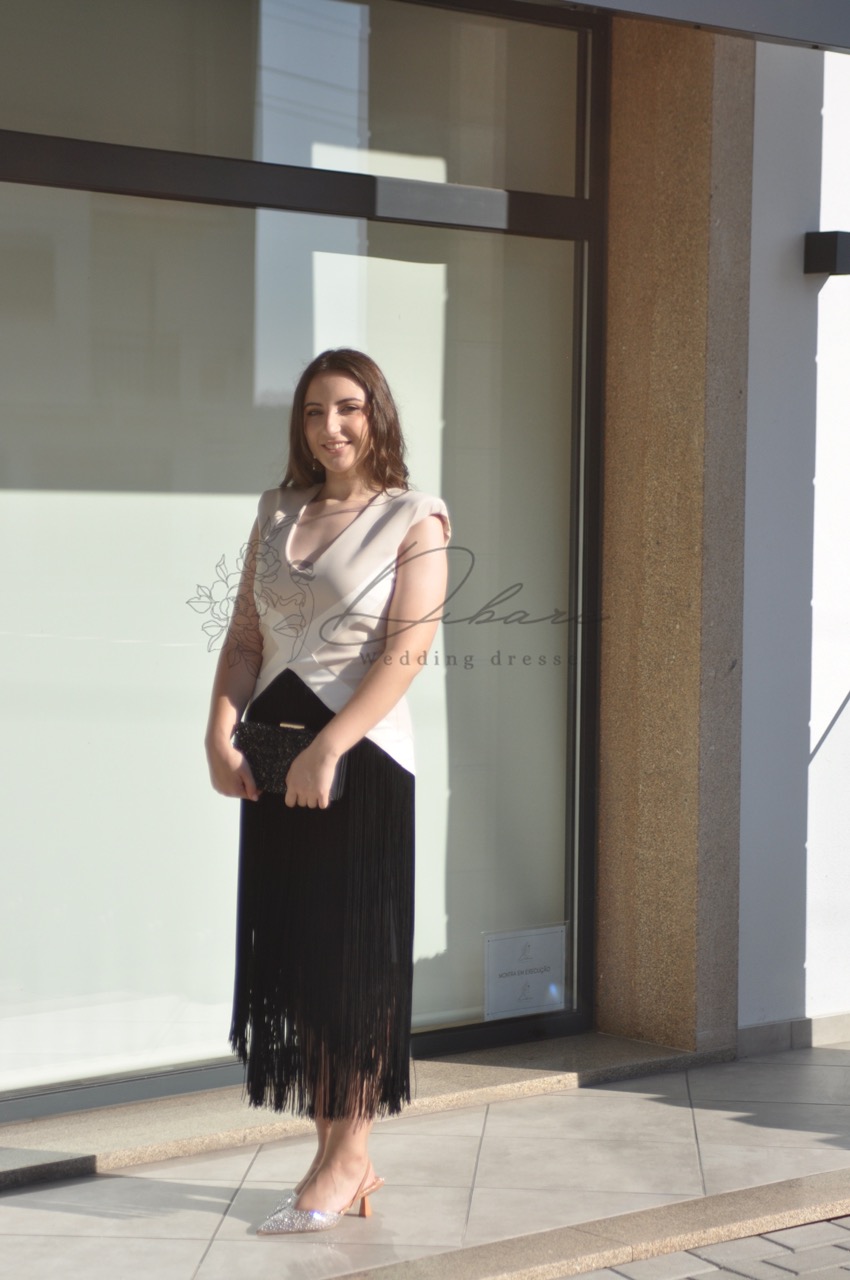 Este vestido deslumbrante é a definição de sofisticação moderna e glamour atemporal, ideal para um evento noturno, uma cerimonia ou uma festa elegante. O design é acentuado por detalhes discretos, como uma delicada corrente ou bordado no decote, que adiciona um brilho subtil e atrai o olhar. O tecido, de caimento suave, abraça a silhueta com elegância. O ponto focal do look é a saia preta de franjas longas. Esta peça incorpora um movimento vibrante e divertido, as franjas, que se estendem até à altura da canela ou tornozelo, balançam a cada passo, criando um efeito visual dinâmico e capturando a essência da moda com uma releitura moderna