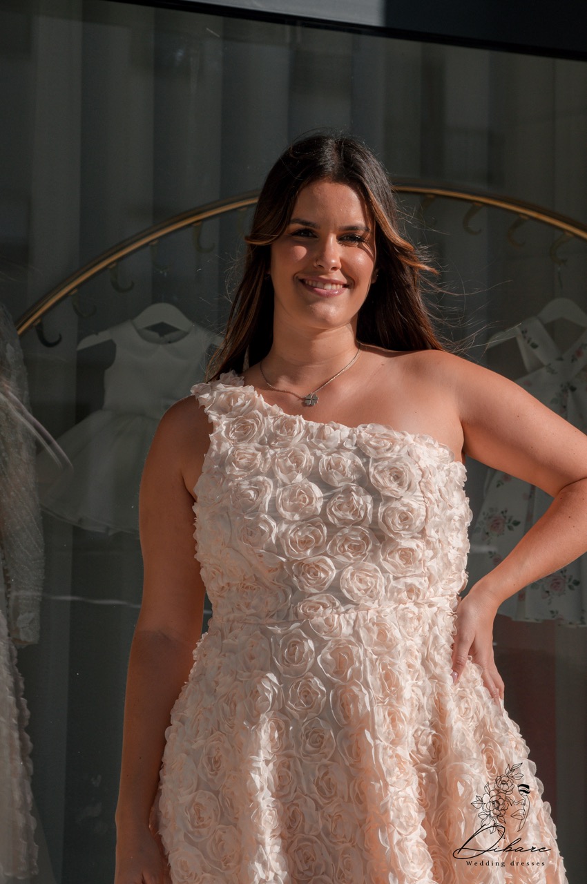 O design assimétrico das alças cria um visual moderno e ousado, enquanto as flores em 3D adicionam textura e um toque romântico ao vestido. As flores, em relevos, proporcionam um efeito visual encantador, tornando-o ideal para ocasiões festivas e eventos especiais. A combinação de elementos dá ao vestido um ar fresco e vibrante, perfeito para quem deseja se destacar com um estilo criativo e feminino.