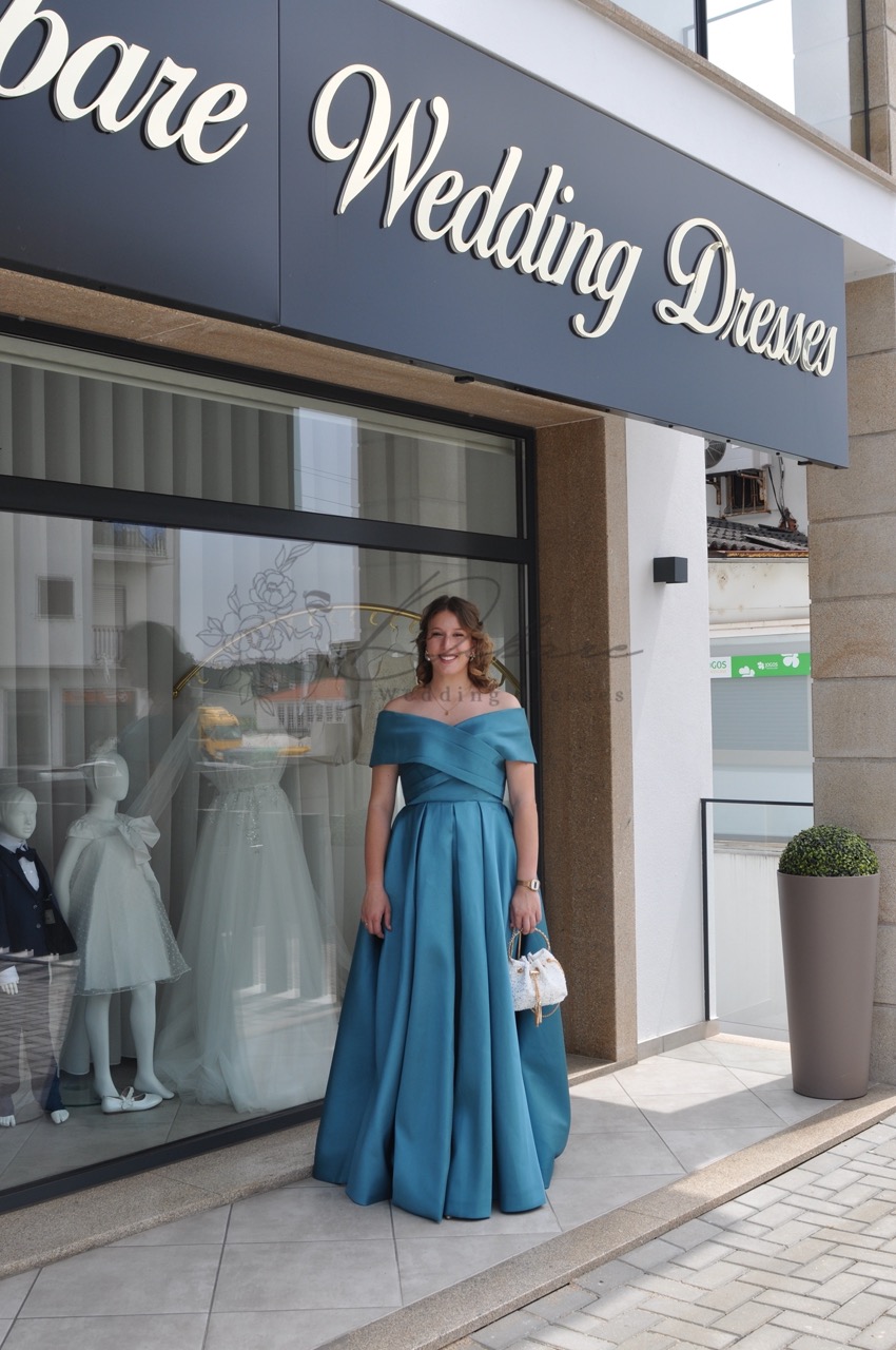 Apresentamos um deslumbrante vestido de gala que exala sofisticação e drama. Confeccionado em um tecido que aparenta ser um cetim ou tafetá estruturado, o vestido tem um brilho luxuoso e um caimento imponente que cria uma silhueta clássica e majestosa. A cor petróleo é rica e vibrante, garantindo que quem o veste se destaque em qualquer evento. O design destaca-se pelo seu decote a barca (ombros à mostra), que é incrivelmente elegante e valoriza o colo e os ombros, conferindo um toque de feminilidade atemporal. A parte superior apresenta pregas ou um drapeado sutil que define a cintura, enquanto a saia é o verdadeiro ponto focal. Com um volume considerável e pregas marcadas, a saia tem um corte amplo, criando um efeito de princesa ou baile. A estrutura do tecido permite que a saia mantenha a sua forma dramática, conferindo movimento e uma presença impactante.