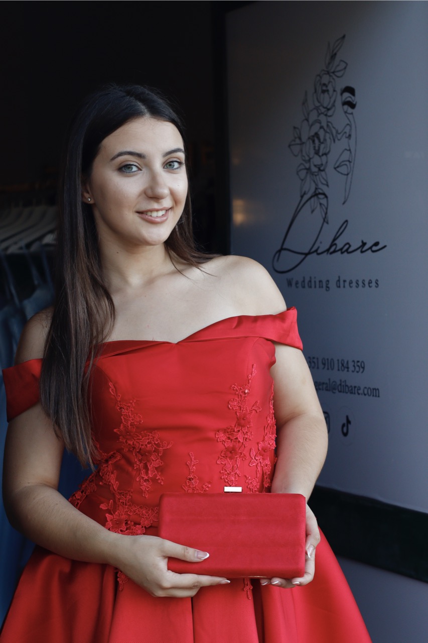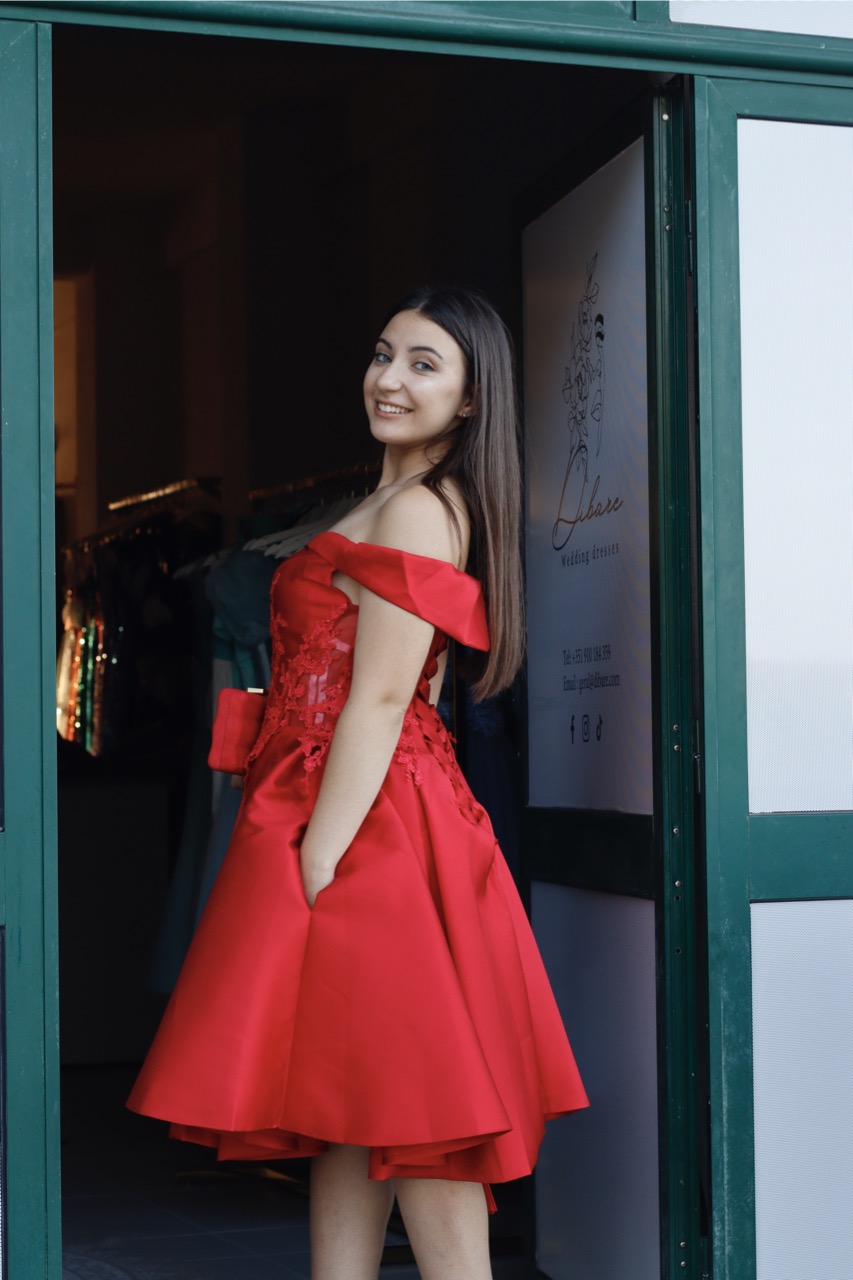 Este vestido em vermelho escarlate é a definição de elegância clássica com um toque contemporâneo. Confeccionado num tecido estruturado com um brilho subtil e luxuoso, esta peça apresenta um decote de ombros caídos, que realça delicadamente a zona do colo e das clavículas, conferindo um ar romântico e intemporal. O tronco é detalhado com bordados florais ton-sur-ton, que acrescentam uma textura rica e artesanal ao design. A saia, com um corte em linha A e volume generoso, cria uma silhueta feminina e dinâmica, perfeita para eventos sociais, galas ou cerimónias.