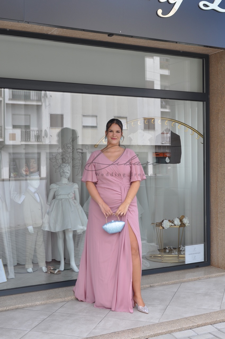 Este elegante vestido de cerimónia em tom rosa velho é a personificação da sofisticação clássica com um toque de modernidade. Desenhado para valorizar a silhueta de forma fluida, o modelo apresenta um decote em V que alonga o tronco, complementado por delicadas mangas em estilo folho, que conferem leveza e uma cobertura elegante aos ombros. O corpo do vestido destaca-se pelo seu efeito cintado e drapeado lateral, que culmina numa ousada racha frontal, permitindo uma maior liberdade de movimentos e um toque de sensualidade discreta. Confeccionado num tecido leve e com excelente caimento.