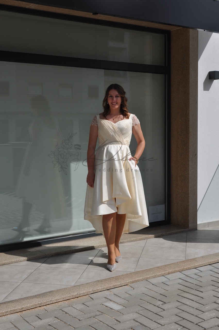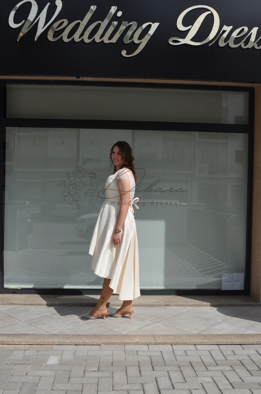 Descubra o nosso deslumbrante vestido, uma peça que combina sofisticação intemporal com um toque moderno. Este modelo é a escolha perfeita para eventos especiais, desde casamentos de dia e festas. Confeccionado num luxuoso cetim de cor bege ou champanhe suave, o vestido apresenta um corte dramático, mais curto à frente para mostrar os sapatos e alongado na parte de trás, conferindo um movimento gracioso e elegante a cada passo. O corpete é uma obra de arte, com um delicado decote em V cruzado, realçado por um sobreposição em renda ou tule finamente bordado, que se estende pelas mangas curtas e transparentes, conferindo um brilho subtil e romântico. A cintura é marcada de forma lisonjeira, possivelmente com um cinto discreto ou drapeado, que define a silhueta. A saia plissada e volumosa cria uma textura rica e um caimento impecável. Um pormenor prático e estiloso é o bolso lateral, que adiciona um toque casual chique e conveniência.