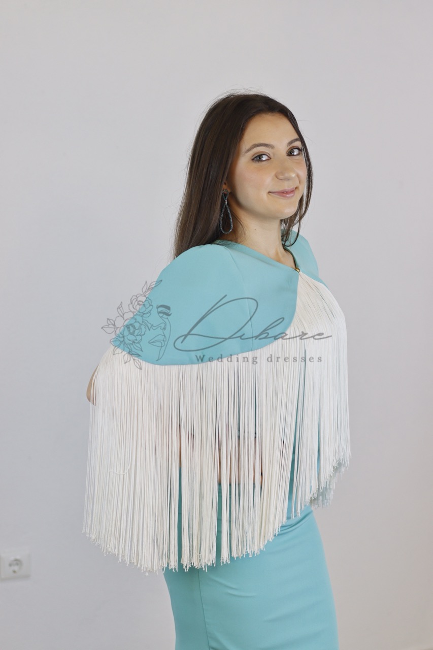 Este conjunto irradia a alegria e a sofisticação da moda flamenca com um toque de frescura e modernidade. A peça central é um deslumbrante Mantô de Manila em franjas brancas, com um comprimento generoso que cria um movimento vibrante e espetacular a cada passo. O contraste é feito com um elegante vestido em um tom turquesa sereno e cativante, que se harmoniza perfeitamente com a luminosidade do branco. O corte do vestuário superior é simples e ajustado, permitindo que o mantô seja o verdadeiro protagonista do look.
