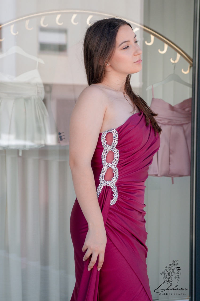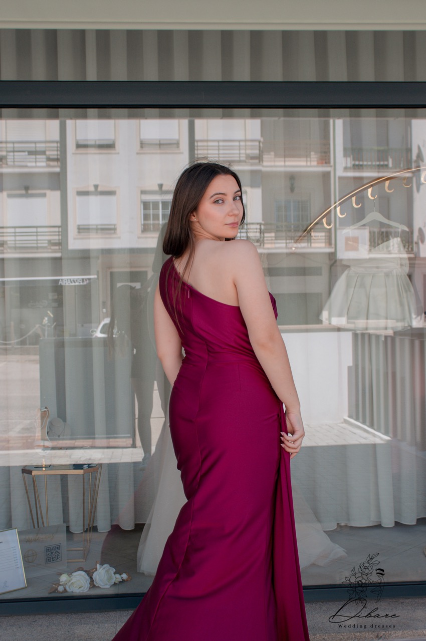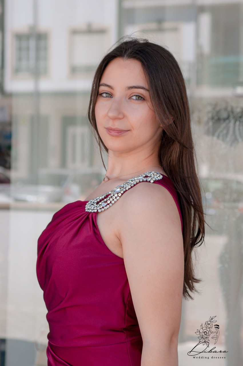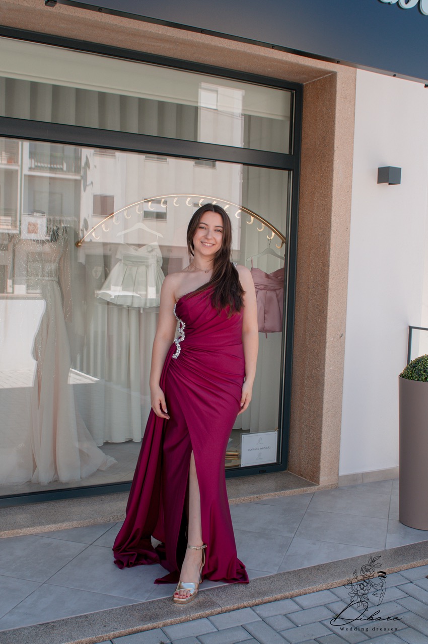 Vestido longo em um sofisticado tom berinjela, projetado para criar um visual elegante e marcante. O vestido é confeccionado em um tecido fluido e luxuoso que proporciona um caimento gracioso e confortável. O destaque do vestido é a pedraria delicadamente aplicada no lado direito, adicionando um toque de brilho e glamour ao design. É ideal para eventos formais ou ocasiões especiais, oferecendo um look refinado e impactante com um toque de sofisticação.