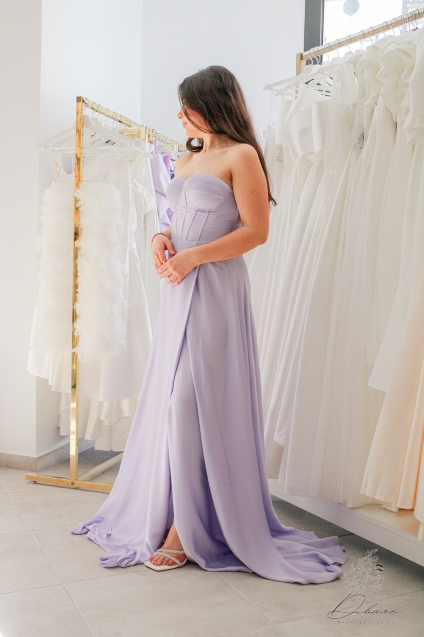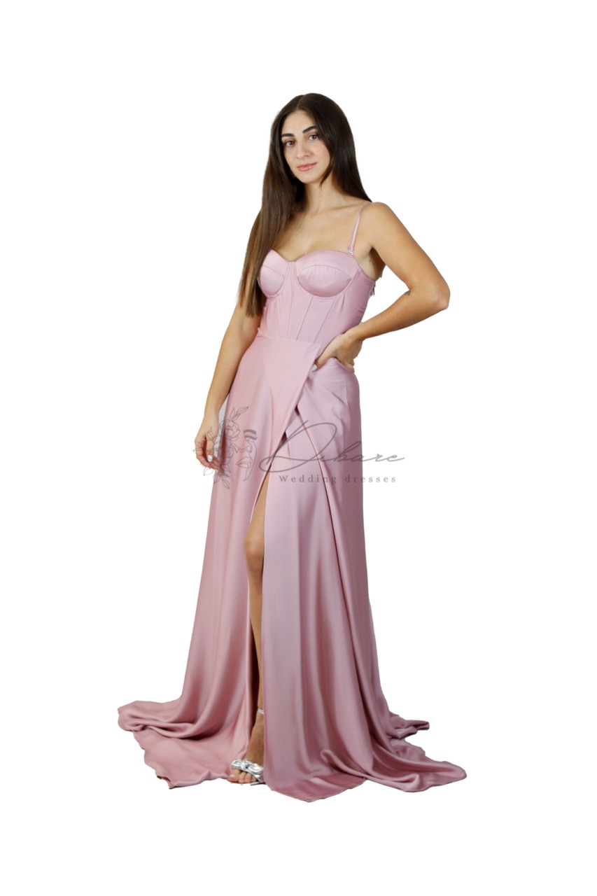 Este é um deslumbrante vestido de gala de silhueta A-line, concebido para capturar todas as atenções em eventos formais ou ocasiões especiais. O modelo destaca-se pela sua estrutura de corpete estilo espartilho, com copas estruturadas e costuras verticais que definem e realçam a silhueta de forma elegante e sofisticada. A saia, de queda fluida e volumosa, apresenta uma abertura lateral profunda que confere um toque de ousadia e modernidade ao design, permitindo um movimento gracioso ao caminhar. O acabamento em cetim de alta qualidade proporciona um brilho subtil e luxuoso, complementado por uma cauda ligeira que acrescenta drama e glamour ao visual.