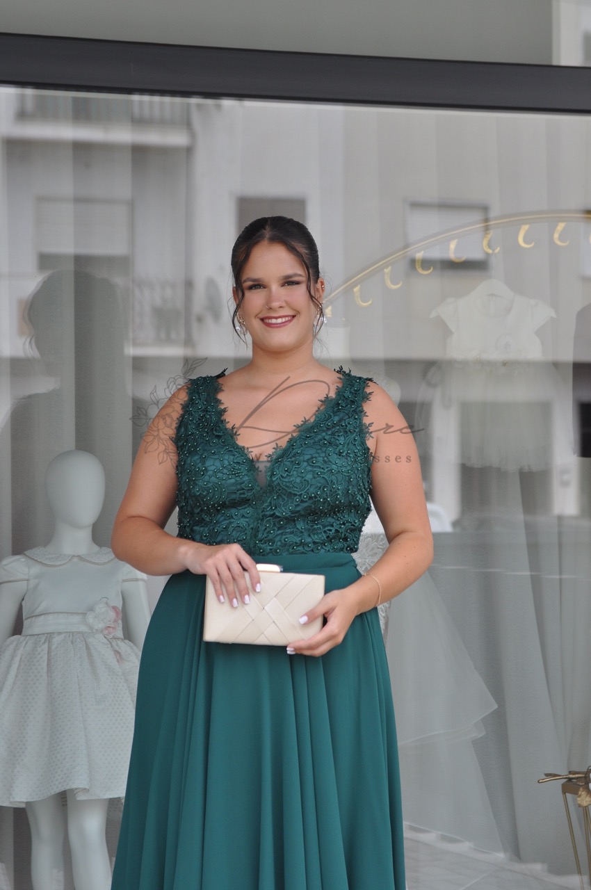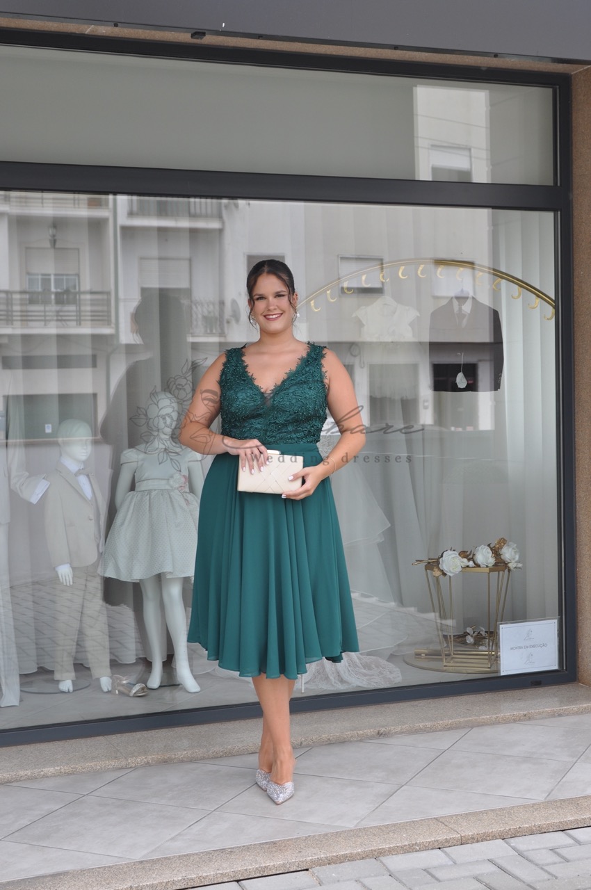 Este deslumbrante vestido de festa midi é a personificação do charme e da sofisticação para ocasiões especiais. Apresentado num profundo e elegante tom verde-esmeralda, o modelo destaca-se pelo contraste harmonioso de texturas entre o corpo e a saia. O corpete em renda trabalhada apresenta um delicado decote em “V”, que realça a silhueta com feminilidade e elegância. Os detalhes minuciosos da renda estendem-se até às alças largas, conferindo um toque romântico e estruturado à peça. A transição para a cintura é definida, dando lugar a uma saia fluida de corte godê, que proporciona um movimento leve e gracioso ao caminhar. Com um comprimento que termina graciosamente abaixo do joelho.