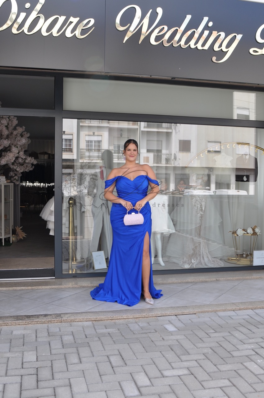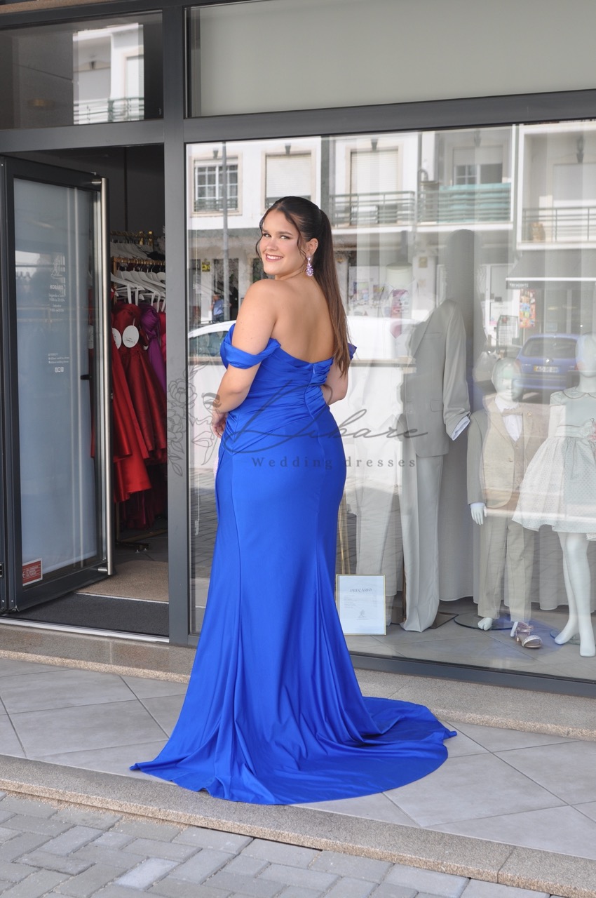 O vestido estilo sereia com decote à barca é uma peça elegante e sofisticada. O decote barco valoriza o colo e os ombros de maneira sutil e refinada, enquanto o corte sereia ajusta-se ao corpo, destacando as curvas e abrindo-se na barra para um toque dramático e glamouroso. A cor azul acrescenta profundidade e modernidade ao look, tornando-o ideal para eventos formais e ocasiões especiais.