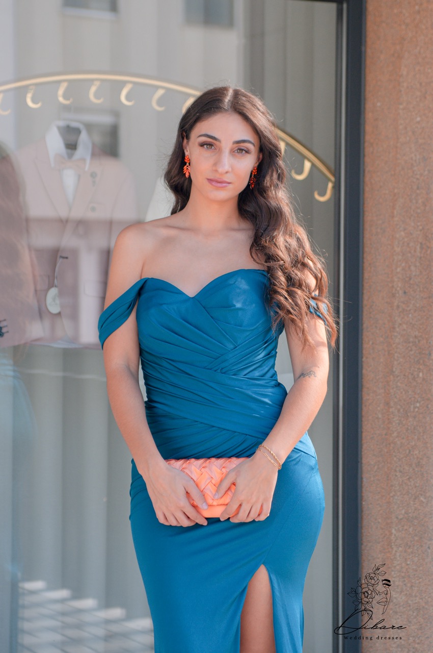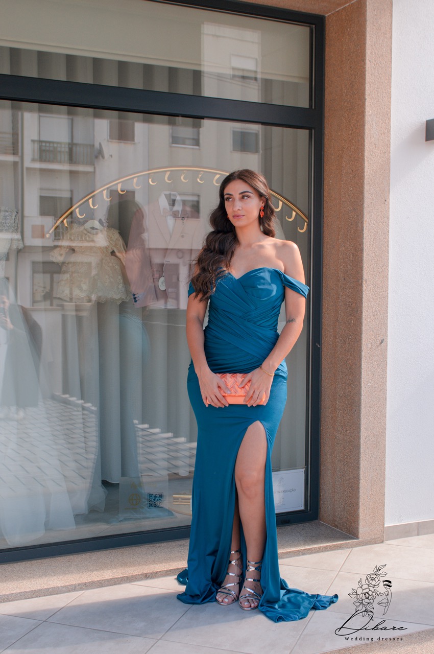 O vestido estilo sereia com decote à barca é uma peça elegante e sofisticada. O decote barco valoriza o colo e os ombros de maneira sutil e refinada, enquanto o corte sereia ajusta-se ao corpo, destacando as curvas e abrindo-se na barra para um toque dramático e glamouroso. A cor petróleo acrescenta profundidade e modernidade ao look, tornando-o ideal para eventos formais e ocasiões especiais.