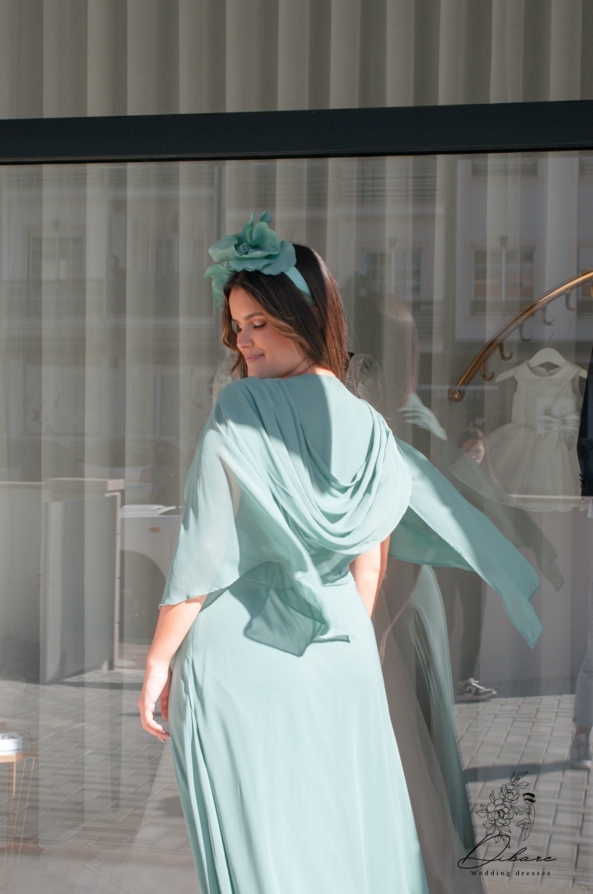 Um vestido longo na cor verde claro, leve e delicado, ideal para eventos ao ar livre ou ocasiões especiais. O tecido fluido cria um movimento suave a cada passo, trazendo uma sensação etérea e romântica. O decote é sutil e gracioso. Na cintura, um cinto fino de brilhantes adiciona um toque de sofisticação, destacando a silhueta de forma elegante e cintilante. A saia esvoaçante completa o visual, criando uma sensação de leveza e movimento, perfeita para quem procura um look feminino e cheio de charme.