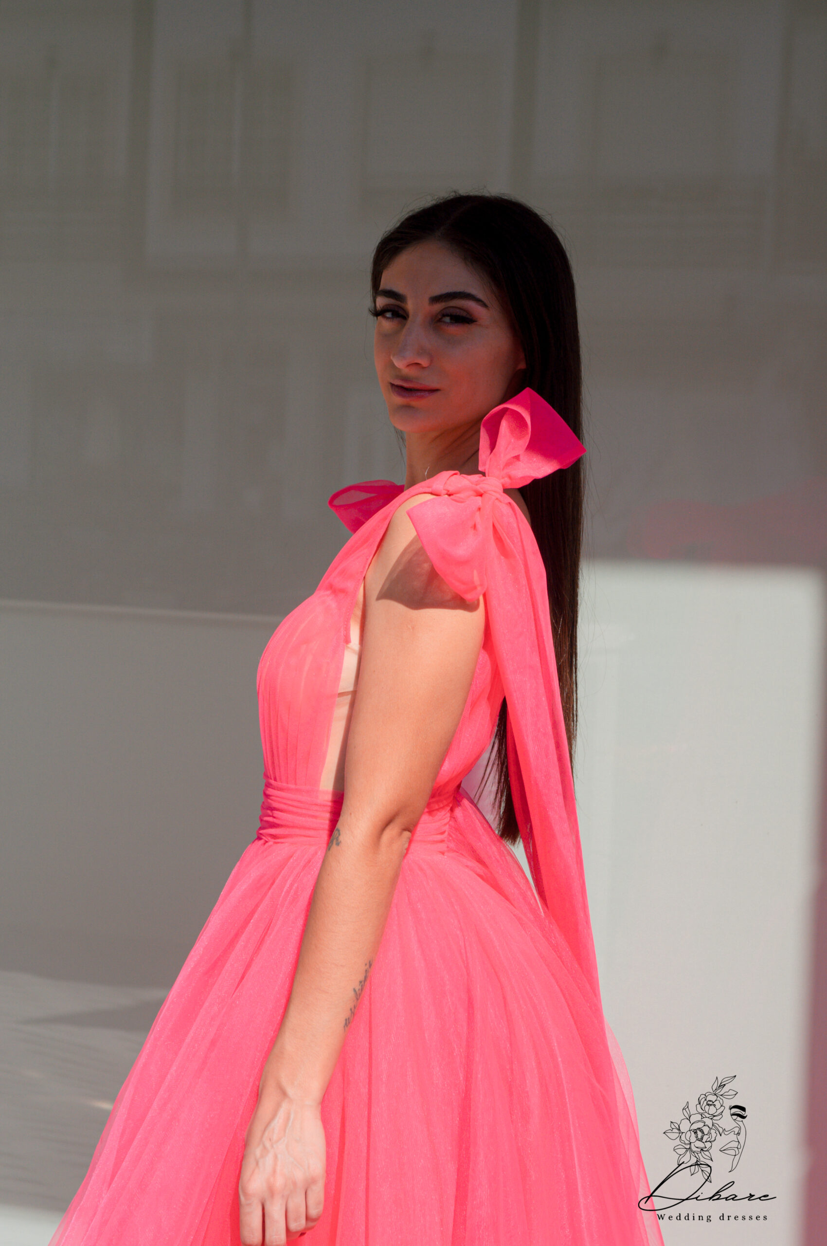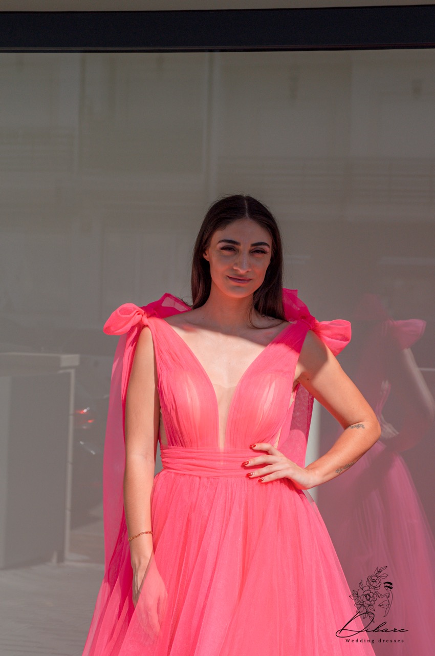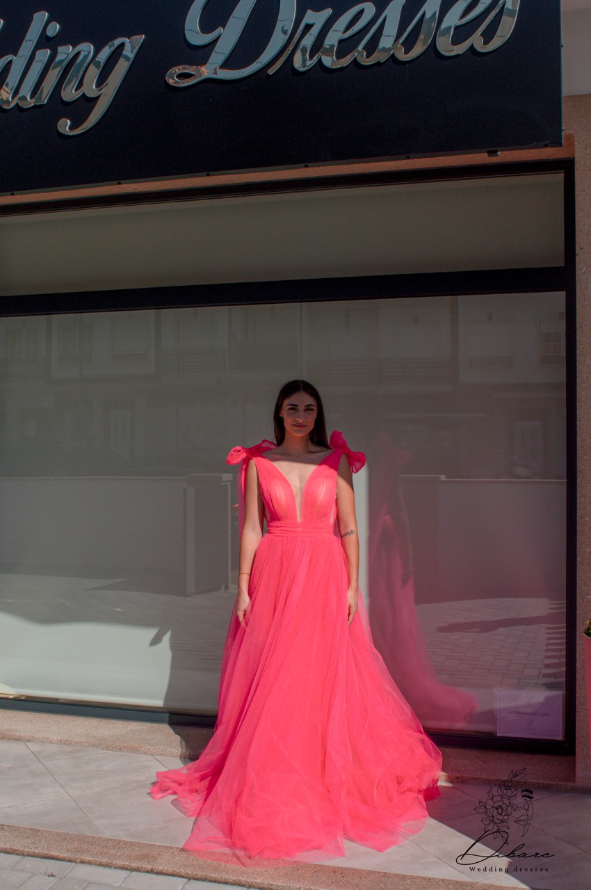 Este deslumbrante vestido de gala em tom rosa vibrante é a escolha ideal para quem procura um visual romântico, moderno e impactante. Confecionado em tule leve e fluido, o modelo apresenta uma saia volumosa de corte em “A” que proporciona um movimento gracioso e elegante a cada passo. O corpete estruturado destaca-se pelo decote em “V” profundo, que alonga a silhueta, e pelo detalhe sofisticado de transparência subtil. O grande diferencial reside nos ombros, adornados com laços generosos e fluídos que conferem um toque de alta-costura e feminilidade absoluta.