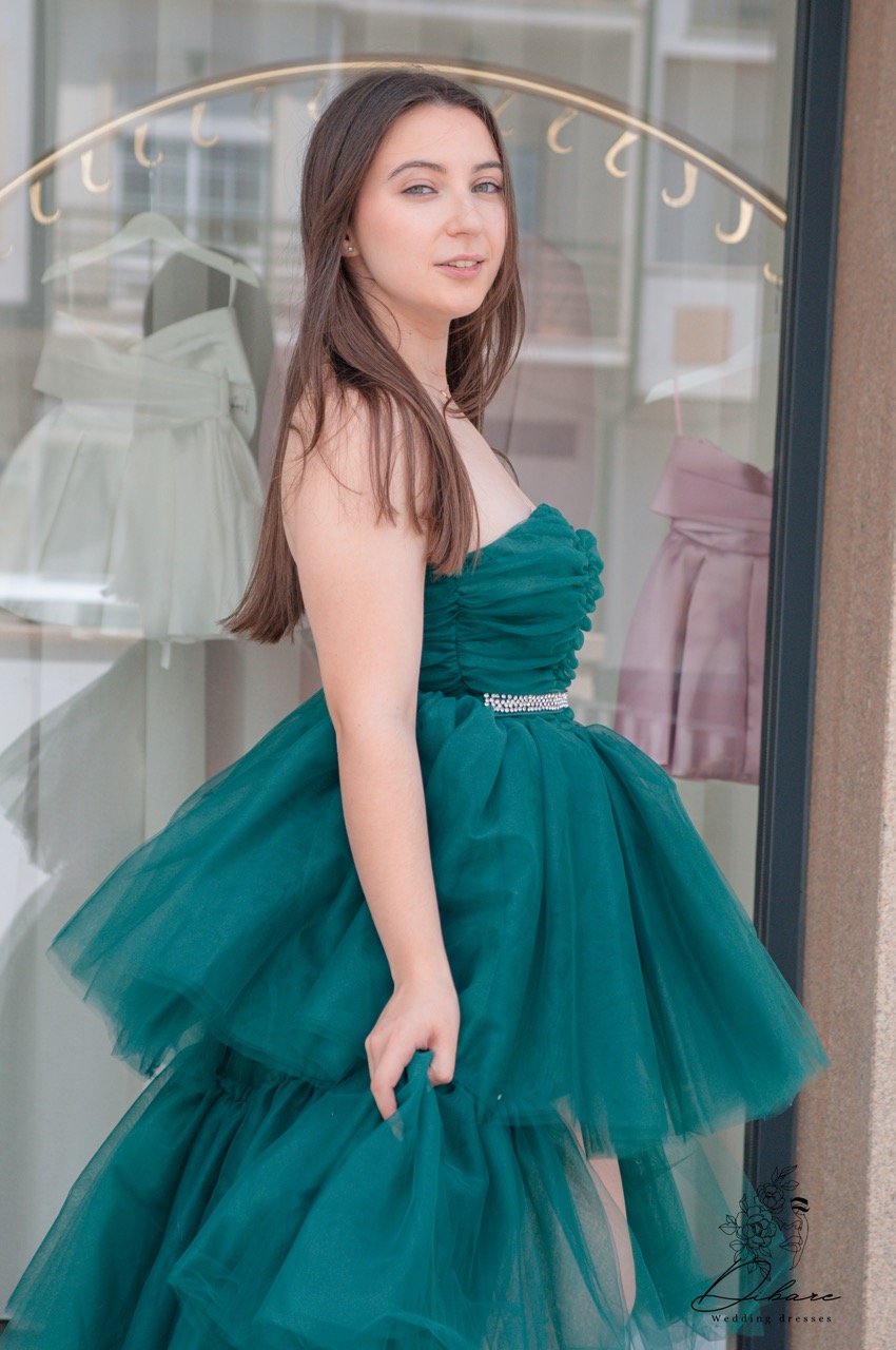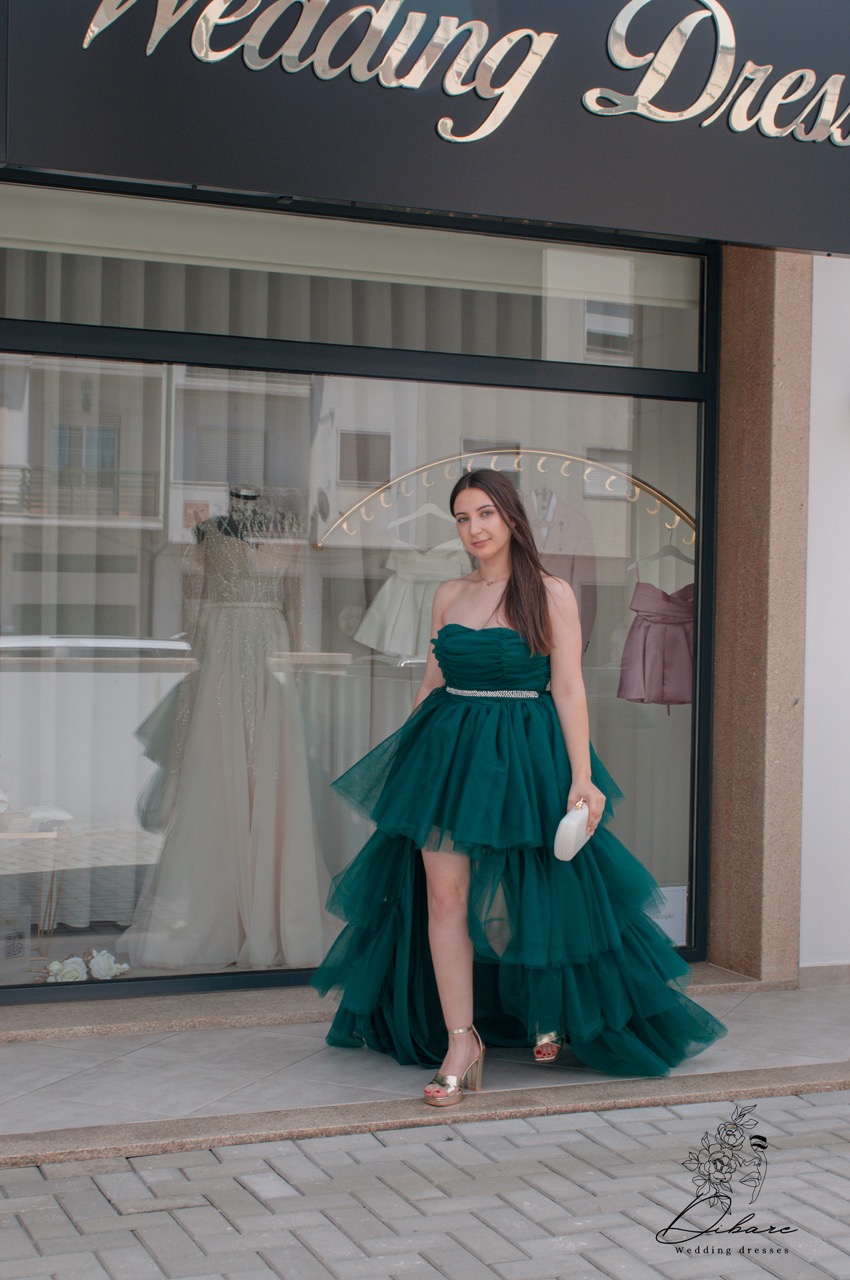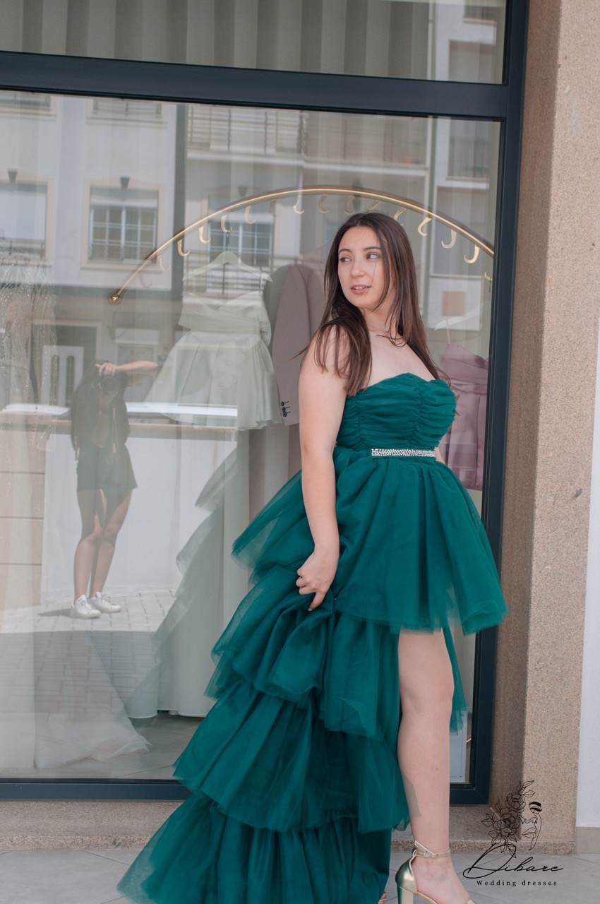 A cor verde é vibrante e refrescante, trazendo uma sensação de vivacidade e classe ao look. O tule é usado para criar uma estrutura leve e arejada, que adiciona uma dimensão adicional ao design. O comprimento do vestido é uma característica distintiva. Na frente, o vestido é mais curto, terminando aproximadamente na altura dos joelhos. Este comprimento mais curto oferece um visual moderno e ousado, permitindo que exiba as pernas e adicione um toque de frescor ao look. Na parte de trás, o vestido é majestoso, com uma cauda que se estende suavemente até o chão. A cauda é feita do mesmo tule fluido e adiciona um toque de drama e elegância, criando um efeito de movimento gracioso e sofisticado enquanto se move. A combinação de comprimento assimétrico, cauda dramática e brilho na cintura cria um look que é ao mesmo tempo glamouroso e único, perfeito para quem procura um estilo sofisticado e memorável.