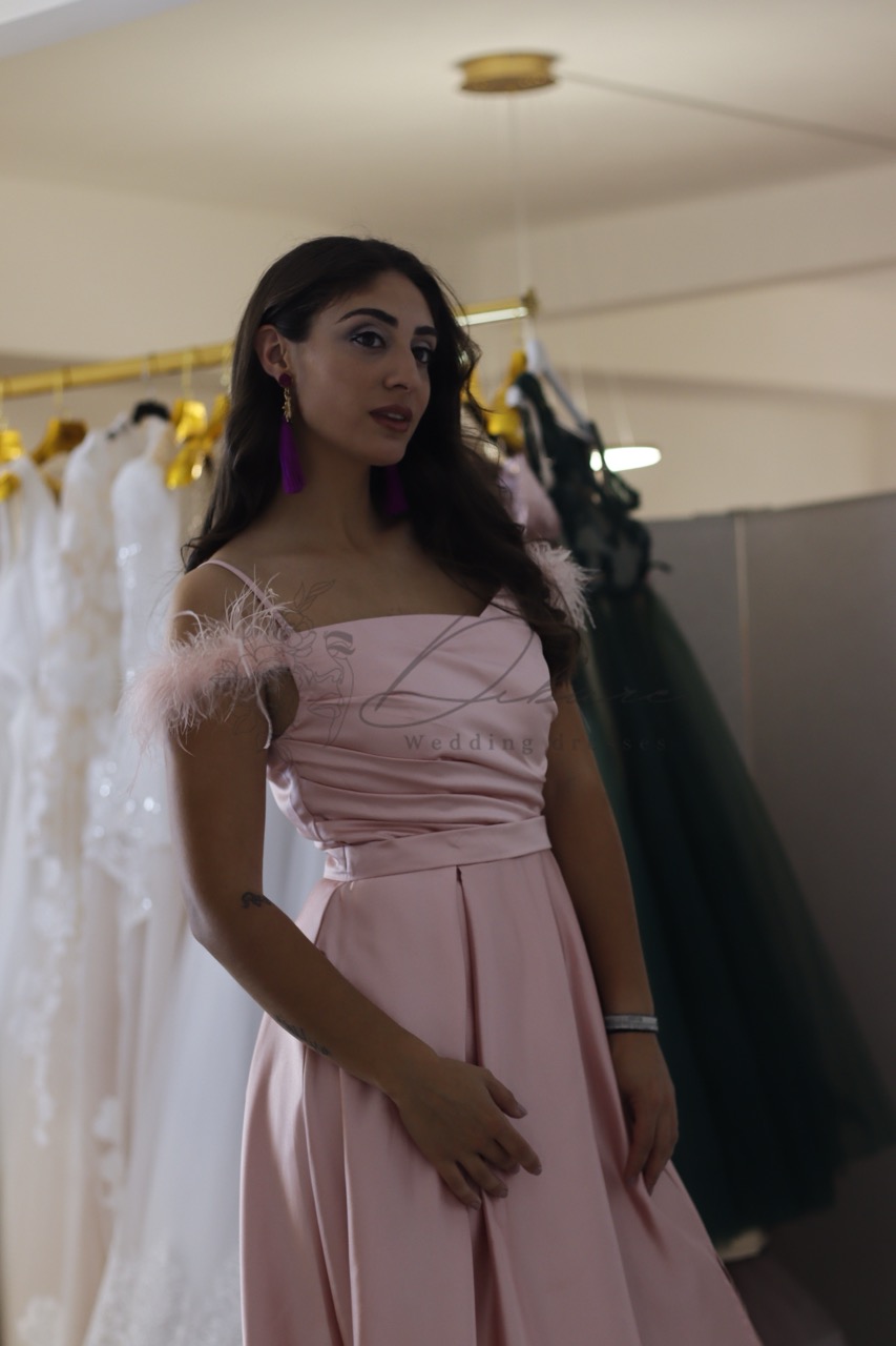 Deslumbre em qualquer evento com este magnífico vestido de festa, uma peça que equilibra perfeitamente o glamour e a delicadeza. Confeccionado num acetinado luxuoso em tom rosa pálido (ou blush), o tecido cai em cascata numa saia volumosa e elegante, prometendo um movimento gracioso. O design do corpete é uma verdadeira obra de arte: apresenta uma silhueta de ombros descobertos, destacada por um detalhe sofisticado de penas leves e etéreas que enquadra um dos ombros com requinte. A sustentação é garantida por alças finas e delicadas, enquanto o corpete apresenta um elegante drapeado assimétrico que realça a cintura de forma lisonjeira. A cor suave e romântica torna-o a escolha ideal para casamentos, bailes de finalistas ou galas, garantindo que se sinta sofisticada e inesquecível. Combine-o com acessórios vibrantes, como a clutch e os brincos em tom magenta ou roxo, para um contraste ousado e moderno, ou mantenha-o clássico com acessórios nude ou prateados.
