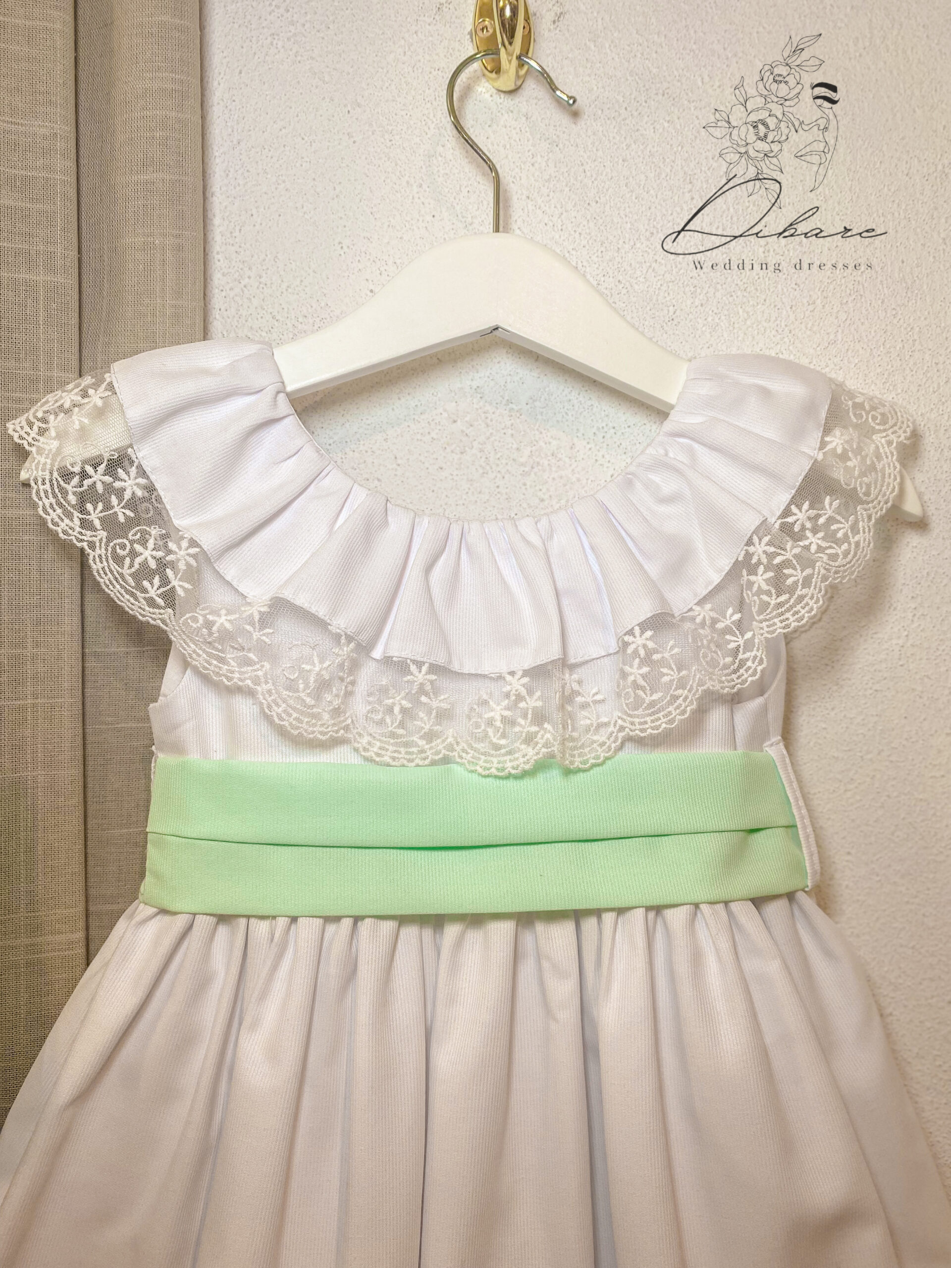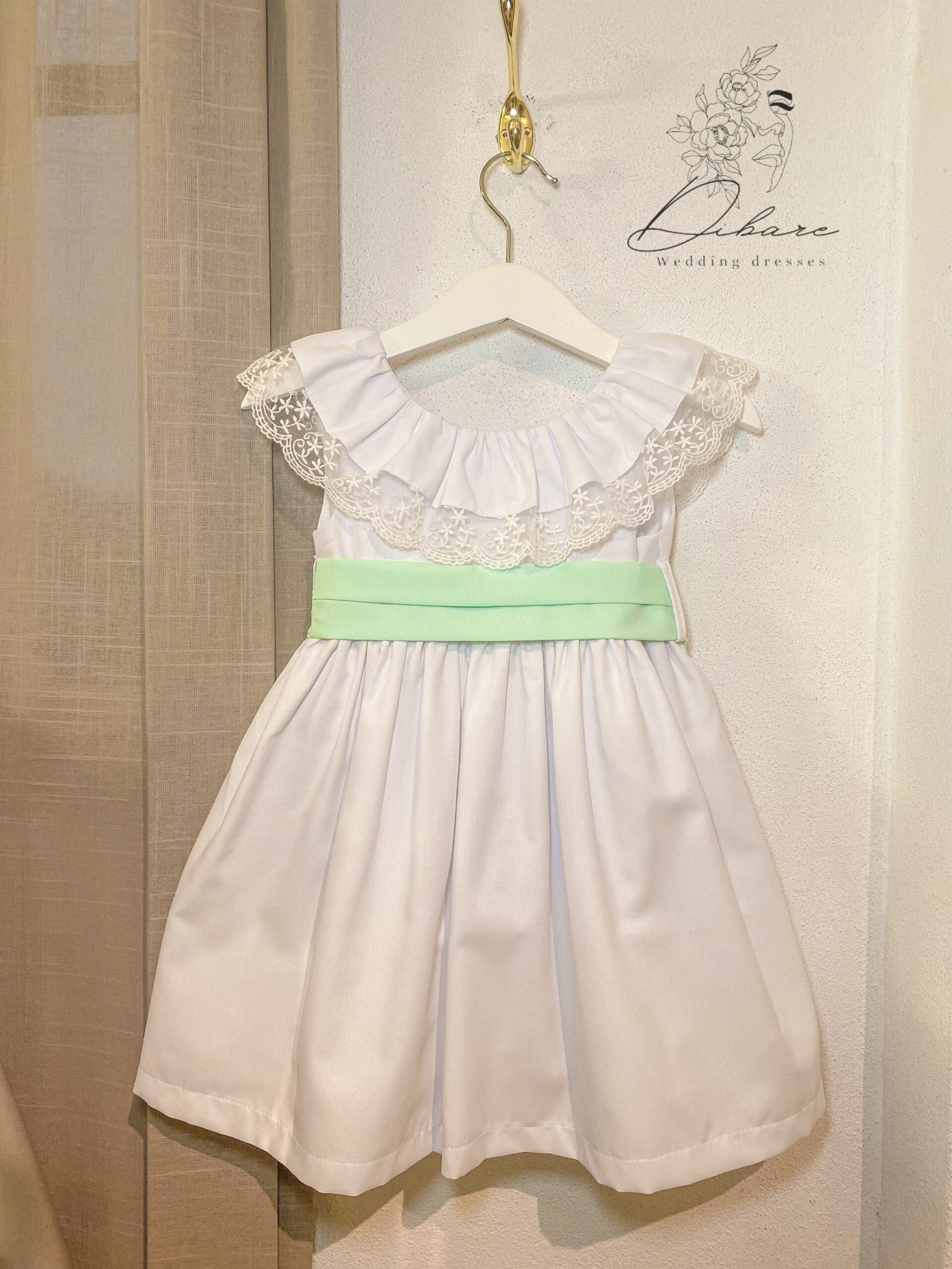 Este é um vestido encantador e sofisticado, ideal para ocasiões especiais como batizados, casamentos ou festas de cerimónia. Com um design clássico e intemporal, a peça destaca-se pelo seu tom branco imaculado e pelo corte estruturado que confere elegância ao visual das crianças. O destaque principal reside no generoso decote em folho, enriquecido com uma delicada renda trabalhada que emoldura os ombros com suavidade. Para criar um contraste fresco e moderno, o vestido inclui uma faixa de cintura em tom verde-água, que define a silhueta e adiciona um toque de cor primaveril à peça.