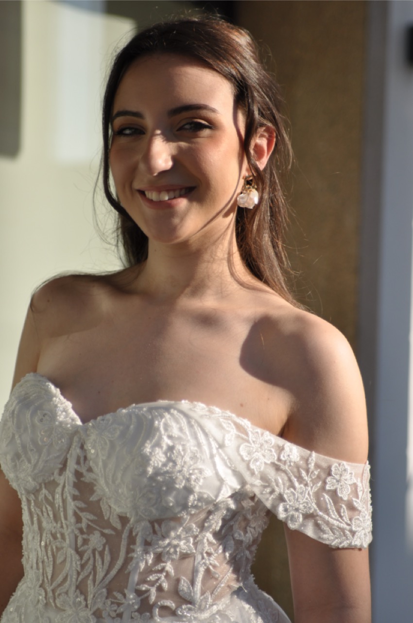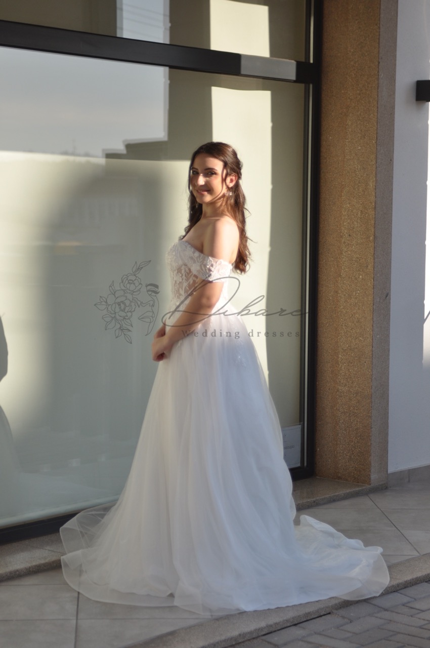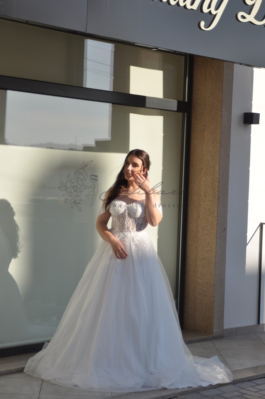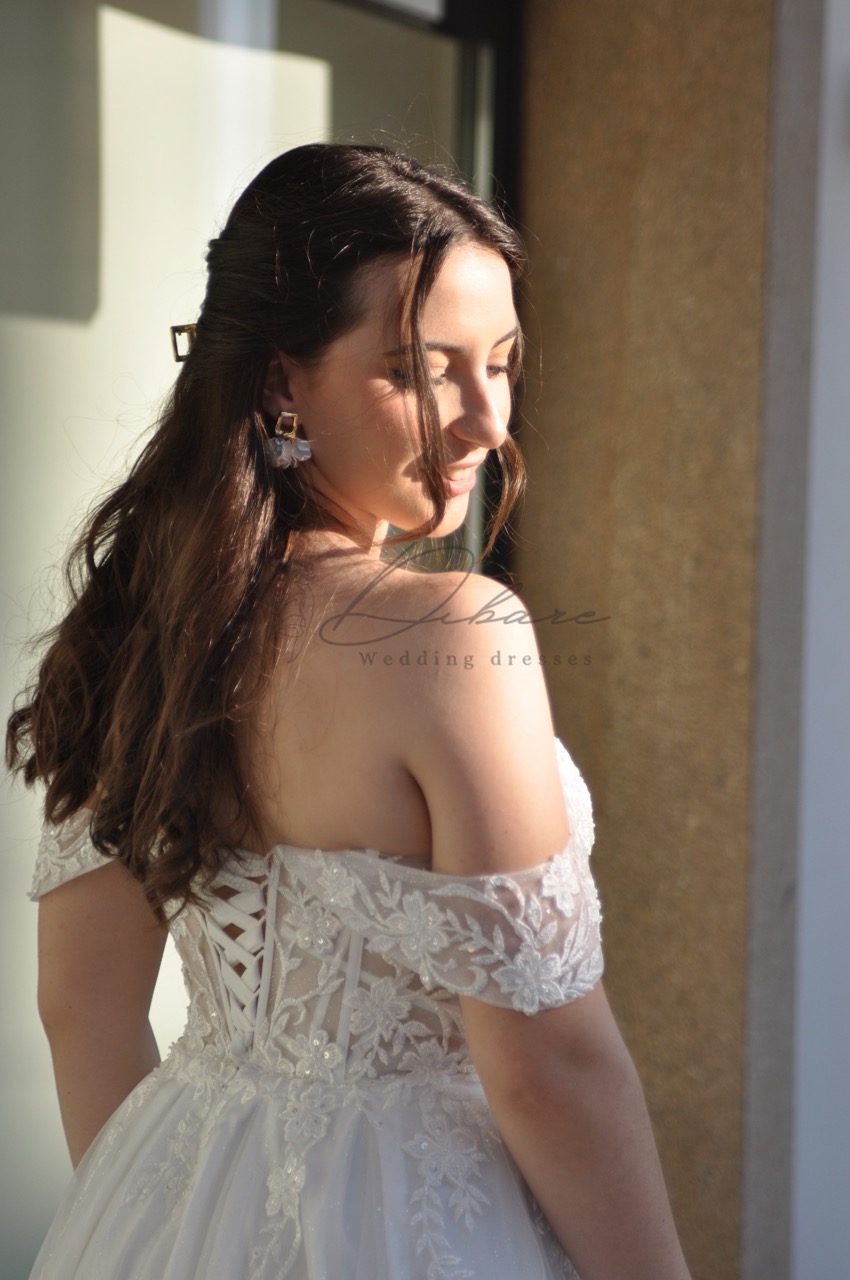 Este esplêndido vestido de noiva personifica o romance e a elegância atemporal, ideal para a noiva que sonha com um visual de conto de fadas. O design apresenta uma saia volumosa em múltiplas camadas de tule branco puro, que confere um movimento etéreo e um volume de princesa, prometendo uma entrada memorável. O corpete, a peça central deste design, é ricamente adornado com detalhes florais 3D e texturas subtis, criando um efeito visual delicado e sofisticado. A linha do decote, estilo ombros descobertos ou sweetheart modificado, é incrivelmente lisonjeira, realçando o colo e a silhueta com graça. A leveza do tecido e a atenção aos detalhes do corpete garantem que a noiva se sinta confortável e deslumbrante em cada momento do seu dia especial. Com um equilíbrio perfeito entre o glamour da saia e a delicadeza artesanal do corpete.