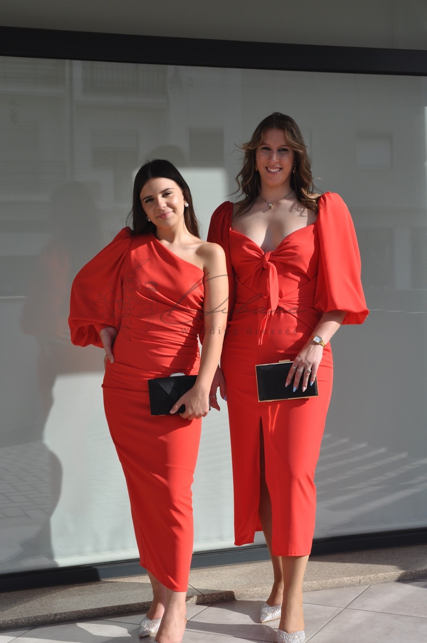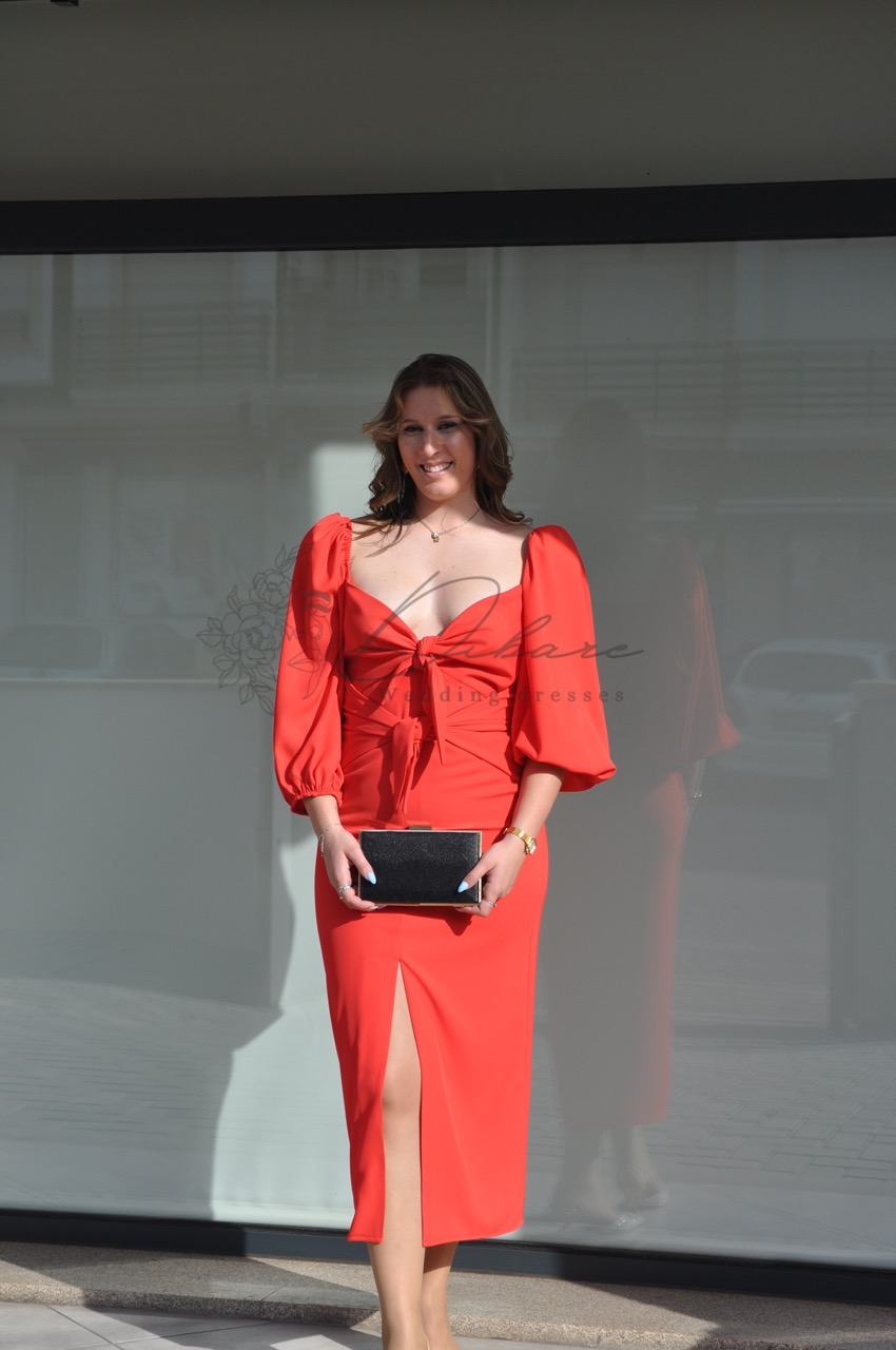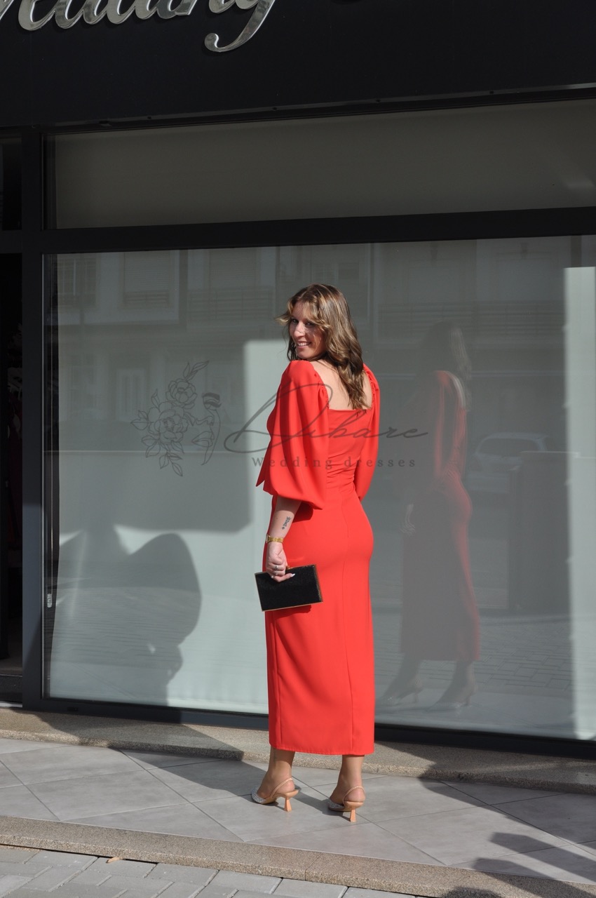 Este deslumbrante vestido midi na cor vermelho vibrante é a escolha perfeita para quem procura aliar romantismo e sofisticação num visual de festa. A peça destaca-se pelo seu design feminino, apresentando um decote em coração realçado por um detalhe de nó frontal, que cria um efeito visual delicado e moderno. As mangas abaloadas de comprimento três quartos conferem um toque de elegância clássica e volume estruturado, equilibrando harmoniosamente a silhueta ajustada do corpo. A saia, de corte direito, prolonga-se até abaixo do joelho e conta com uma fenda central frontal, que não só facilita o movimento, como acrescenta uma nota de sensualidade discreta ao conjunto. Confeccionado num tecido com excelente caimento.