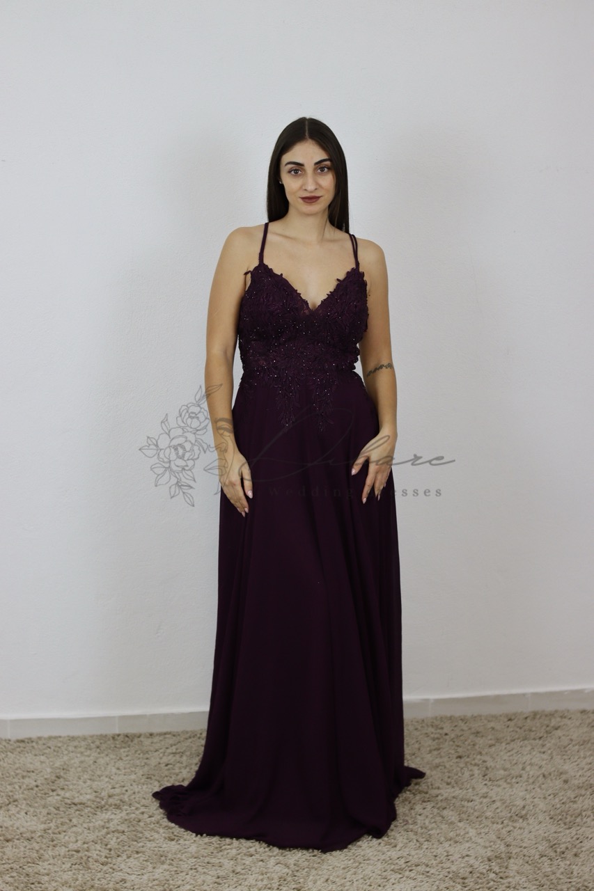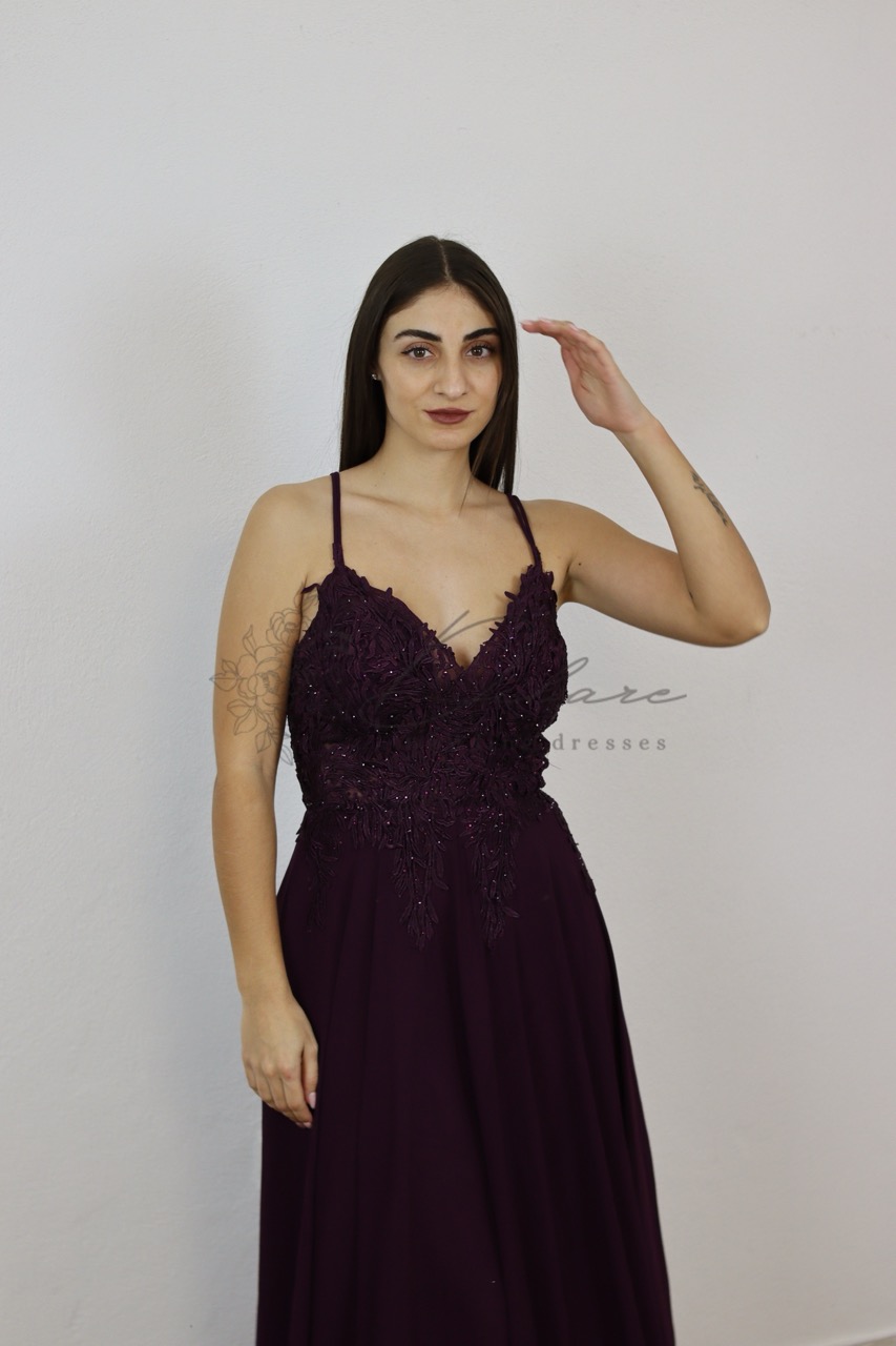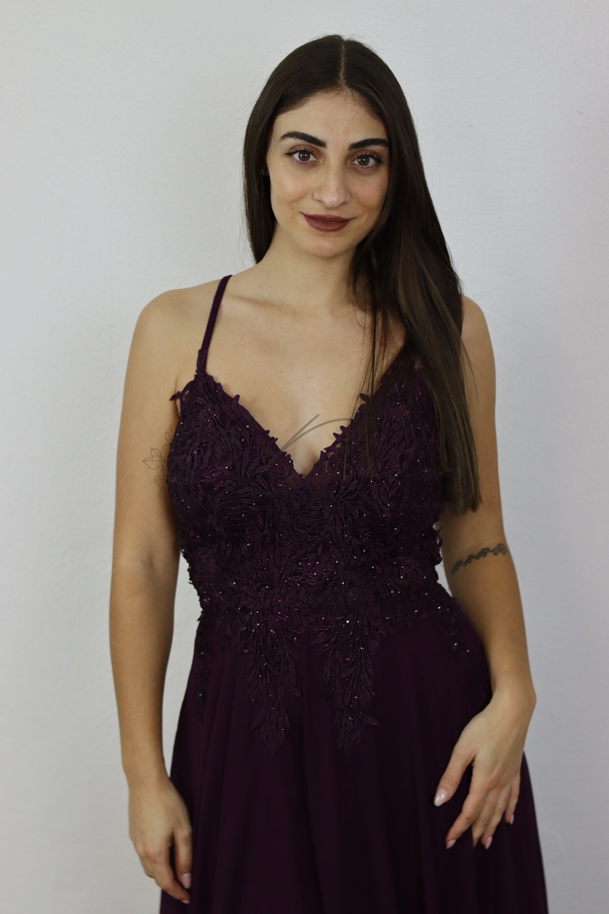 Abrace a feminilidade e o mistério com este sofisticado vestido longo de gala, desenhado para celebrações que exigem um toque de requinte e sedução. Apresentado numa tonalidade vinho escuro profunda (ou roxo), este modelo conjuga texturas para criar um look verdadeiramente memorável. O destaque encontra-se no corpete delicado, que apresenta um design elegante de decote em V e é inteiramente adornado com renda trabalhada com detalhes que se estendem até à cintura. As finas alças duplas, que se cruzam nas costas, acrescentam um pormenor moderno e estrutural. A parte inferior flui numa saia de crepe suave e de corte direito, que desliza graciosamente até ao chão, garantindo um caimento impecável e uma sensação de leveza.