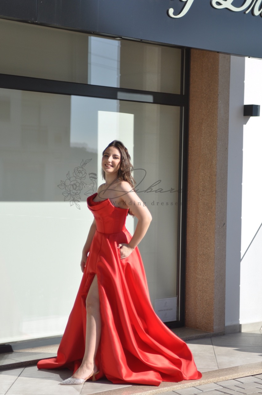 Este deslumbrante vestido de noite, na cor vermelho-vivo, é a personificação da elegância e da confiança, desenhado para fazer uma entrada memorável em qualquer evento de gala, baile ou cerimónia. O design apresenta um corpete estilo bustier, estruturado e com pregas subtis que realçam o decote e a silhueta. A ausência de alças confere um toque moderno e sofisticado, ideal para exibir os ombros e o pescoço. A saia é fluida e volumosa, confeccionada num tecido acetinado que capta a luz, criando um brilho luxuoso e um movimento dramático a cada passo. O corte em A favorece a maioria das figuras, e o ponto focal é a fenda alta na perna, que adiciona um elemento ousado e sensual, permitindo um vislumbre elegante.