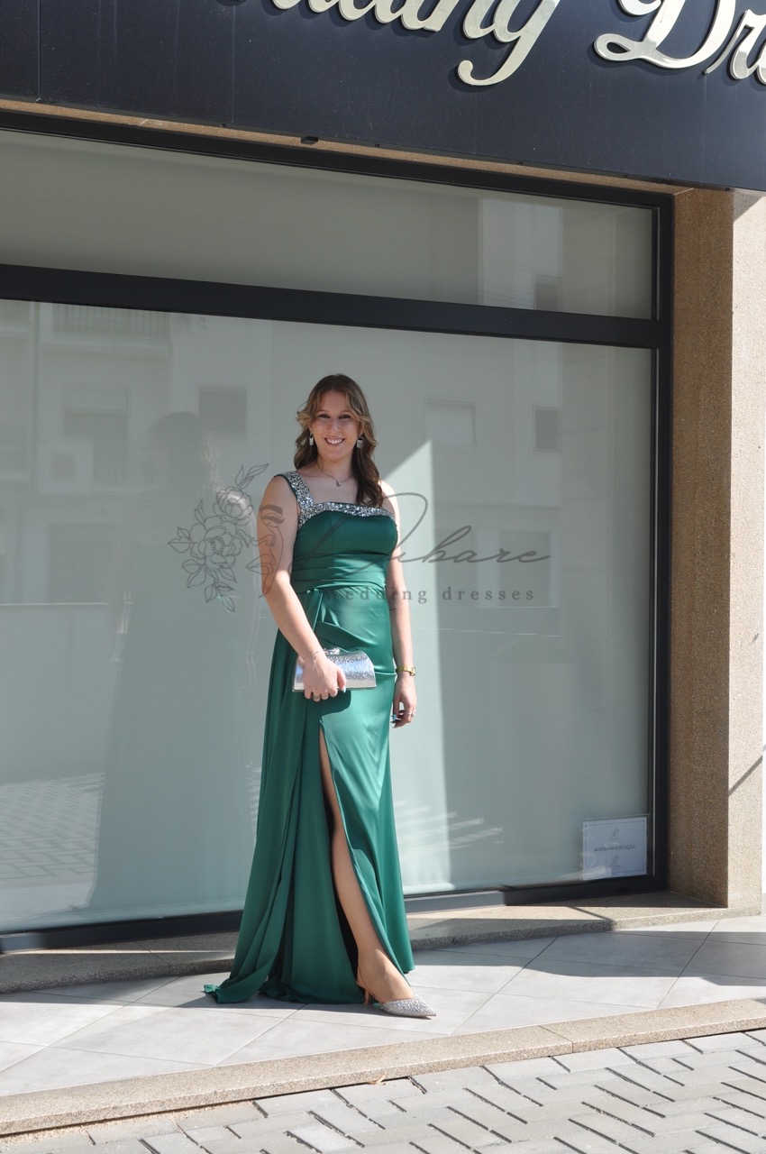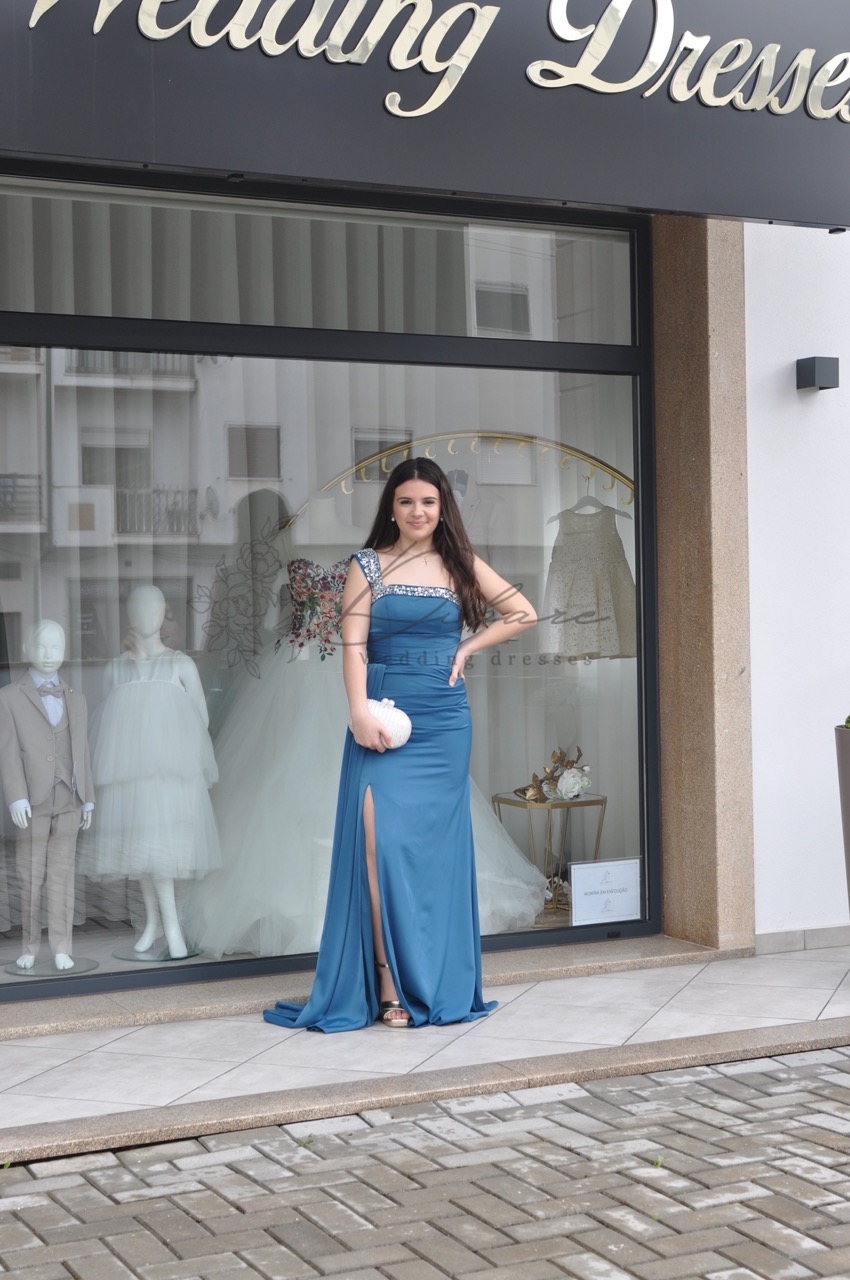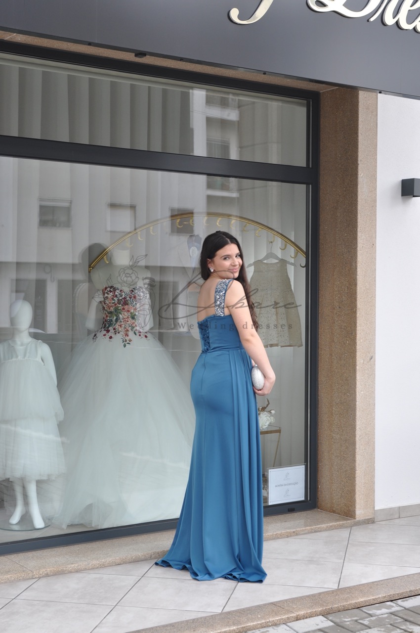 Este deslumbrante vestido de noite, num rico tom azul-petróleo, combina sofisticação clássica com um toque de modernidade arrojada. O corpete é meticulosamente desenhado com um decote cai-cai elegante, realçado por detalhes de alças finas e intrincadas que se cruzam sobre os ombros, conferindo um brilho subtil e uma estrutura delicada. A silhueta é justa ao corpo (sereia), abraçando as curvas de forma lisonjeira, enquanto o tecido de alta qualidade flui elegantemente até ao chão. Um dos pontos focais do vestido é a fenda alta na perna, que adiciona movimento, sensualidade e permite um vislumbre das sandálias, tornando-o ideal para dançar e marcar presença.