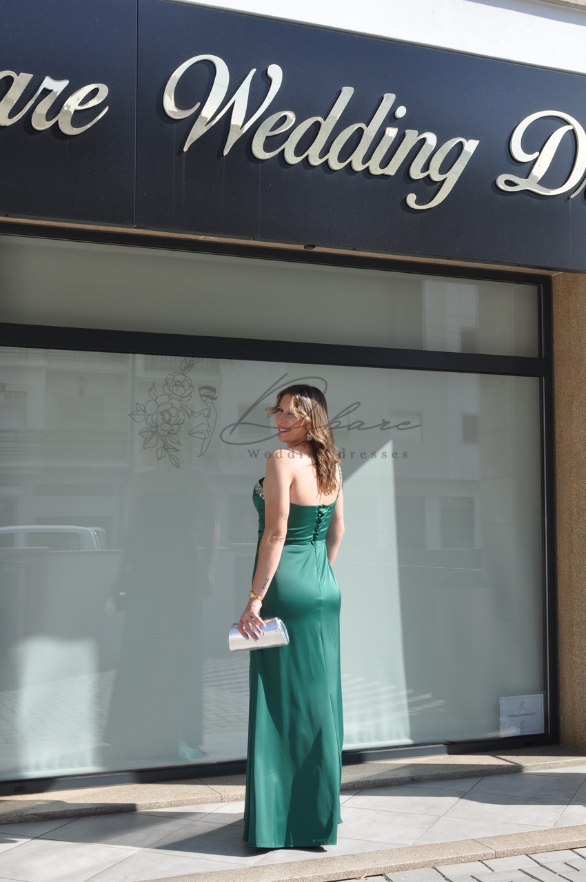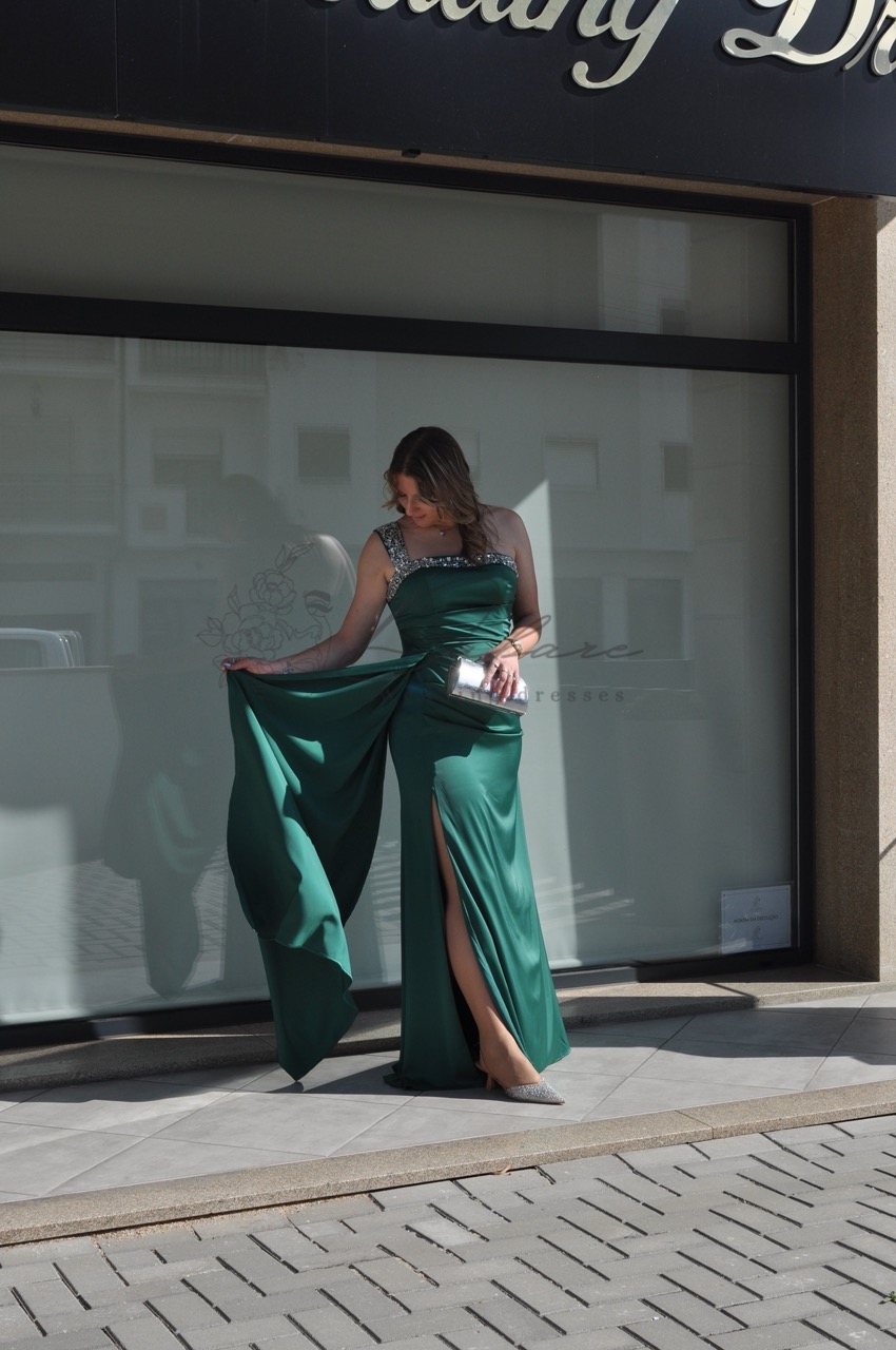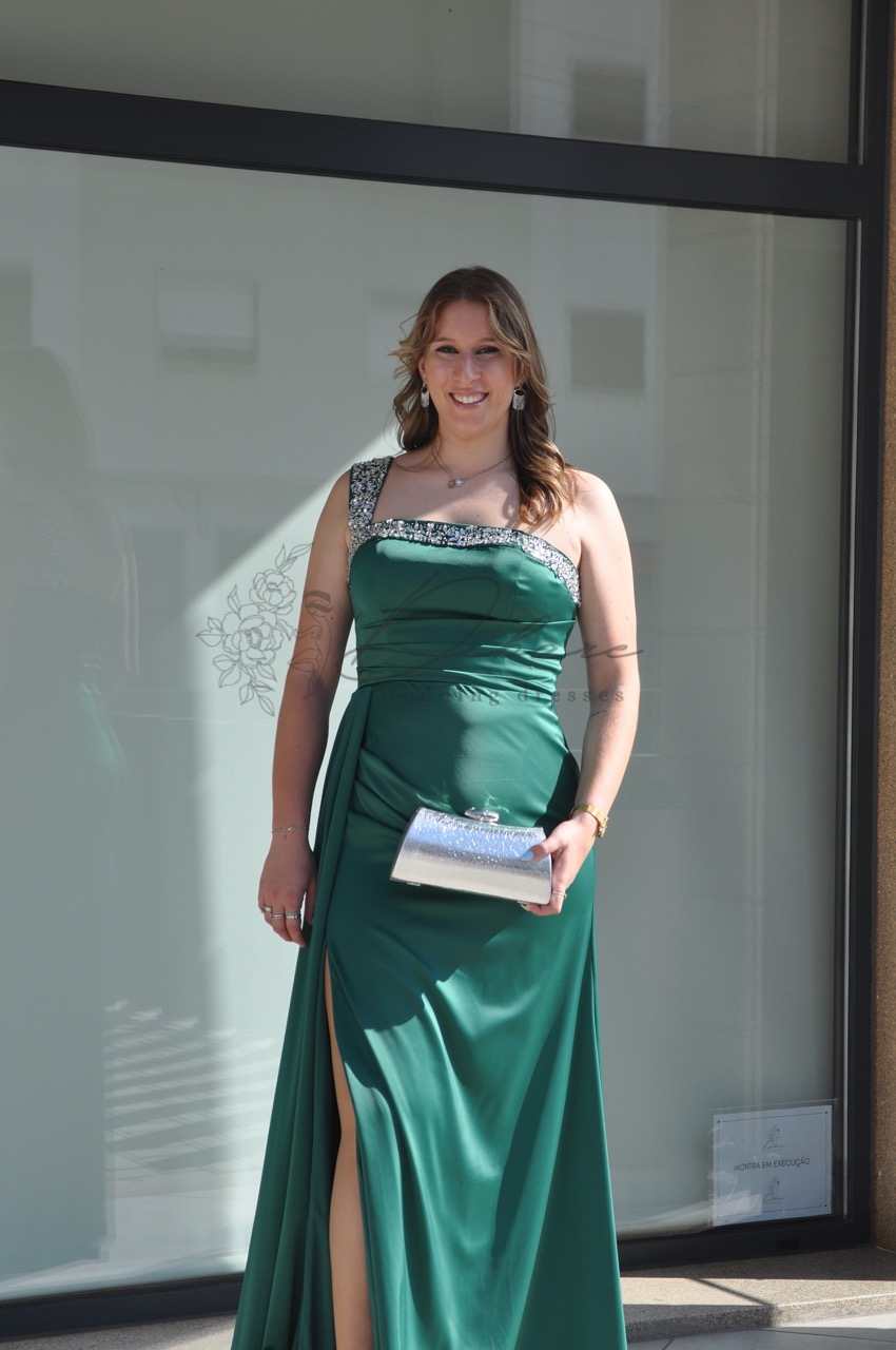 Este deslumbrante vestido de noite, num rico tom azul-petróleo, combina sofisticação clássica com um toque de modernidade arrojada. O corpete é meticulosamente desenhado com um decote cai-cai elegante, realçado por detalhes de alças finas e intrincadas que se cruzam sobre os ombros, conferindo um brilho subtil e uma estrutura delicada. A silhueta é justa ao corpo (sereia), abraçando as curvas de forma lisonjeira, enquanto o tecido de alta qualidade flui elegantemente até ao chão. Um dos pontos focais do vestido é a fenda alta na perna, que adiciona movimento, sensualidade e permite um vislumbre das sandálias, tornando-o ideal para dançar e marcar presença.